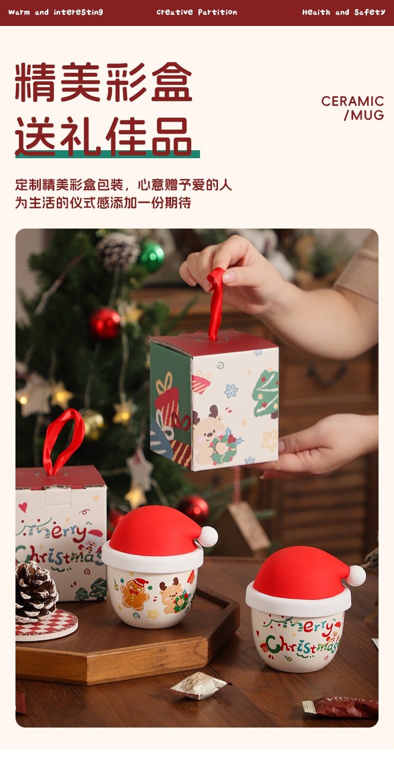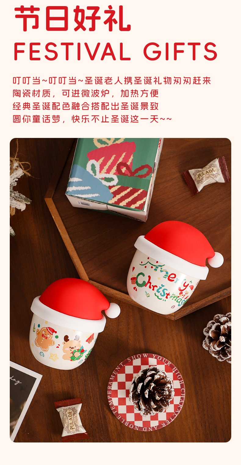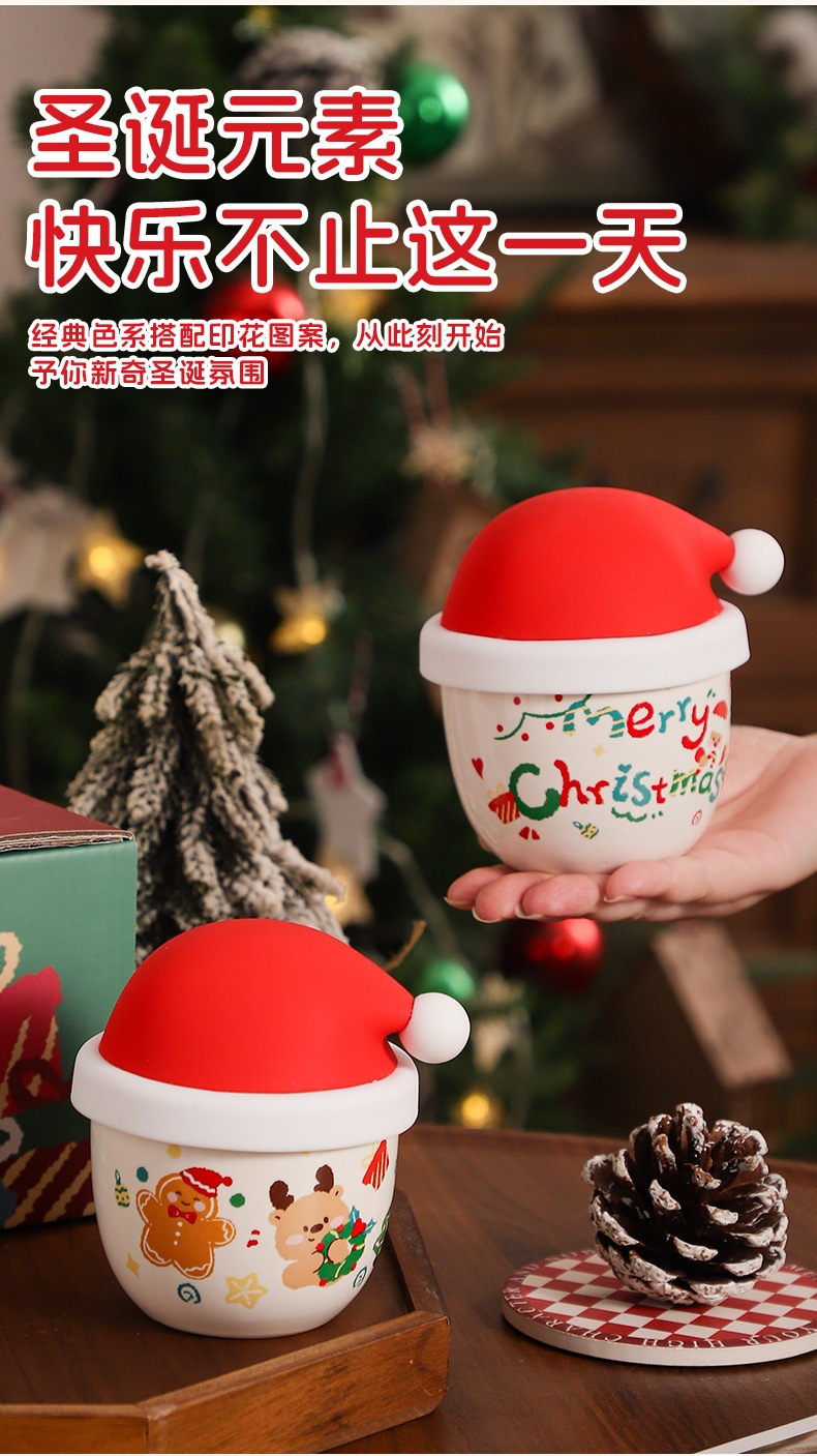 圣诞节日主题手握杯;陶瓷烧制、硅胶防尘盖;含盖,专属彩盒