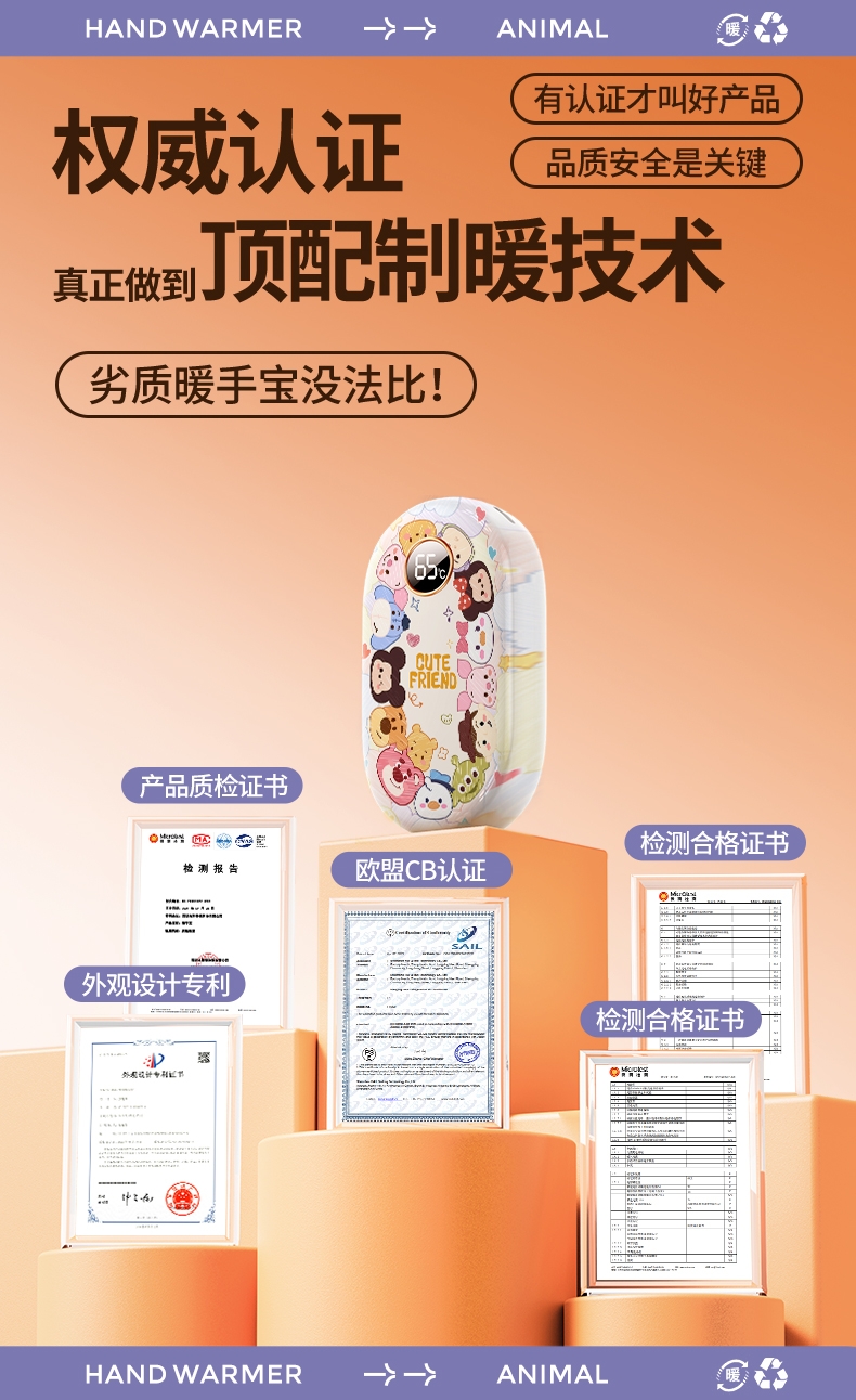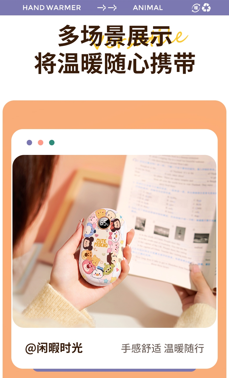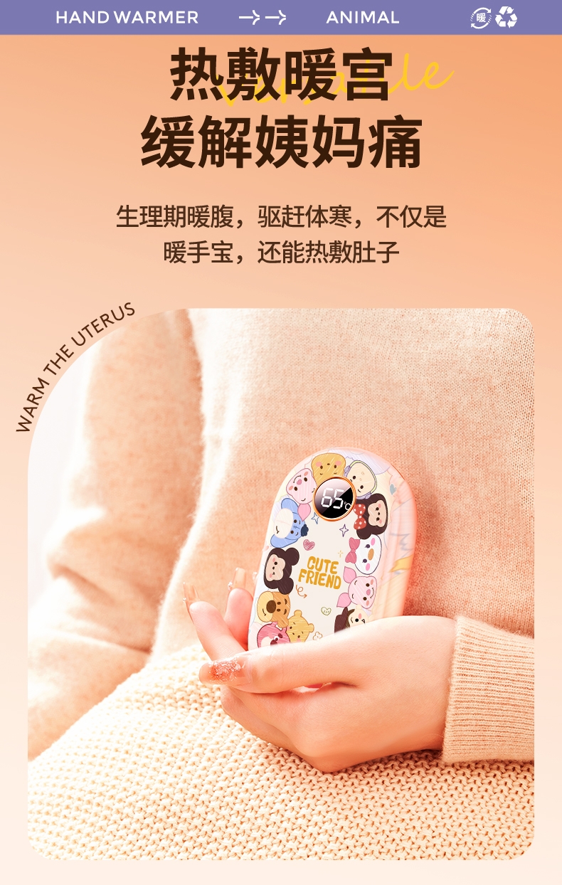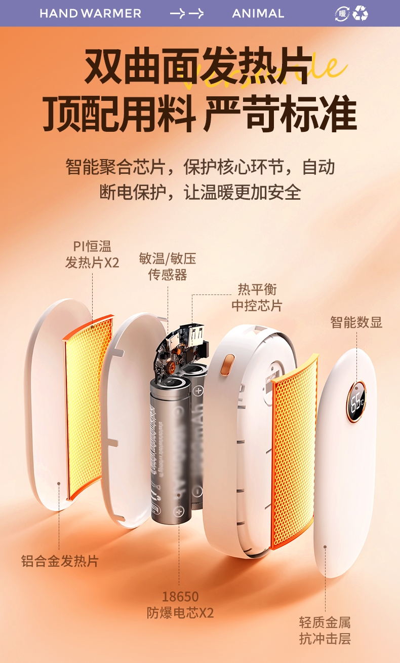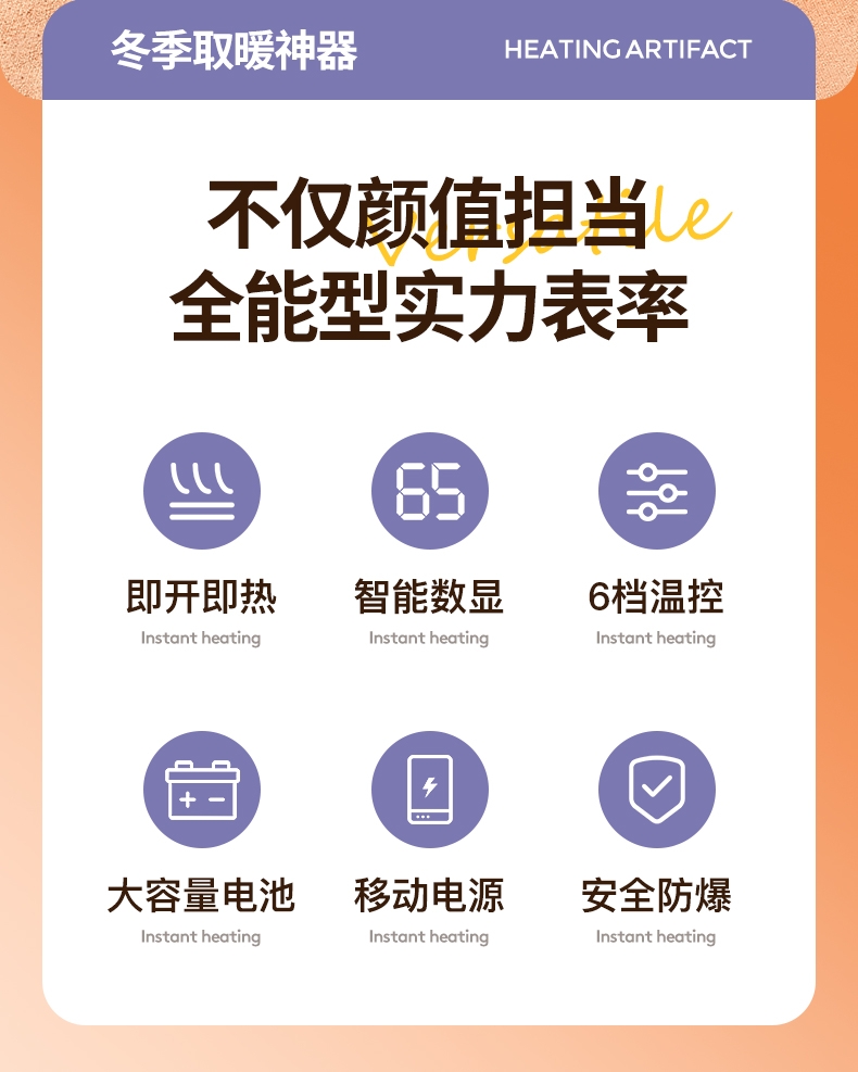 智能数显,安全防爆;即开即暖,持续恒温一整天;双面发热, 六档调节,智能控温,长效续航