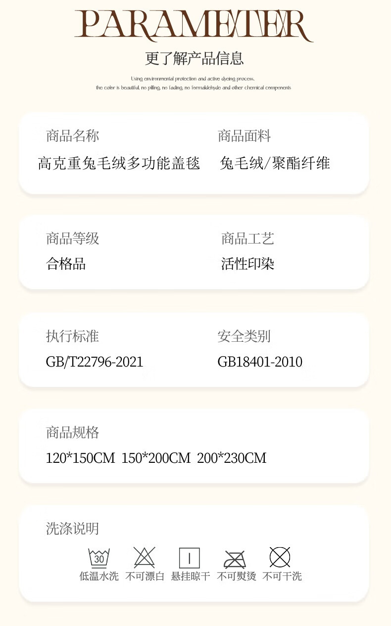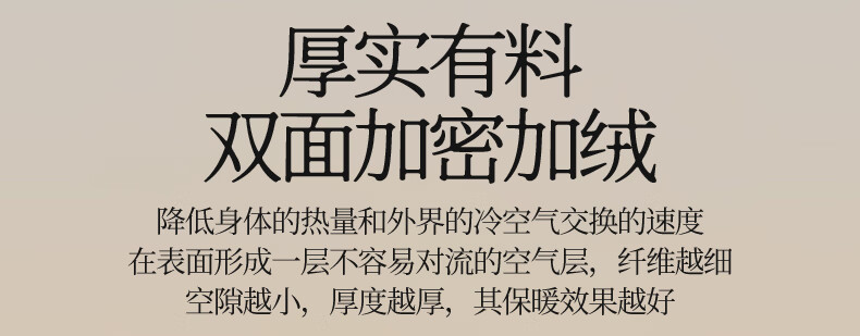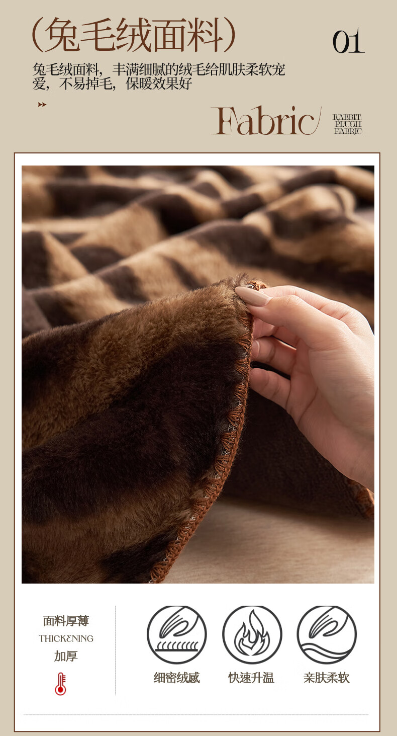 兔毛绒面料 丰满细腻的绒毛 给肌肤软宠爱;不易掉毛 保暖效果好 厚实有料; 双面加密加绒