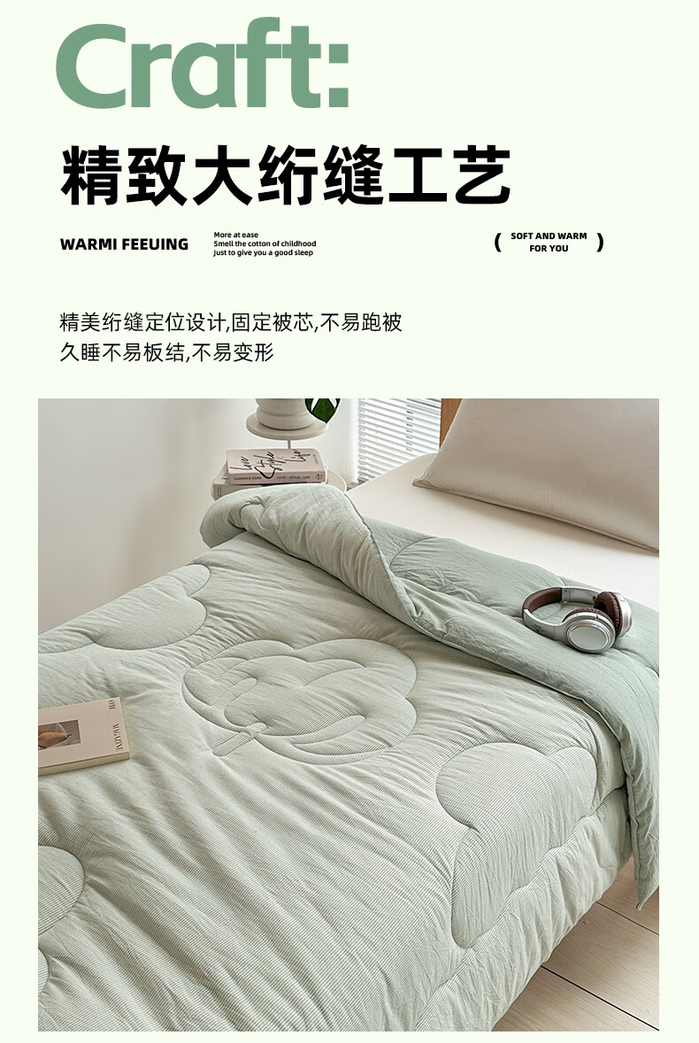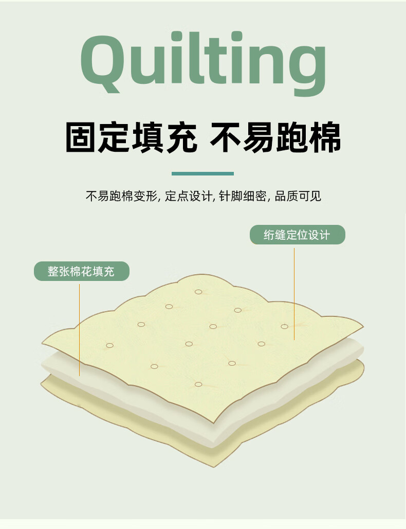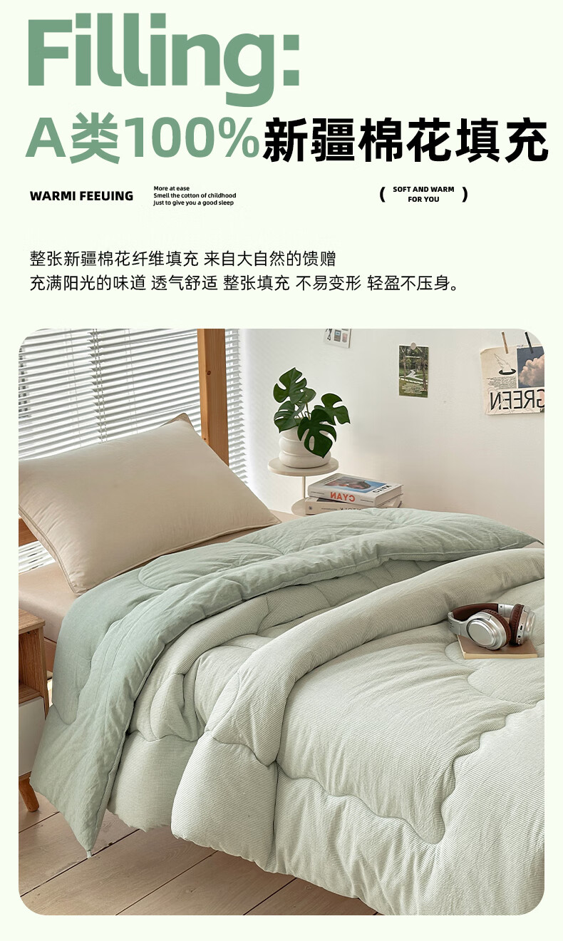 整张新疆棉花纤维填充,整张新疆棉花纤维填充;不易变形,轻盈不压身;精美绗缝定位设计,固定被芯,不易跑被