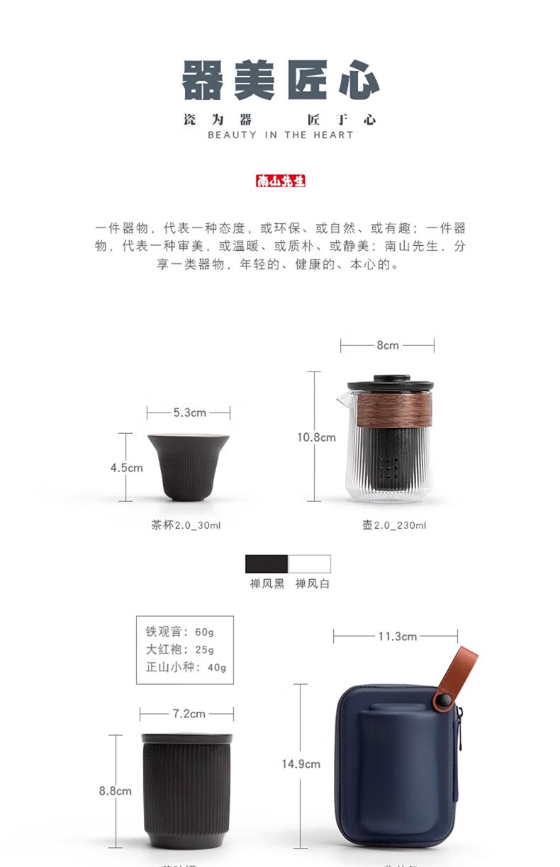 配置清单:茶壶*1,公道*1,茶杯*3,手提包*1,礼盒*1,礼袋*1