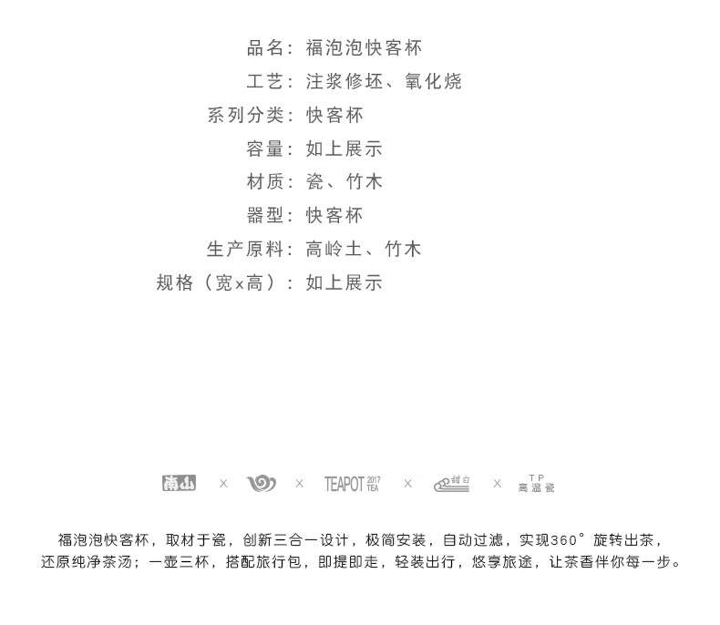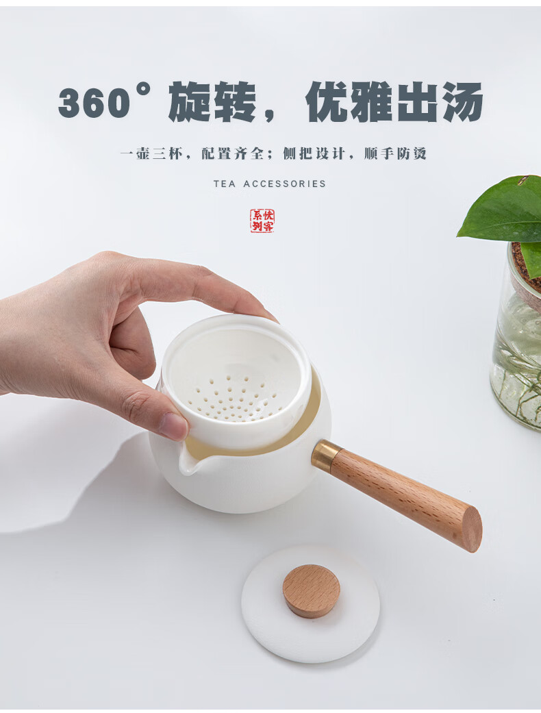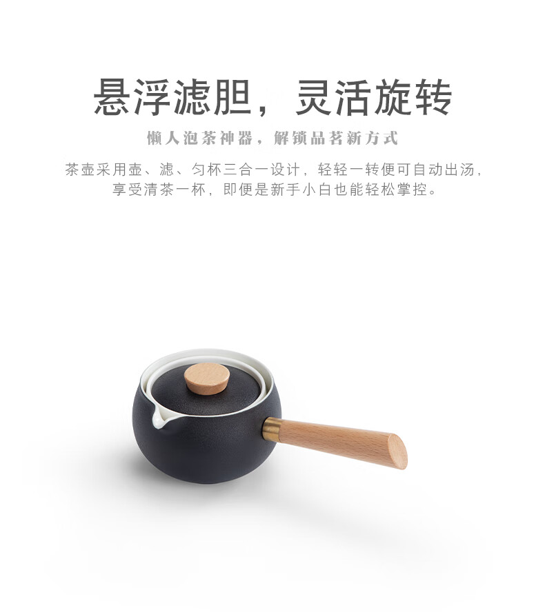 极简安装,自动过滤,实现360°旋转出茶;一壶三杯,搭配旅行包,即提即走,轻装出行;悬浮滤胆,灵活旋转