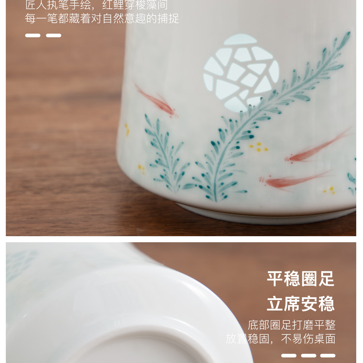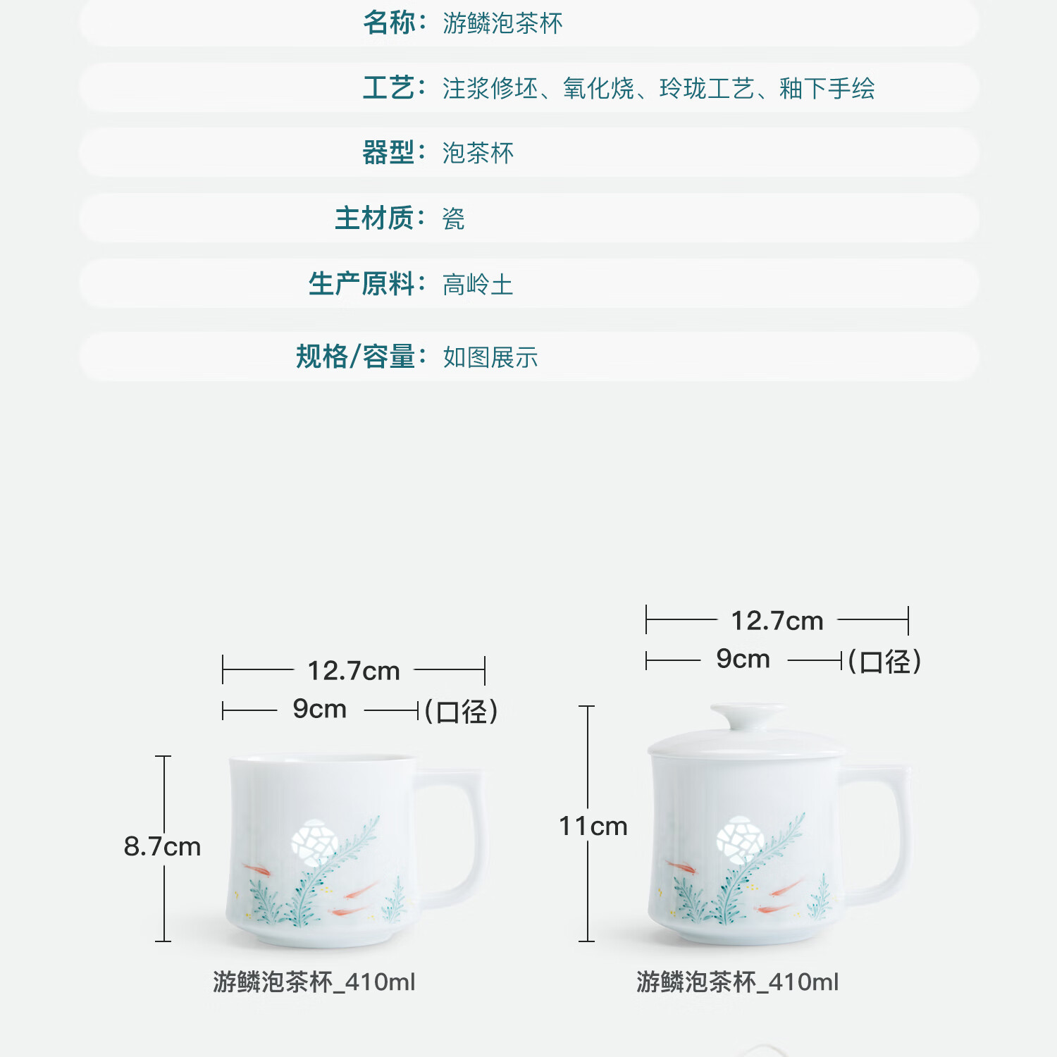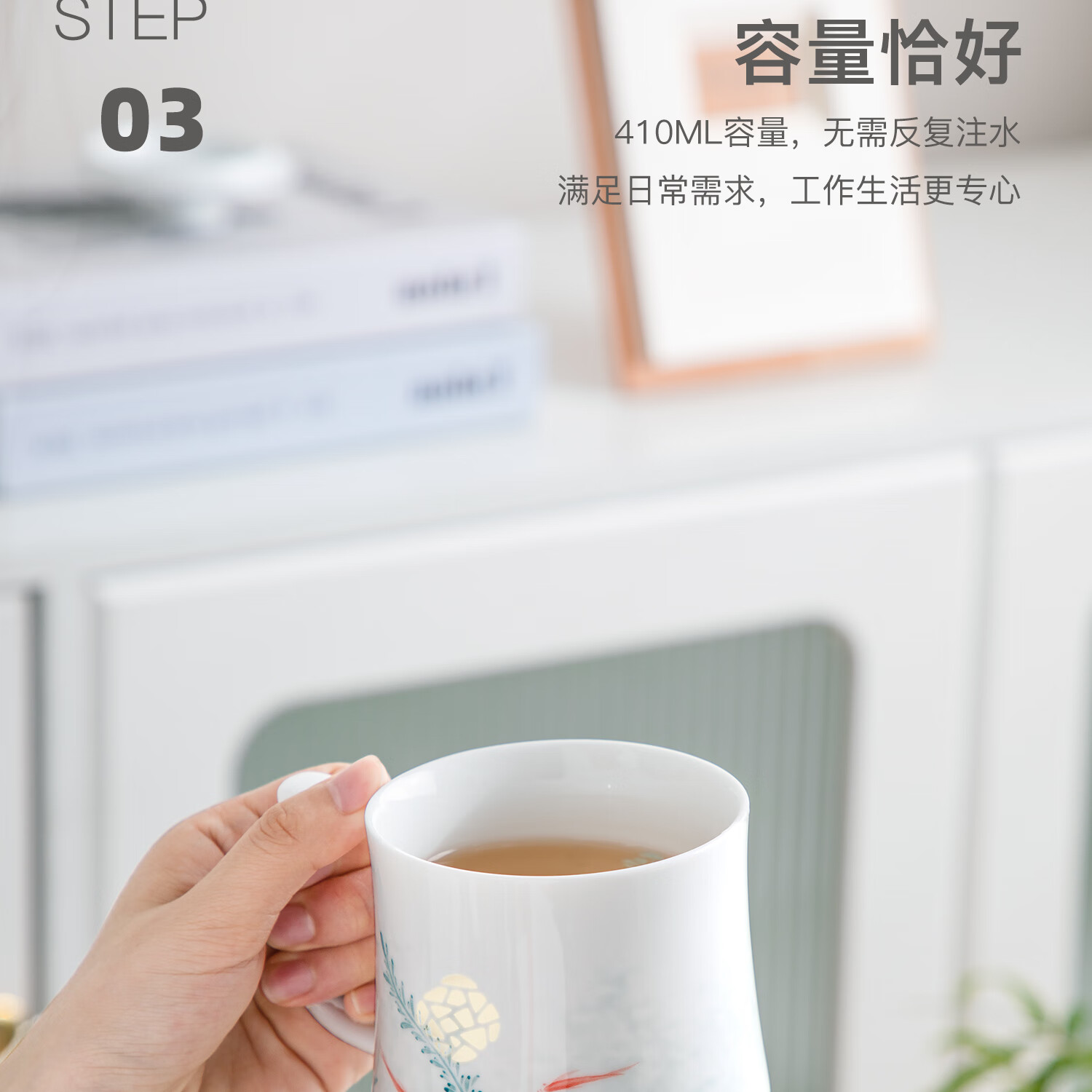 410ML容量,无需反复注水满足日常需求;内壁施釉, 不易吸味、留渍,你喜欢的茶皆可欢喜入杯;匠人巧用手绘和玲珑工艺,将自然意趣凝于瓷间