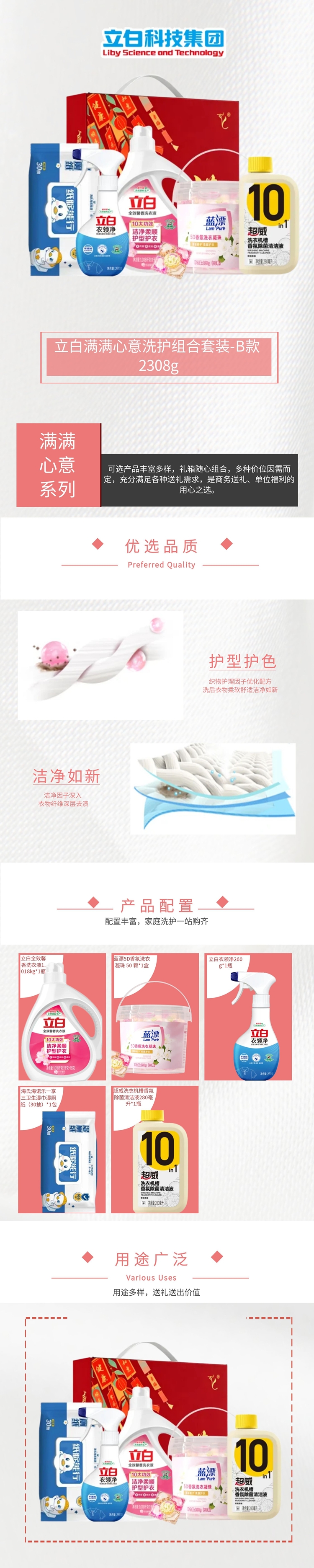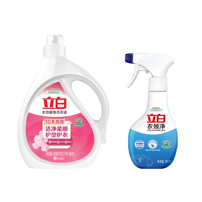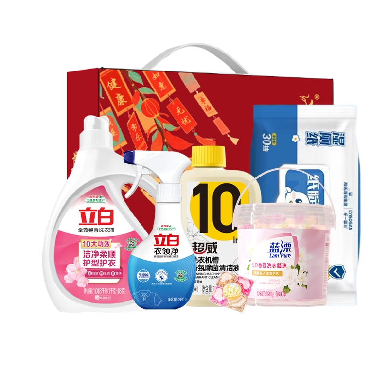 配置:立白全效馨香洗衣液1.018kg*1瓶 立白衣领净260g*1瓶 蓝漂5D香氛洗衣凝珠 50 颗*1盒 超威洗衣机槽香氛除菌清洁液280毫升*1瓶 海氏海诺乐一享三卫生湿巾湿厕纸(30抽)*1包