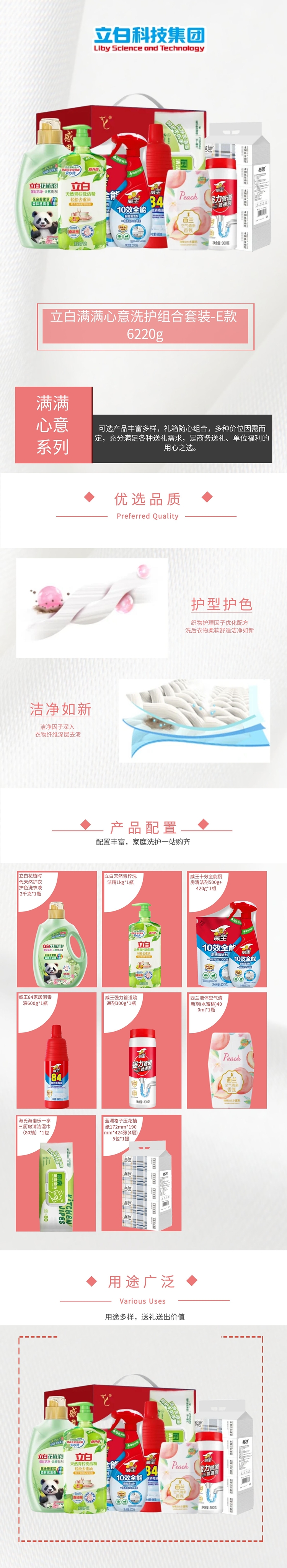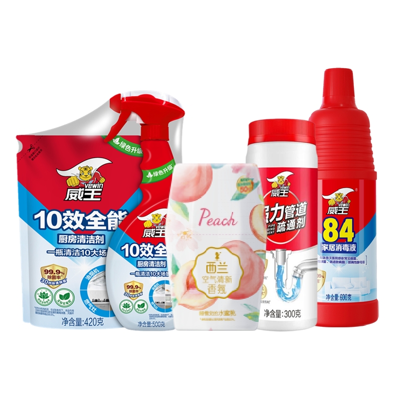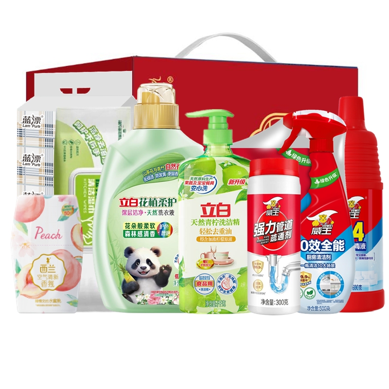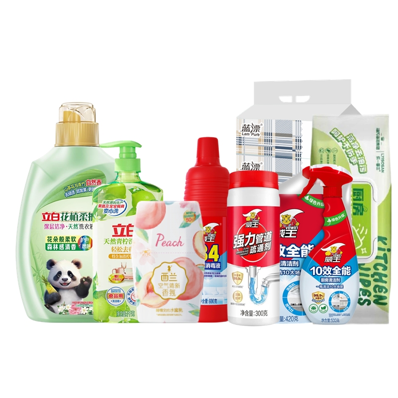 配置:立白花植时代天然护衣护色洗衣液2千克*1瓶 立白天然青柠洗洁精1kg*1瓶 威王十效全能厨房清洁剂500g+420g*1组 威王84家居消毒液600g*1瓶 威王强力管道疏通剂300g*1瓶 西兰液体空气清新剂(水蜜桃)400ml*1瓶 海氏海诺乐一享三厨房清洁湿巾(80抽)*1包 蓝漂格子压花抽纸172mm*190mm*424张(4层)5包*1提