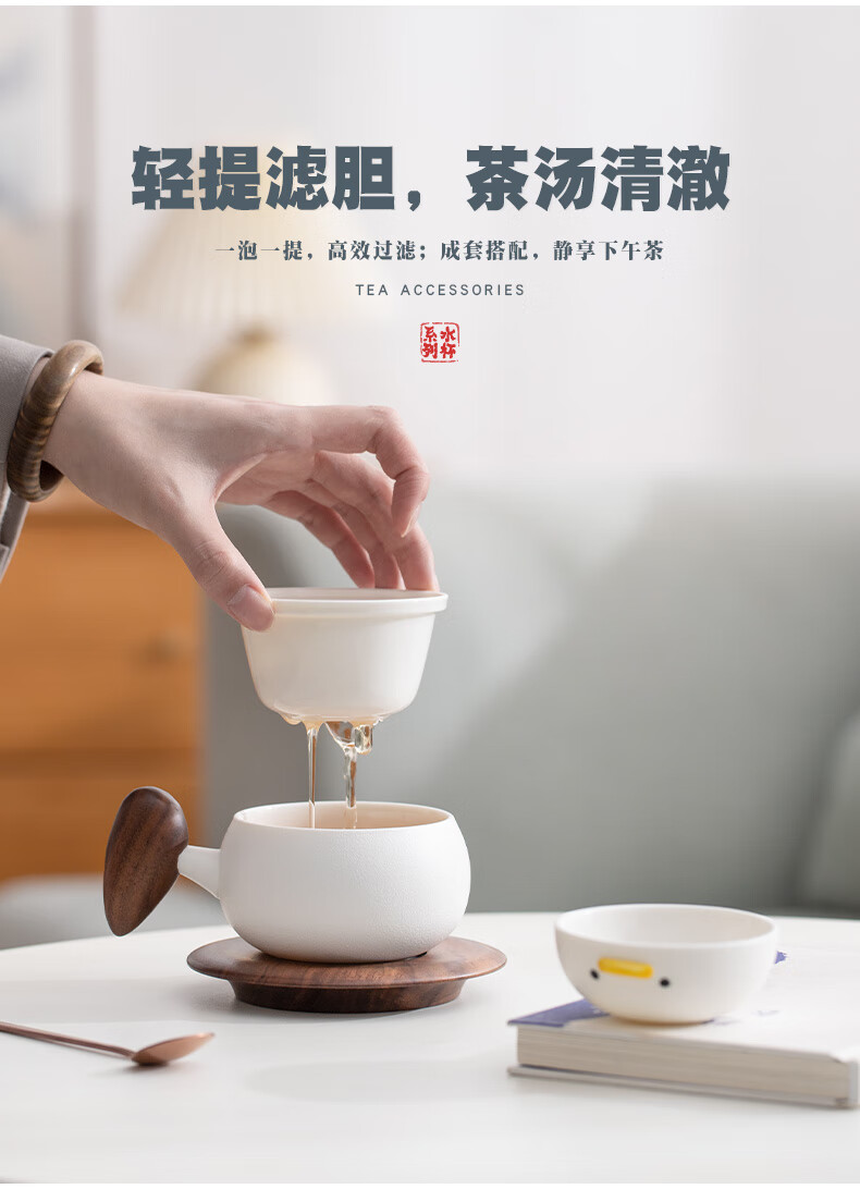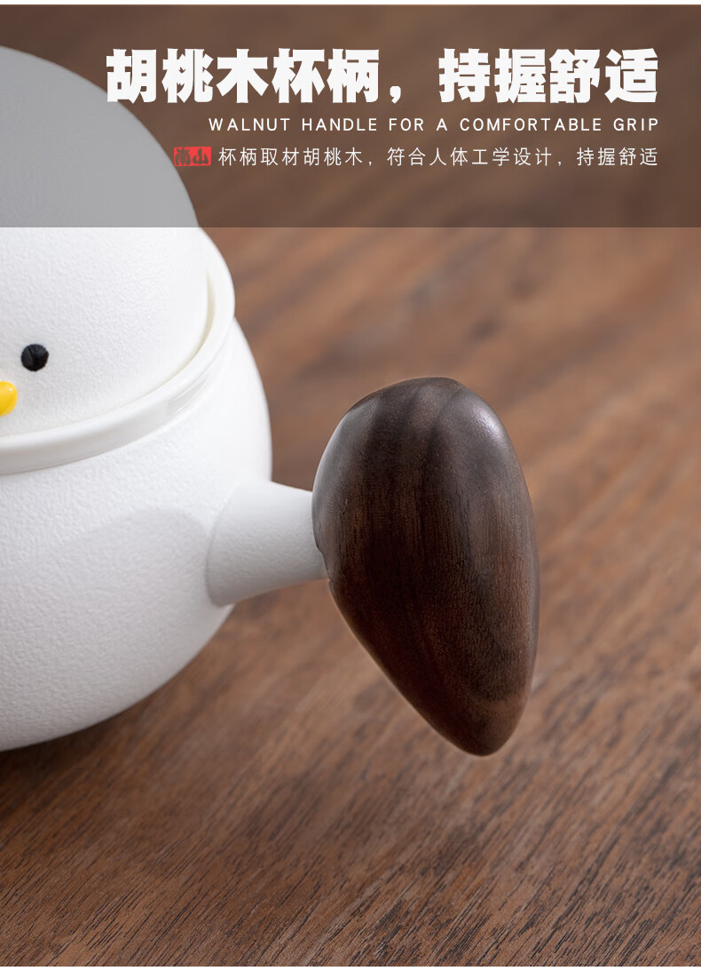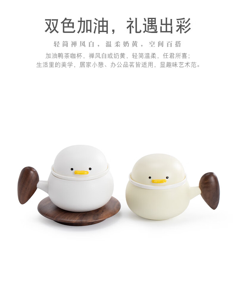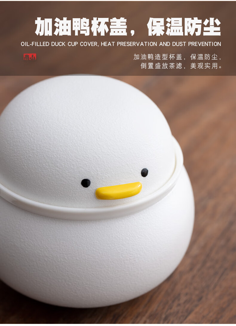 170ML容量,各式饮品皆可入杯,用它摆拍,上镜;加油鸭杯盖造型,乖巧有趣;茶杯可拆分,清洗方便;滤孔分布均匀,有效过滤茶渣,茶汤清澈。