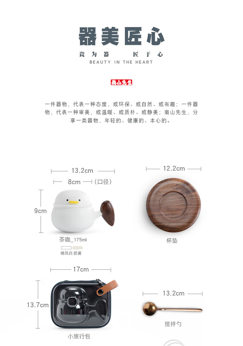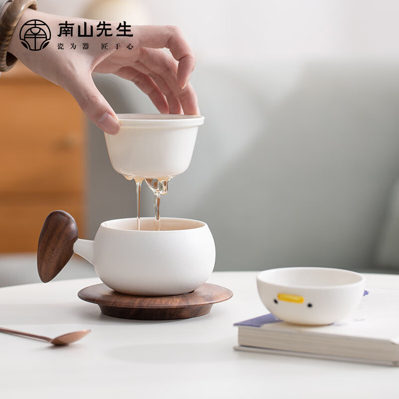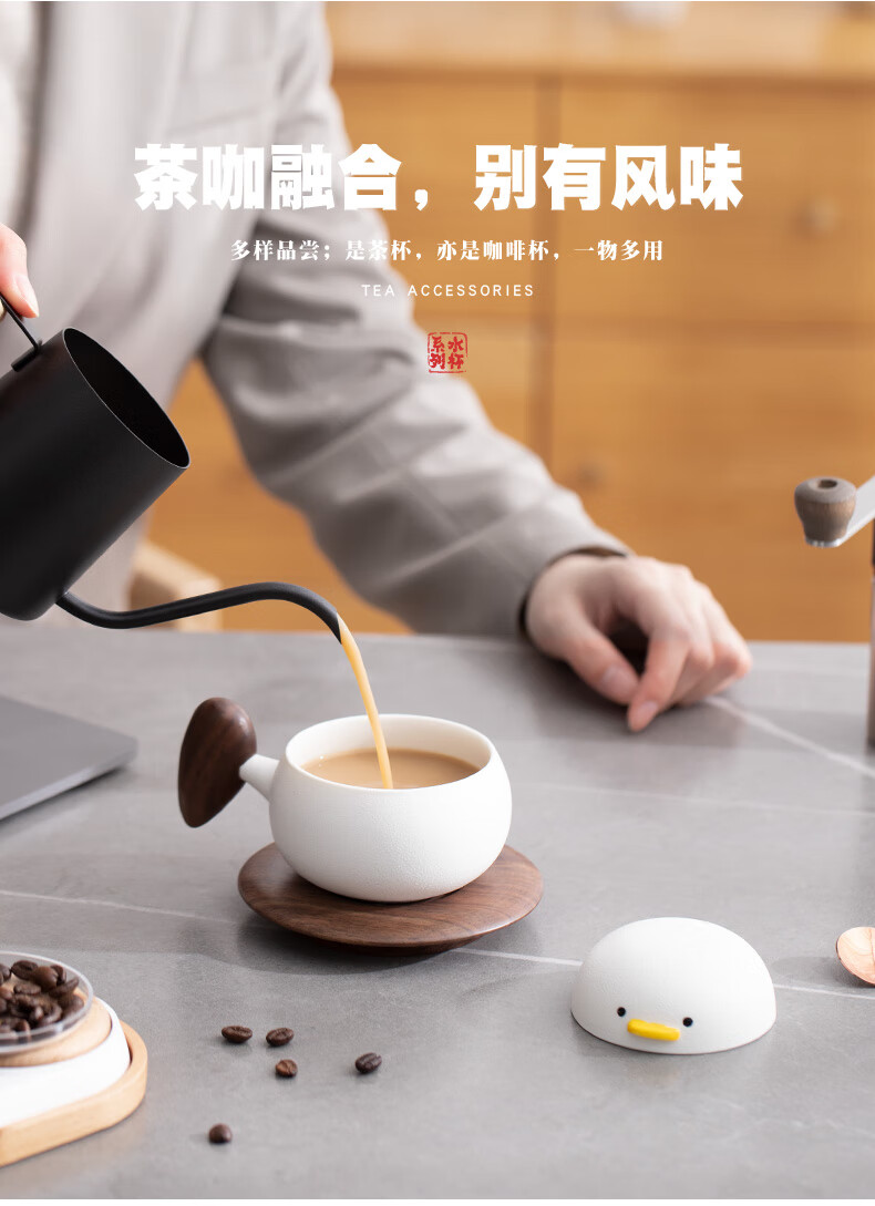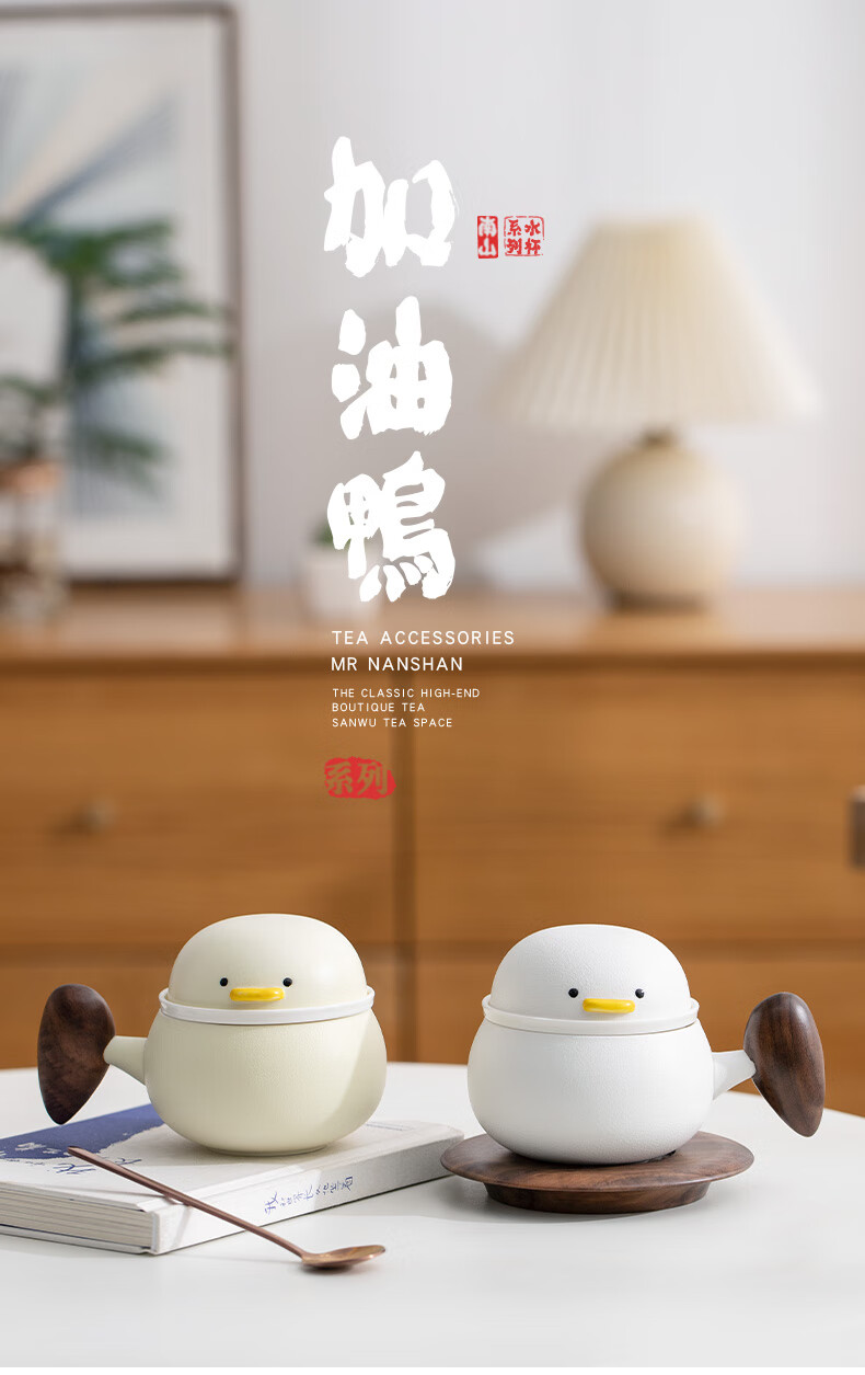 170ML容量,各式饮品皆可入杯,用它摆拍,上镜;加油鸭杯盖造型,乖巧有趣;茶杯可拆分,清洗方便;滤孔分布均匀,有效过滤茶渣,茶汤清澈。