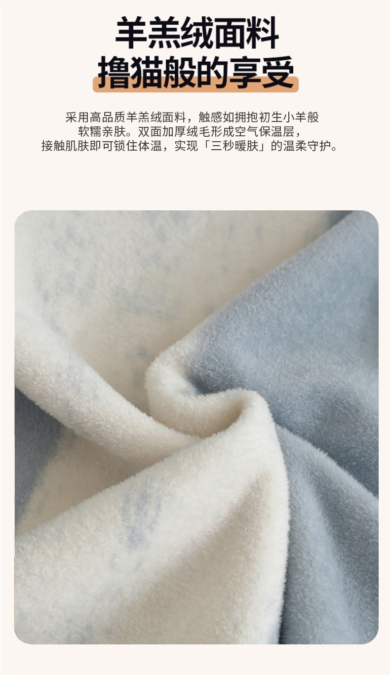 双面加厚绒毛形成空气保温层,接触肌肤瞬间锁住体温;绒毛经过防静电处理,久用仍保持柔软蓬松;易起球掉毛。可机洗设计方便日常打理