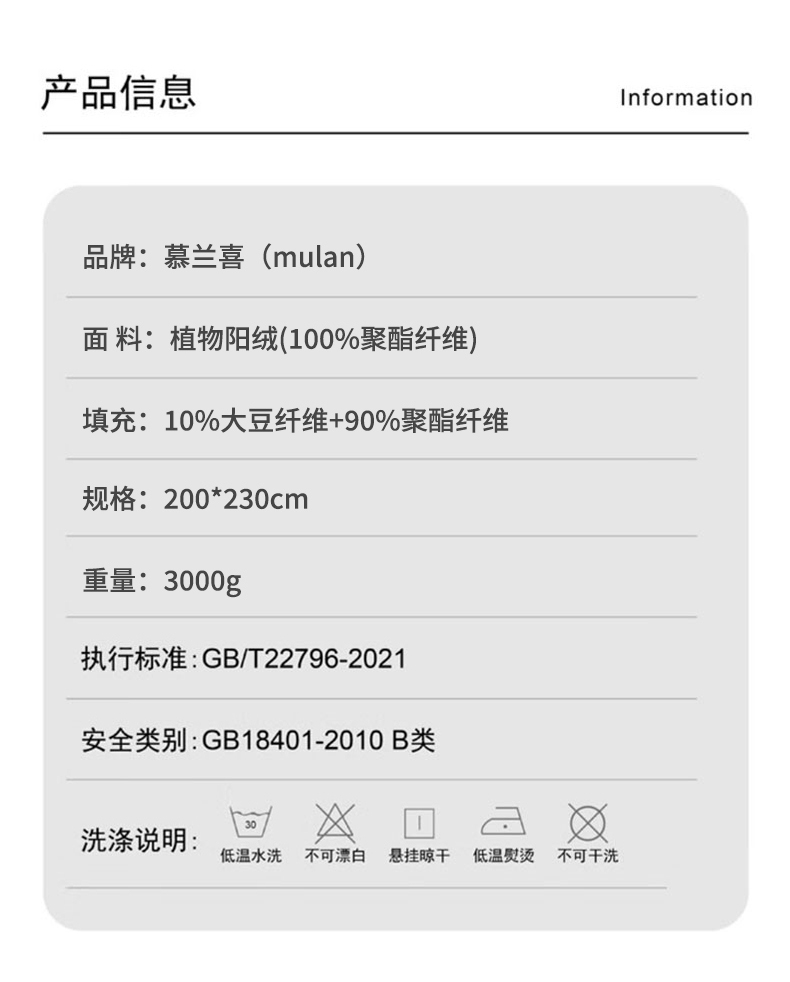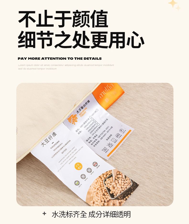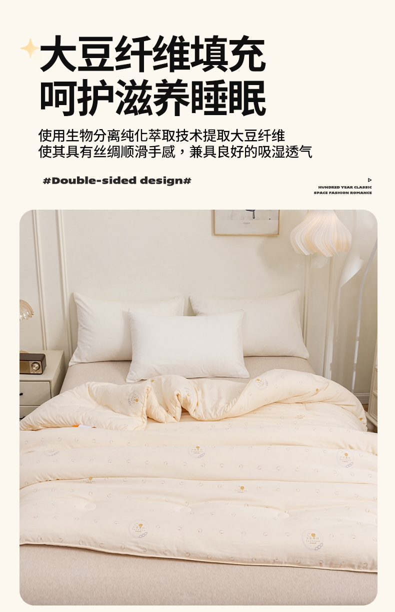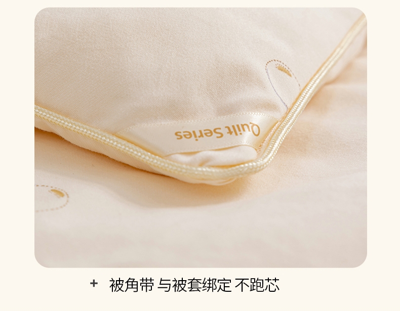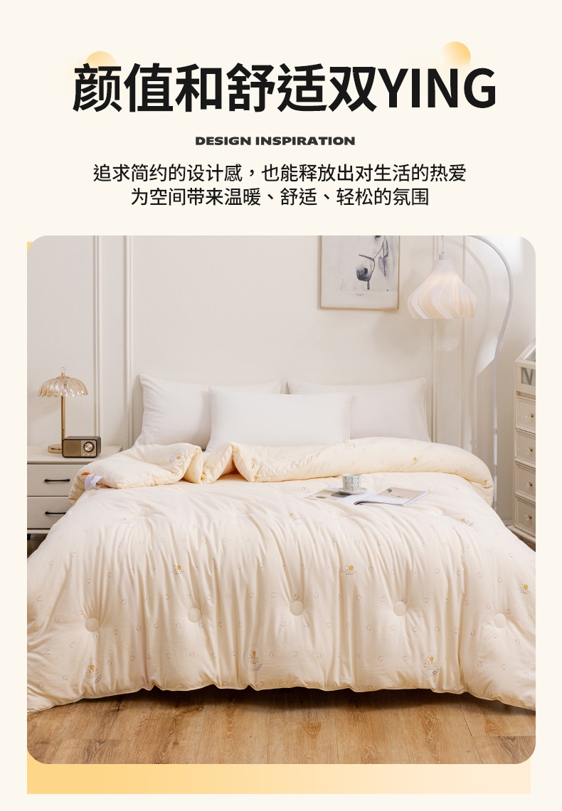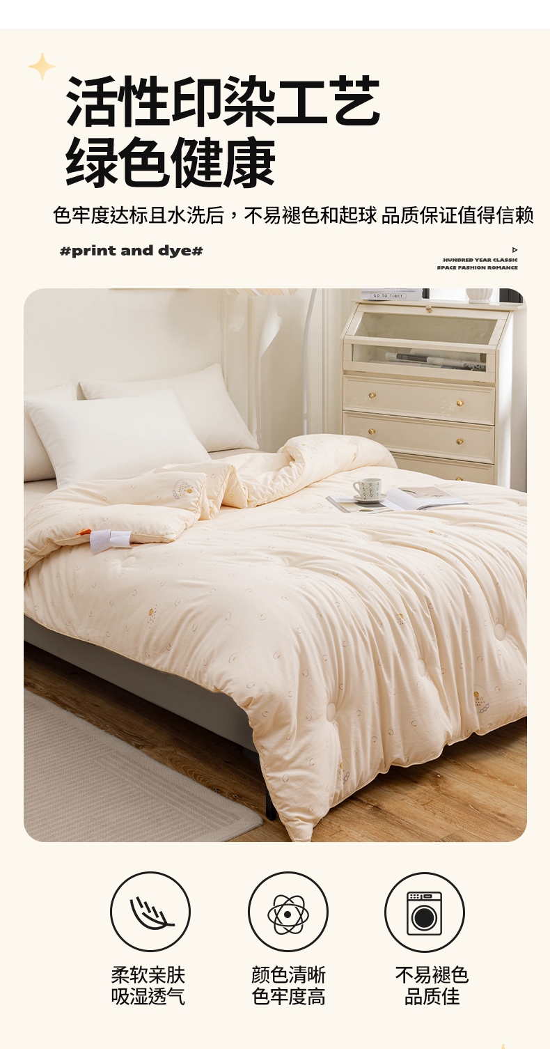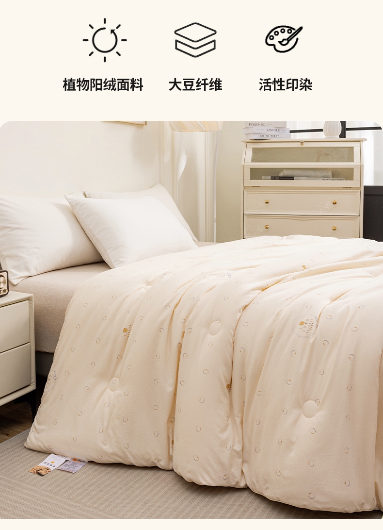 1.采用抗菌生态绒面料,亲肤舒适,触感细腻,保暖性;2.填充10%大豆蛋白纤维,更透气更蓬松的同时;定点绗缝工艺,均衡分布保证被芯的高弹蓬松