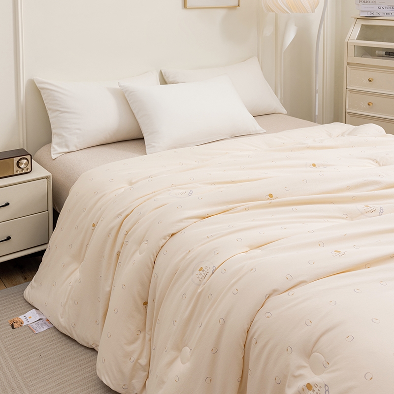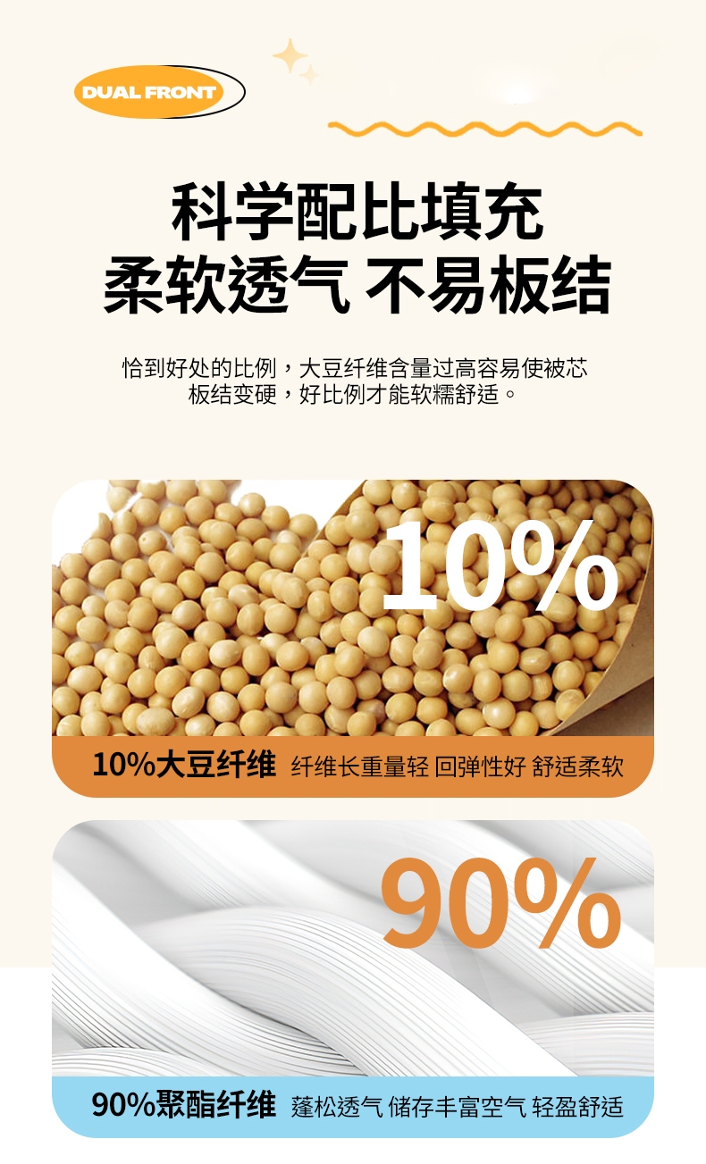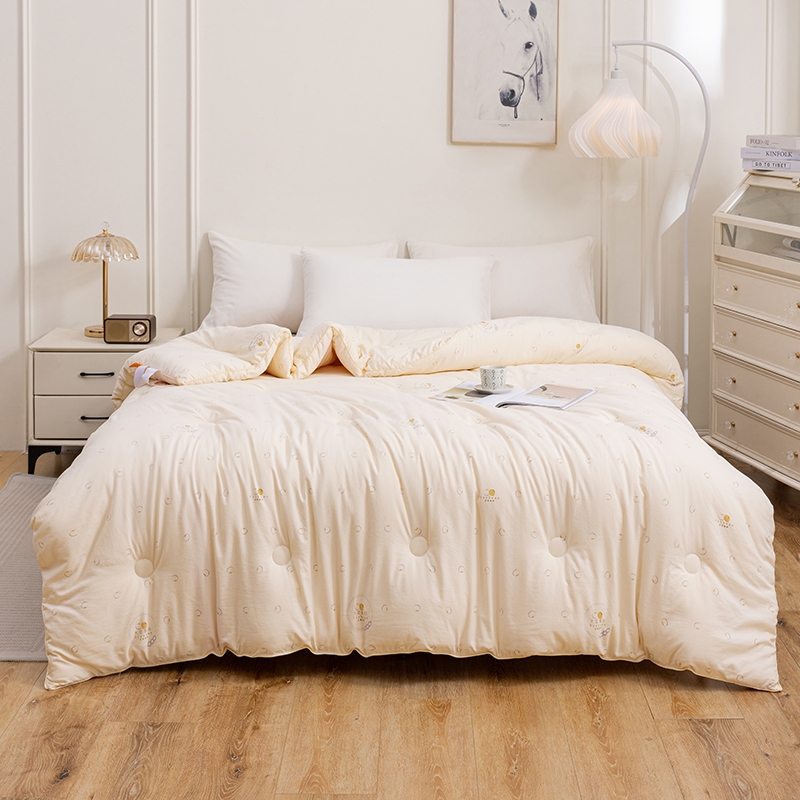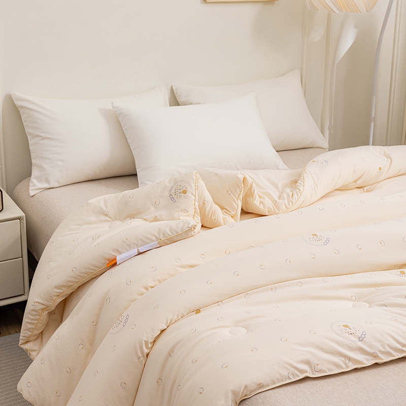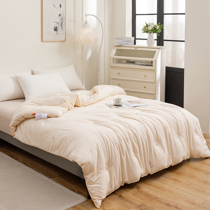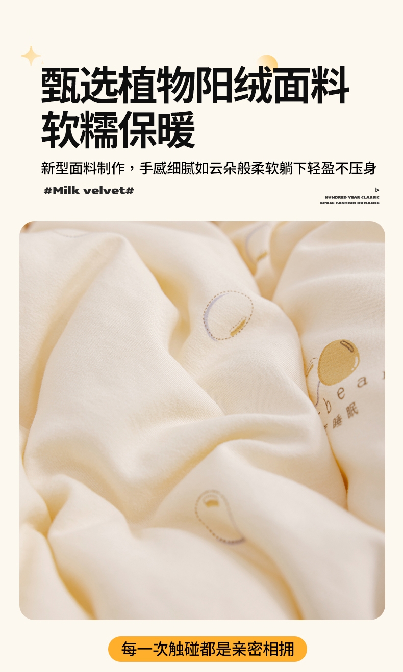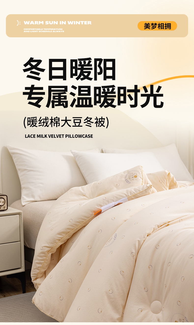 1.采用抗菌生态绒面料,亲肤舒适,触感细腻,保暖性;2.填充10%大豆蛋白纤维,更透气更蓬松的同时;定点绗缝工艺,均衡分布保证被芯的高弹蓬松