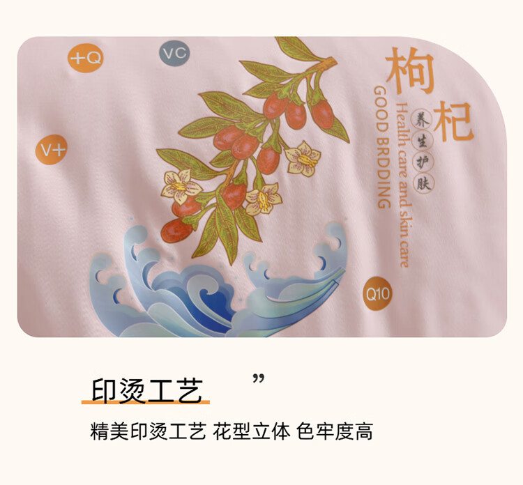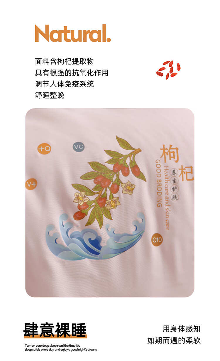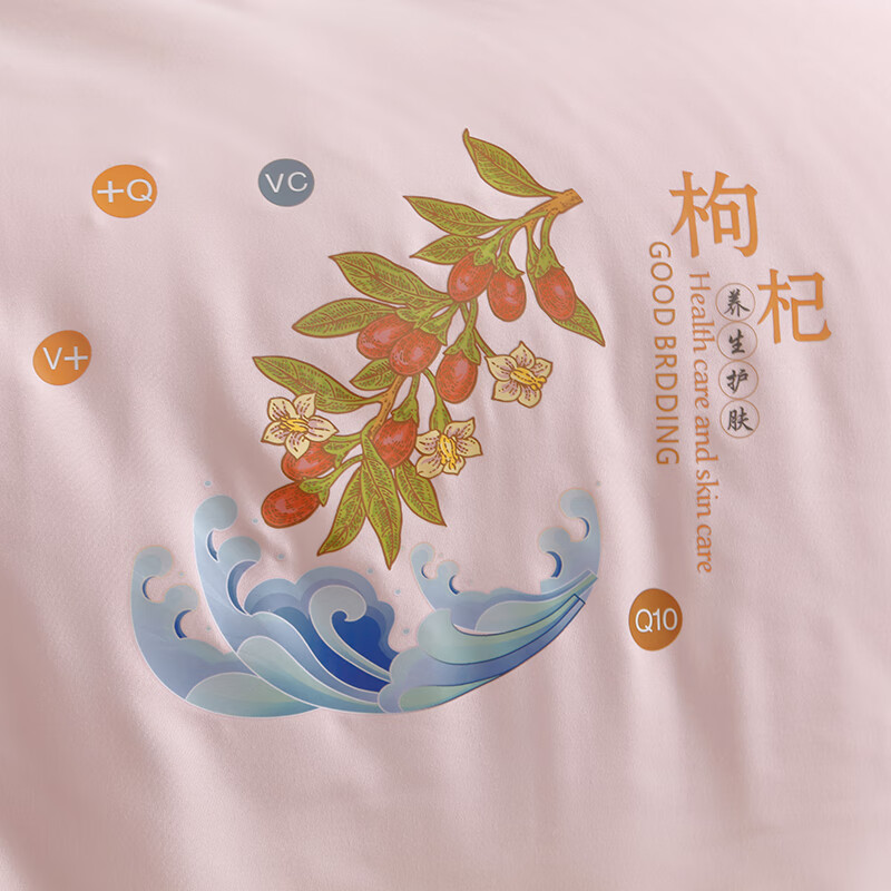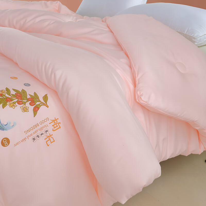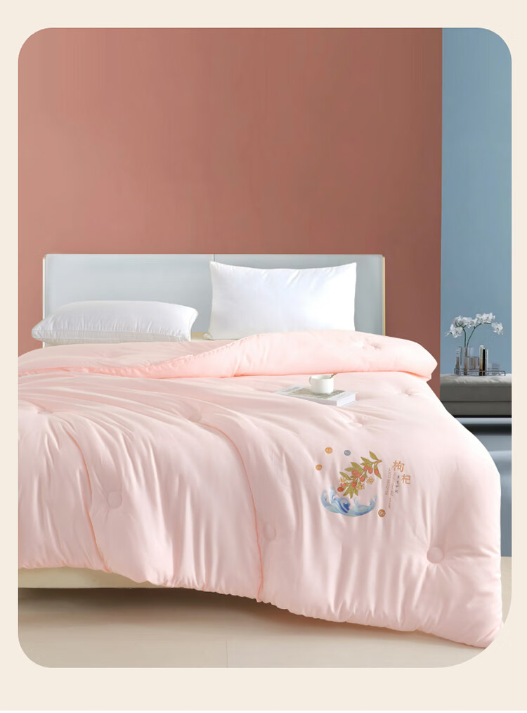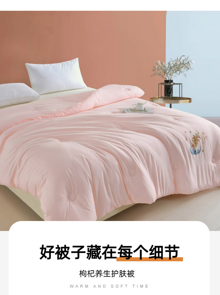 枸杞精华入被,安睡间润养身心;把自然滋补裹进梦乡,安睡时悄悄养元气;整张羽丝棉填充,蓬松透气;定点绗缝,牢牢固定不跑偏