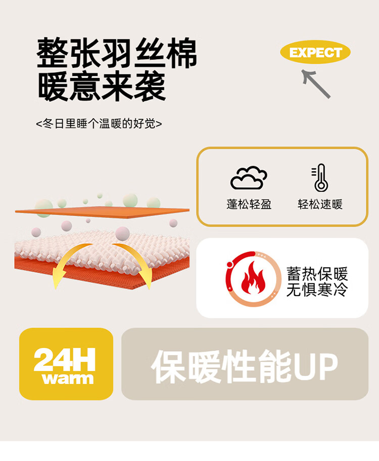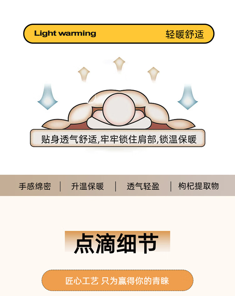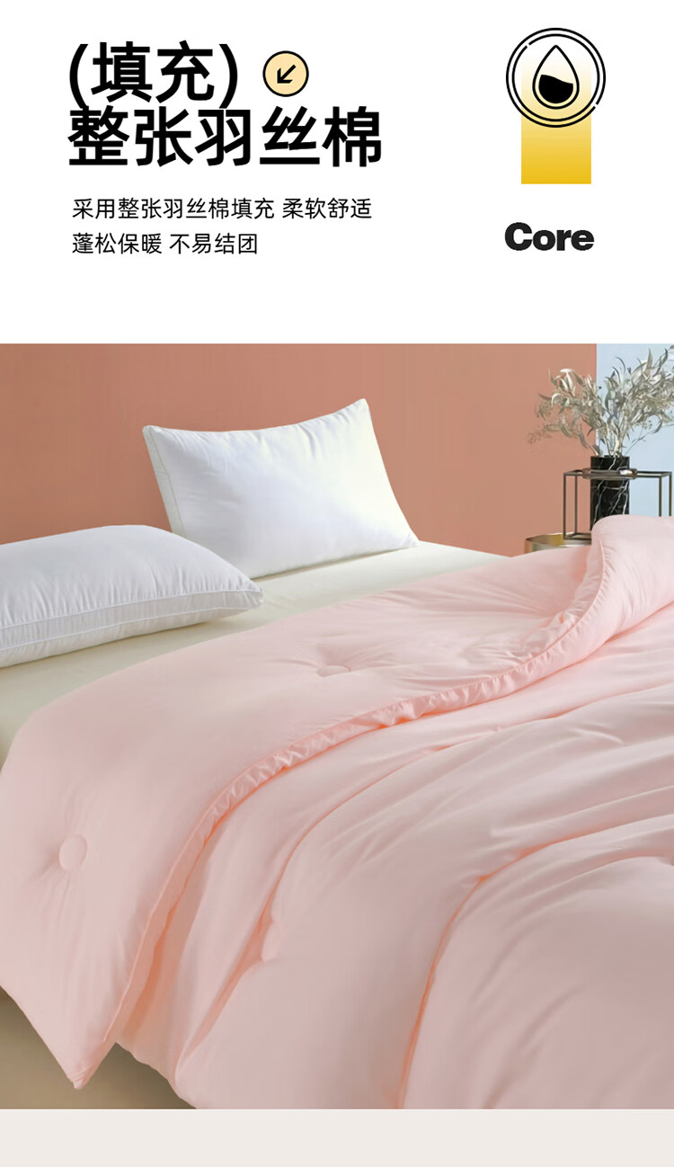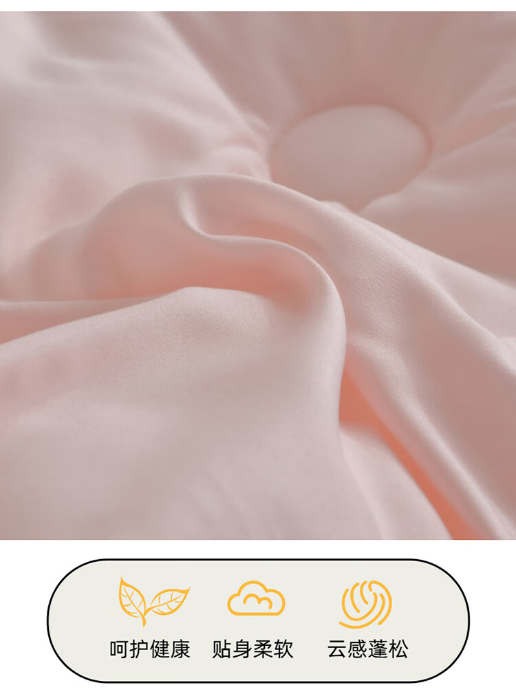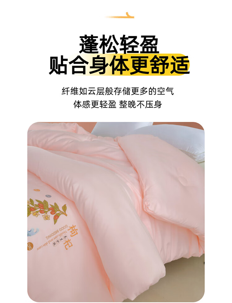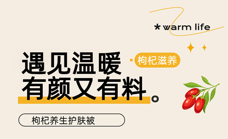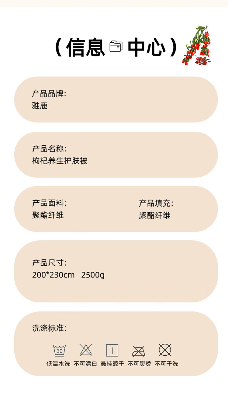 枸杞精华入被,安睡间润养身心;把自然滋补裹进梦乡,安睡时悄悄养元气;整张羽丝棉填充,蓬松透气;定点绗缝,牢牢固定不跑偏