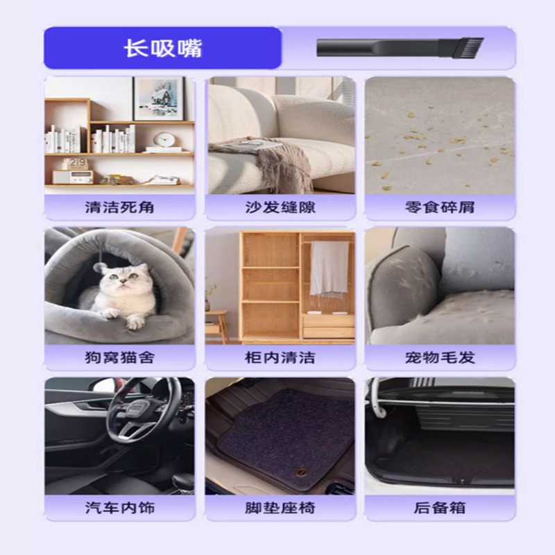 无线吸尘器功能强大,车内碎末垃圾轻松吸净;缝隙拐角清洁无死角;它还能吹净电脑键盘、钢琴键缝隙;户外烧烤时更可助力吹炭火,用途广泛清洁与生活的帮手