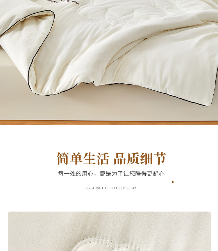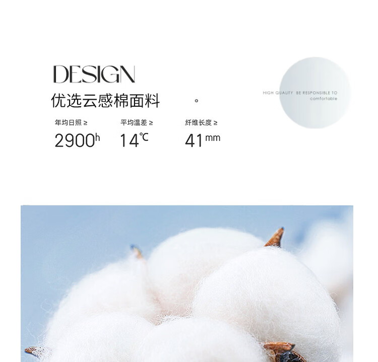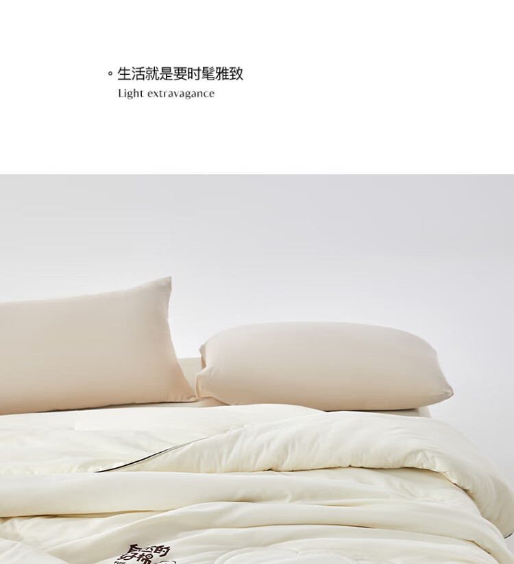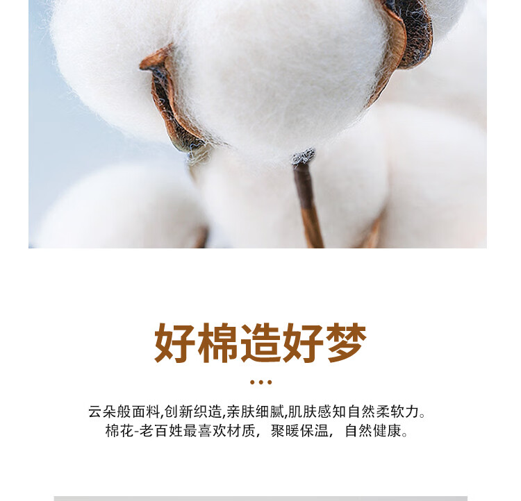 云朵般面料,创新织造,亲肤细腻,肌肤感知自然柔软力;棉花-老百姓最喜欢材质,聚暖保温,自然健康。;高品质、高材质、高标准,一款对生活高度负责的产品。