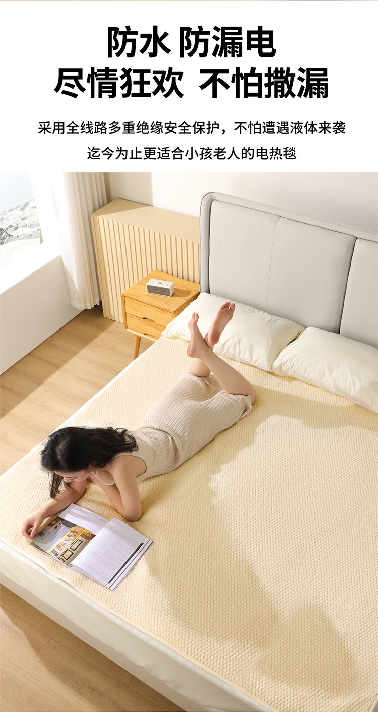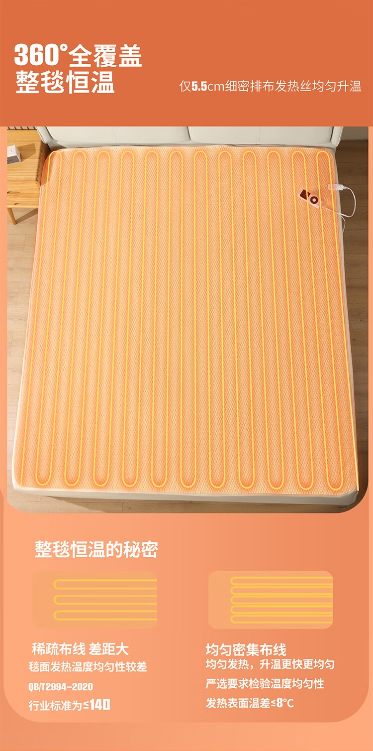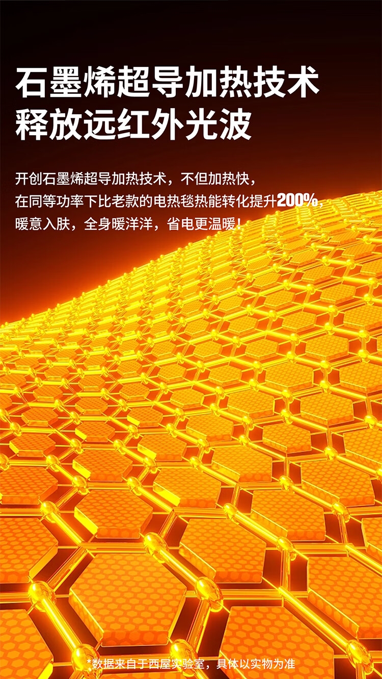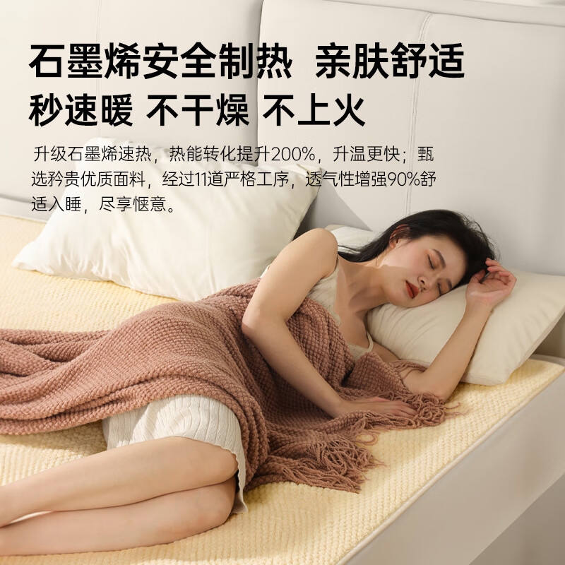 石墨烯碳纤维发热体电热毯;双螺旋发热丝,10档调节;高温抑菌除螨,尺寸是80*1800mm