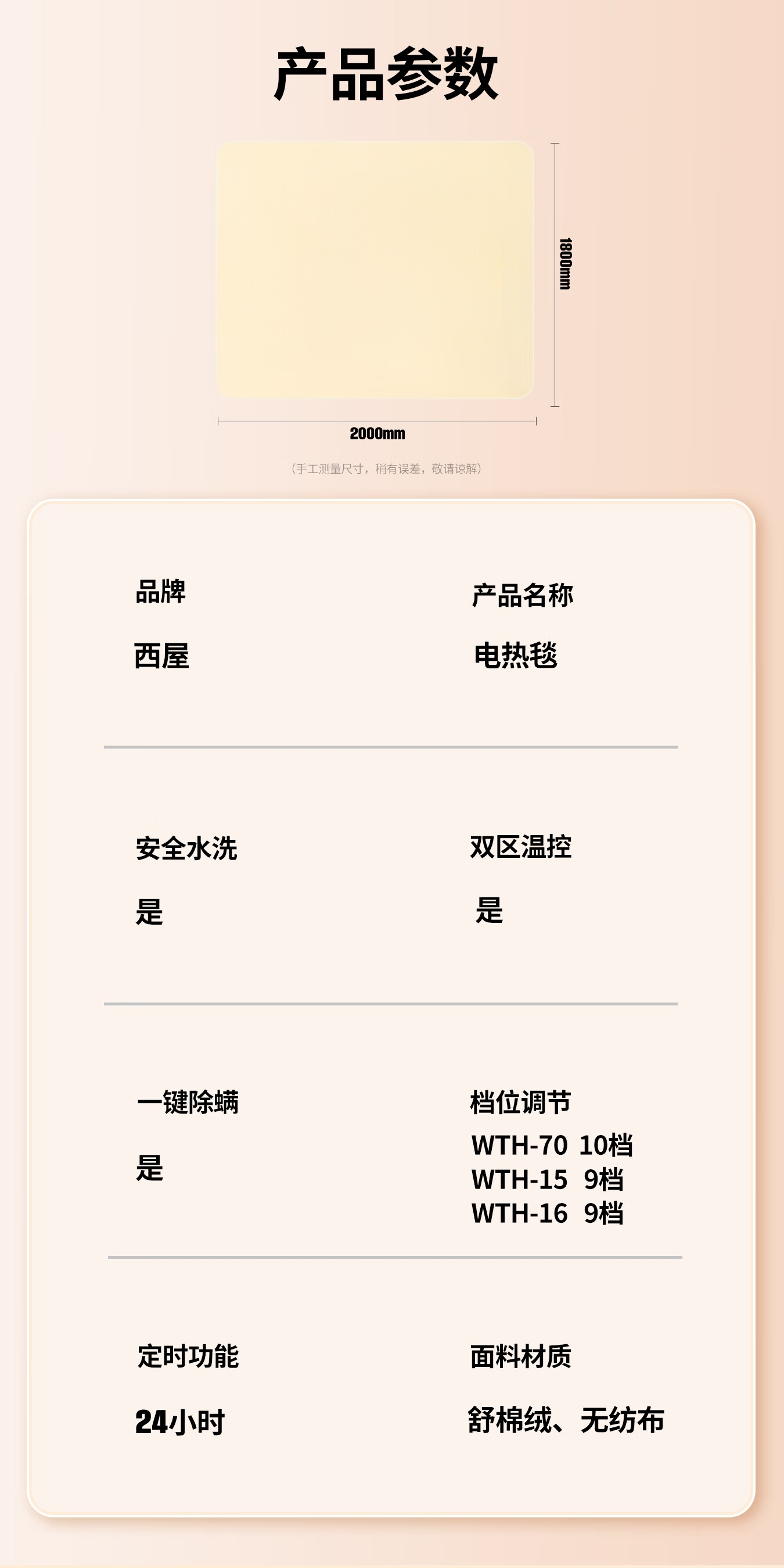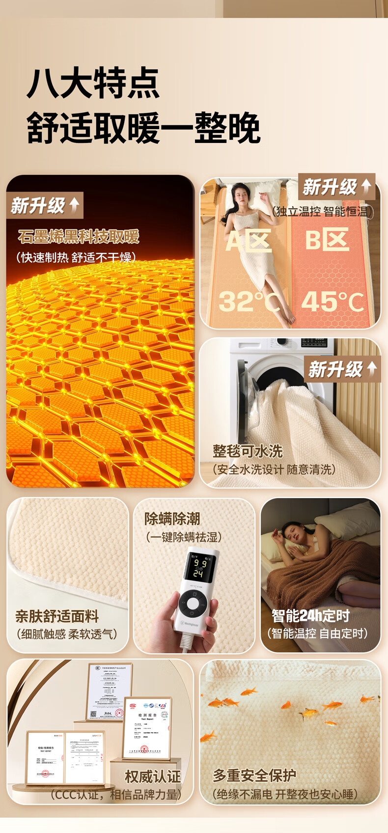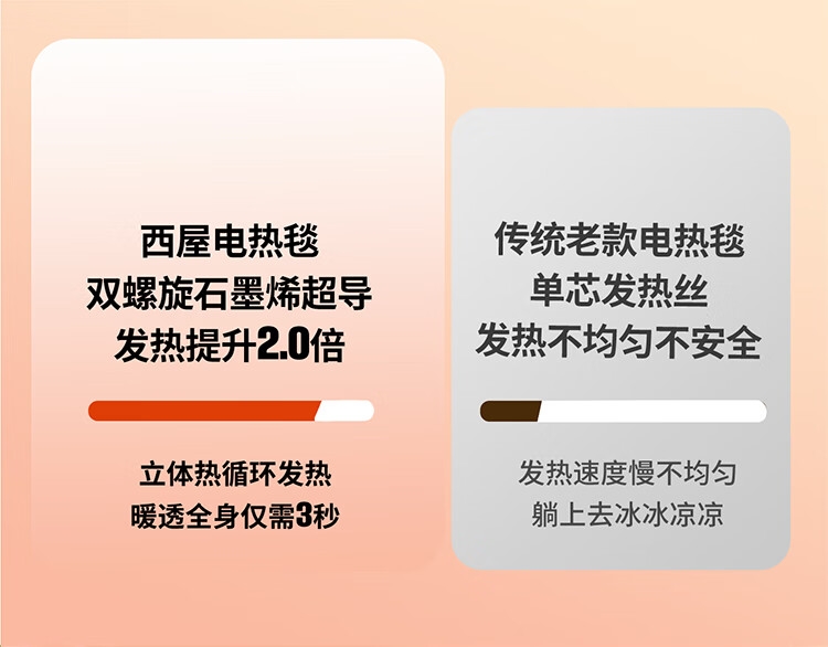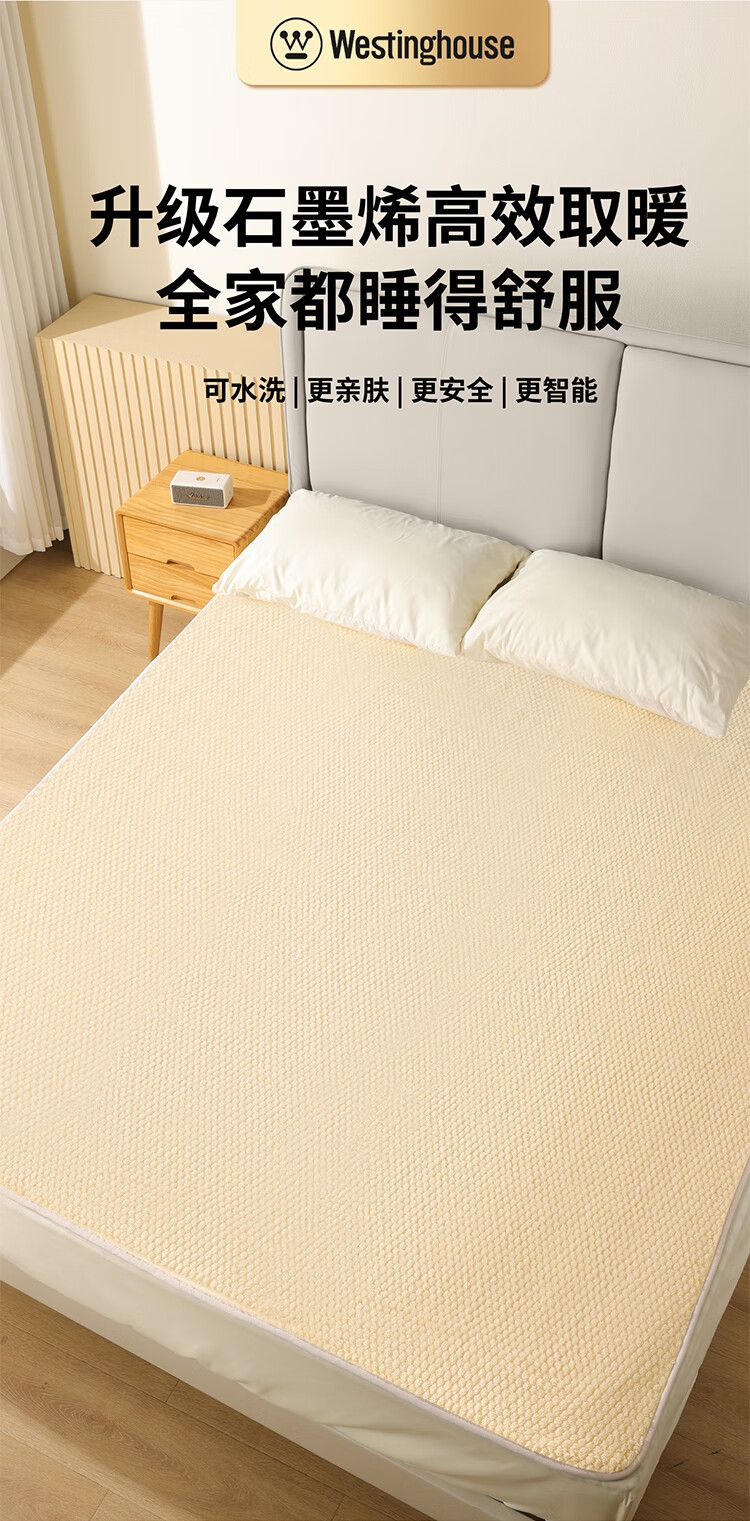石墨烯碳纤维发热体电热毯;双螺旋发热丝,10档调节;高温抑菌除螨,尺寸是80*1800mm