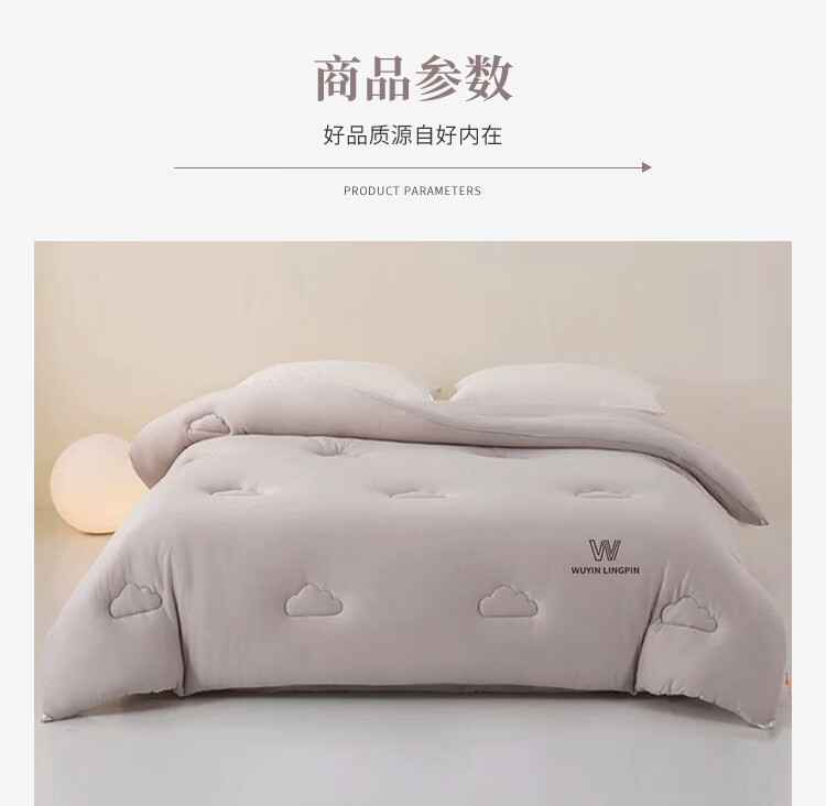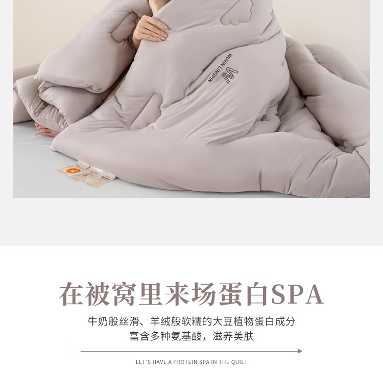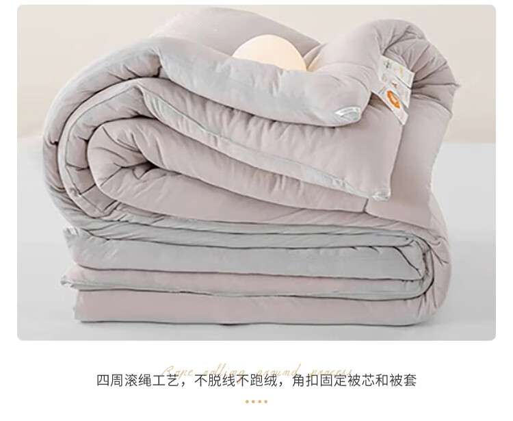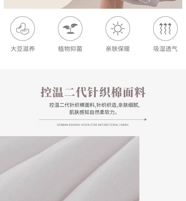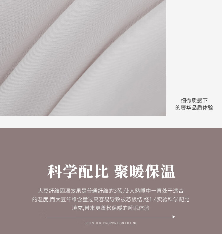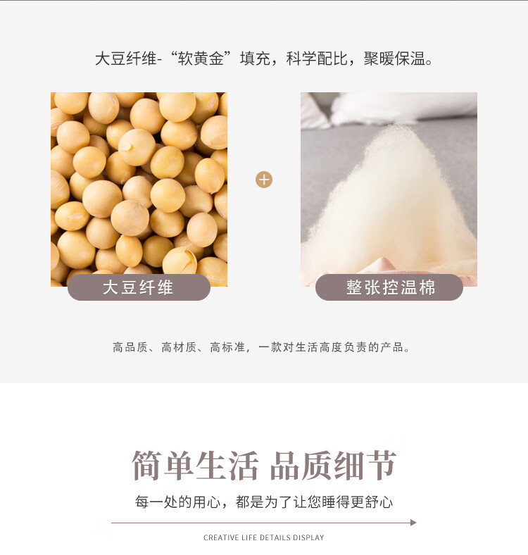 控温二代针织棉面料,针织织造,亲肤细腻,肌肤感知自;大豆纤维-“软黄金”填充,科学配比,聚暖保温。;高品质、高材质、高标准,一款对生活高度负责的产品。