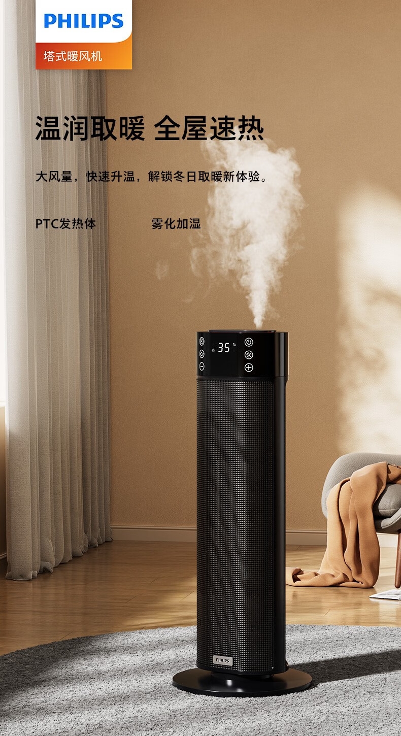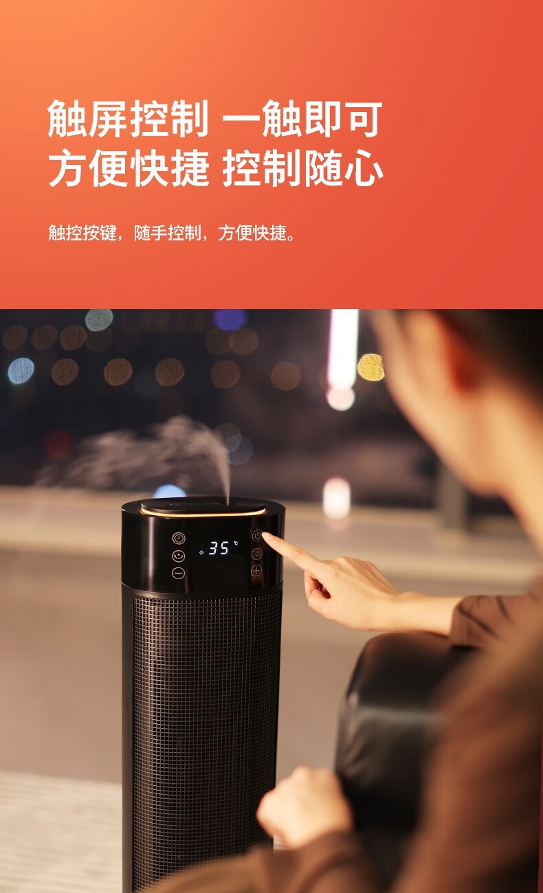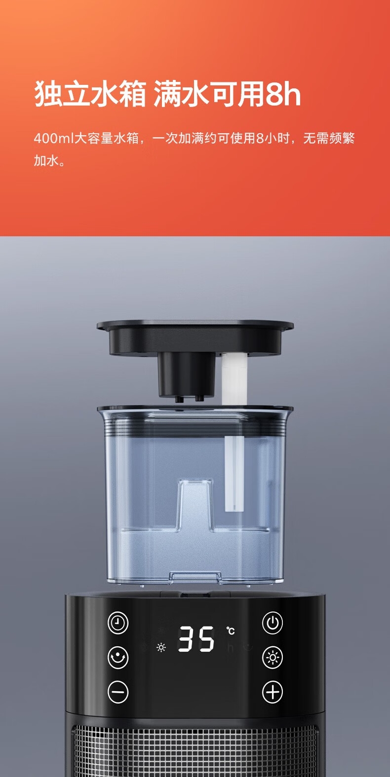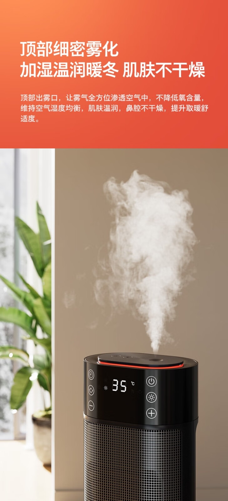 大风量,快速升温,解锁冬日取暖新体验;顶部细密雾化加湿温润暖冬 肌肤不干燥;独立水箱 满水可用8h;石墨烯速热陶瓷发热体快速制热