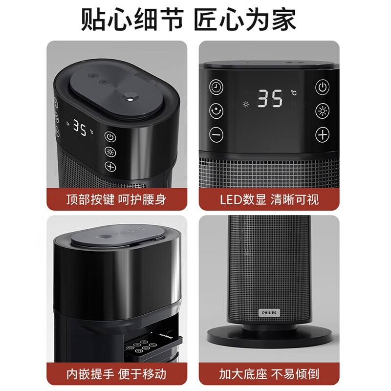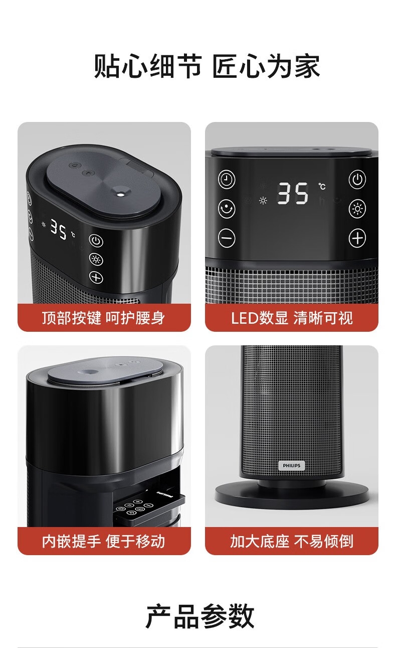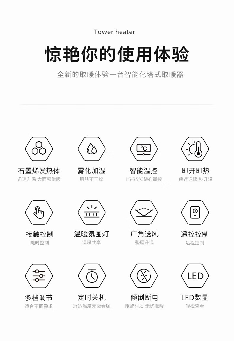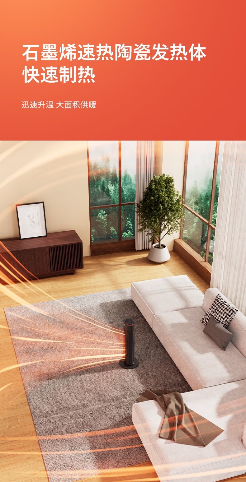 大风量,快速升温,解锁冬日取暖新体验;顶部细密雾化加湿温润暖冬 肌肤不干燥;独立水箱 满水可用8h;石墨烯速热陶瓷发热体快速制热
