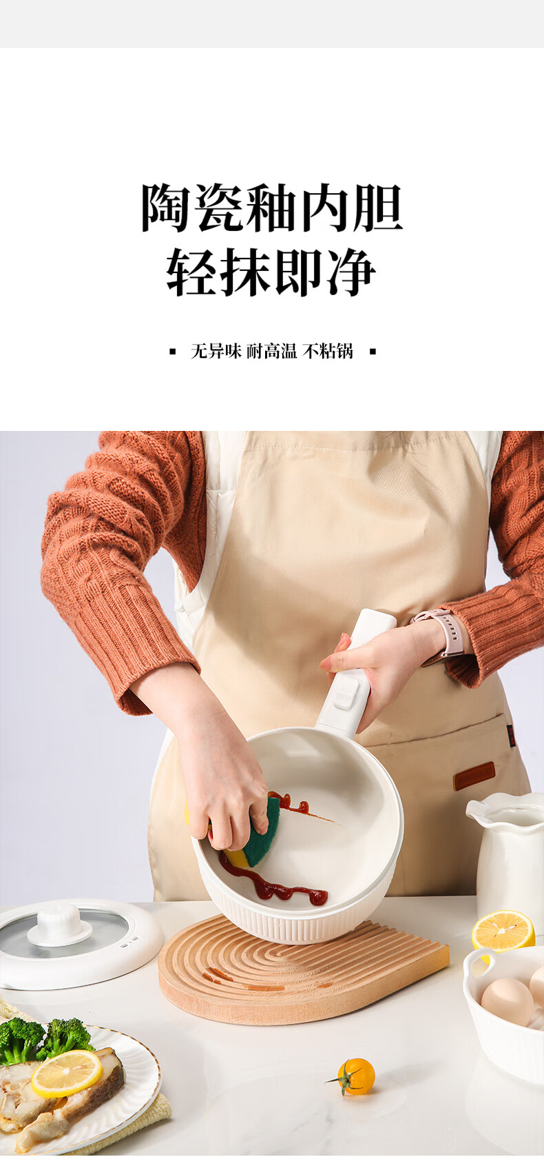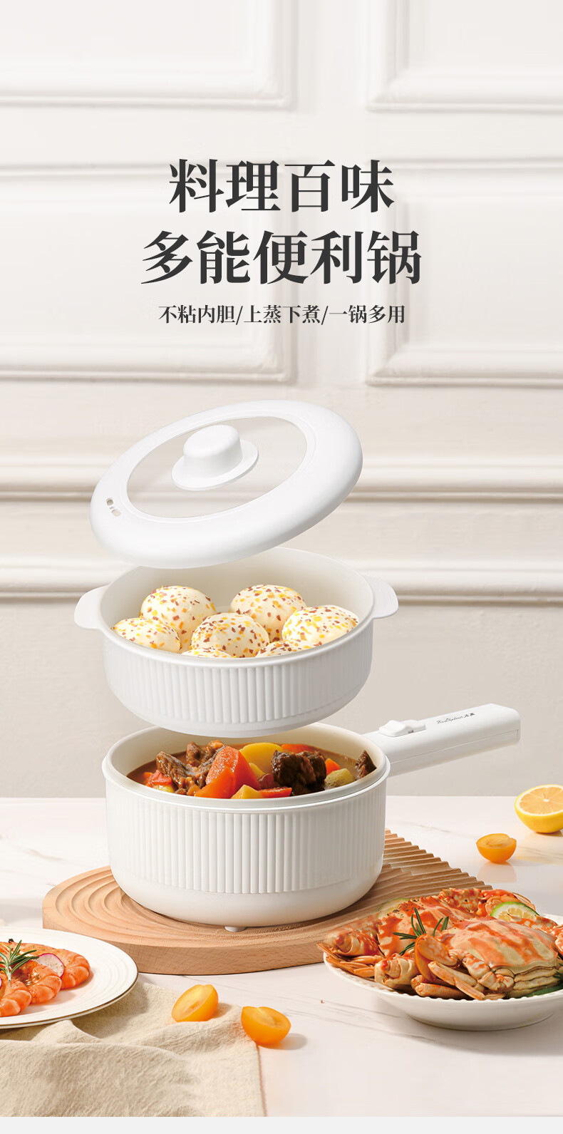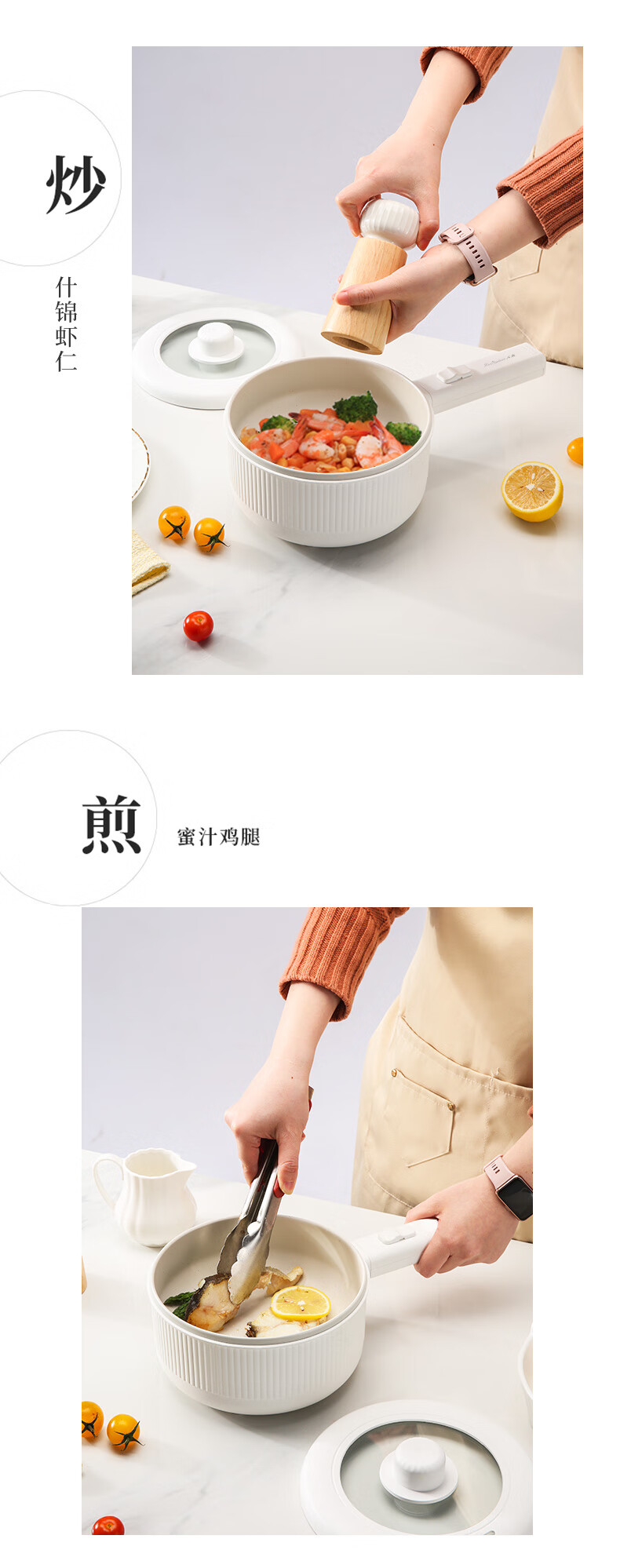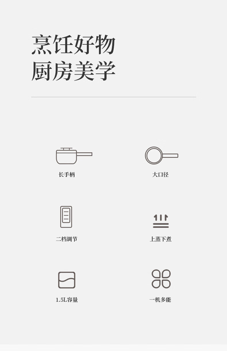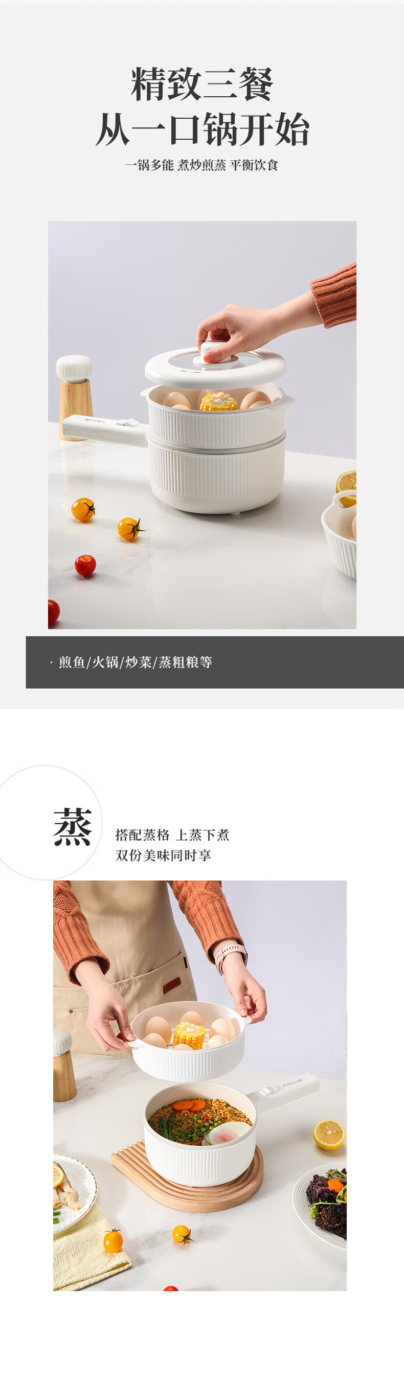 多功能设计,蒸煮煎炸、火锅、炒菜样样精通。;内胆采用白色不粘涂层,防粘锅。;配置食品级PP蒸笼,可蒸包子、鸡蛋等食物。;1.6L精致容量,刚好适合精致的你。
