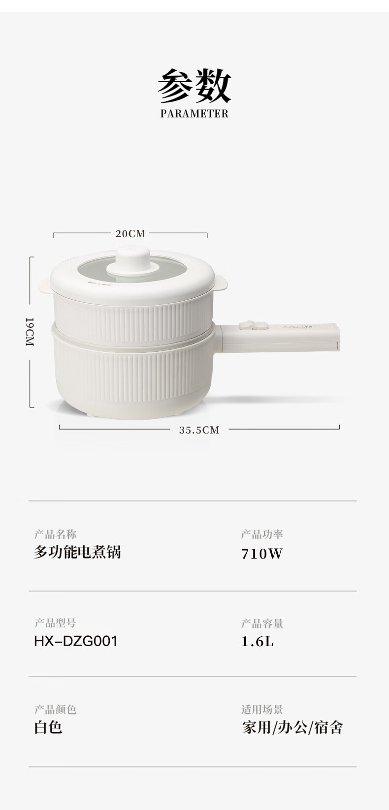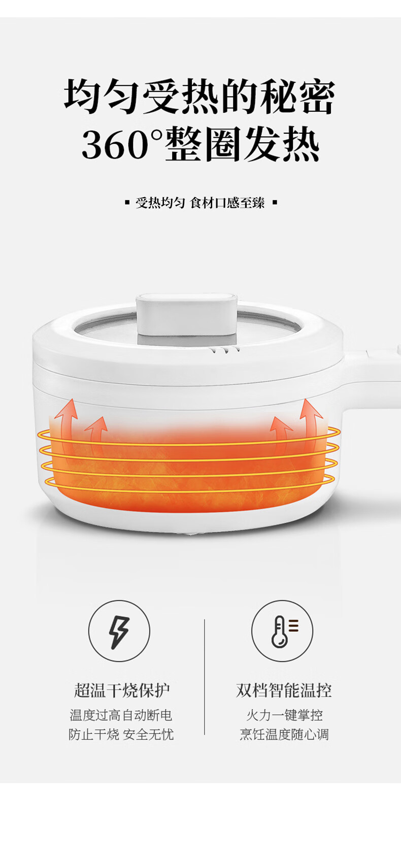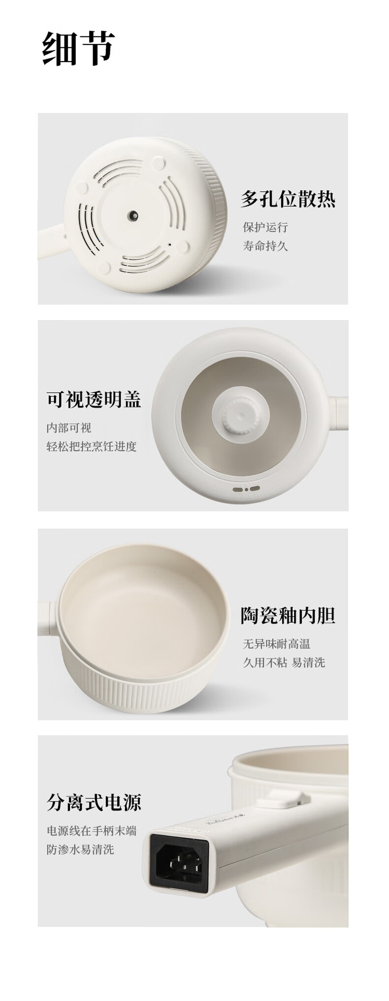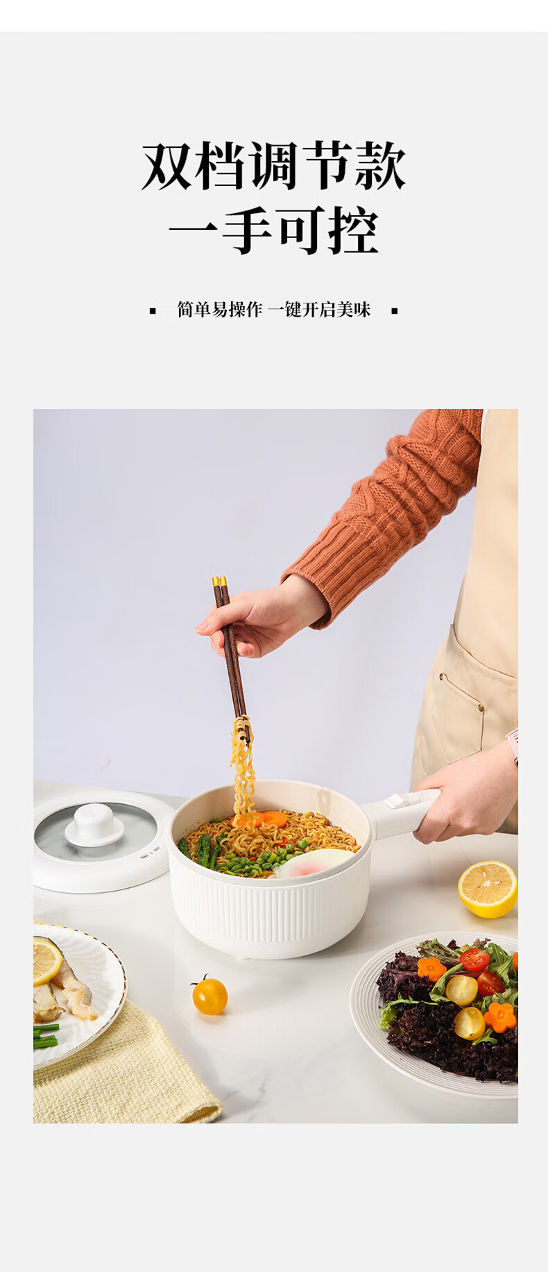 多功能设计,蒸煮煎炸、火锅、炒菜样样精通。;内胆采用白色不粘涂层,防粘锅。;配置食品级PP蒸笼,可蒸包子、鸡蛋等食物。;1.6L精致容量,刚好适合精致的你。