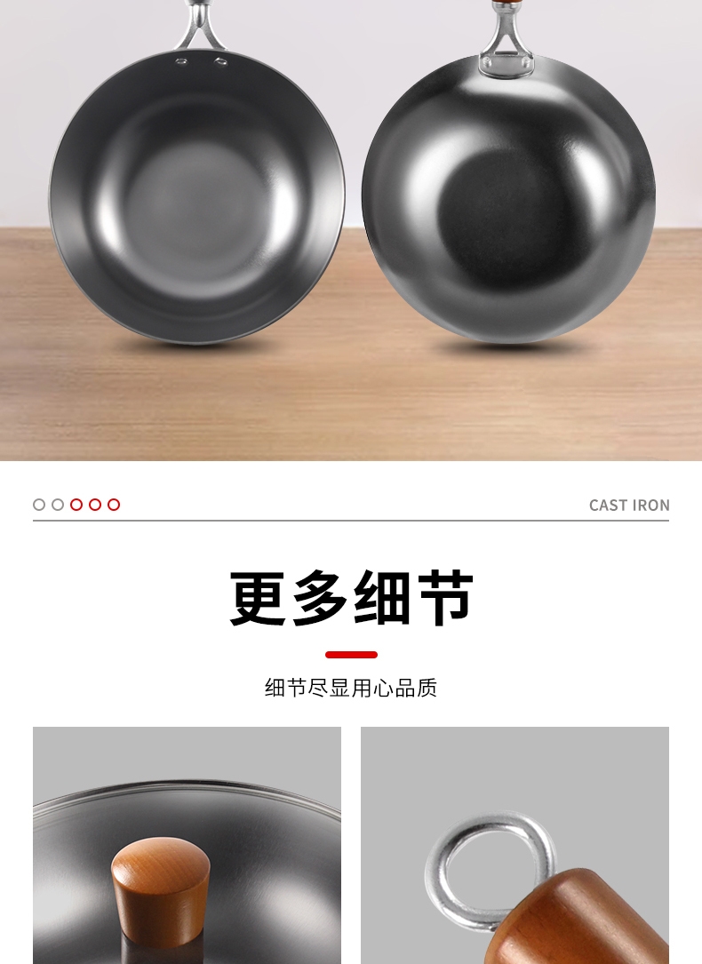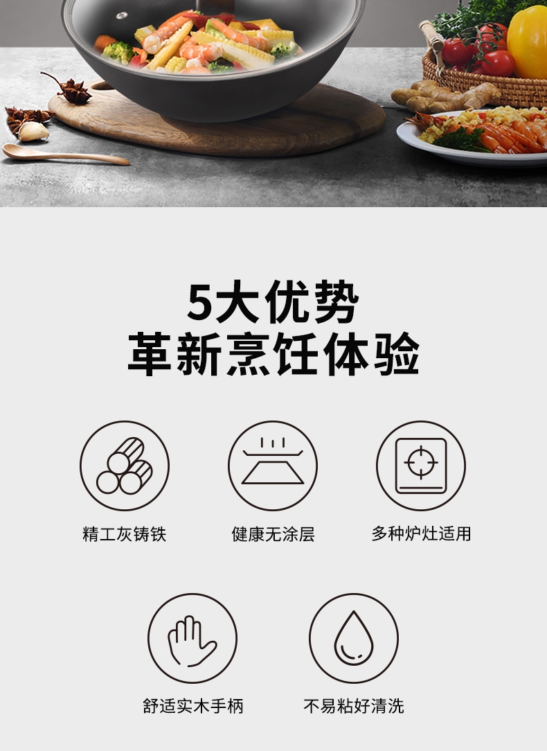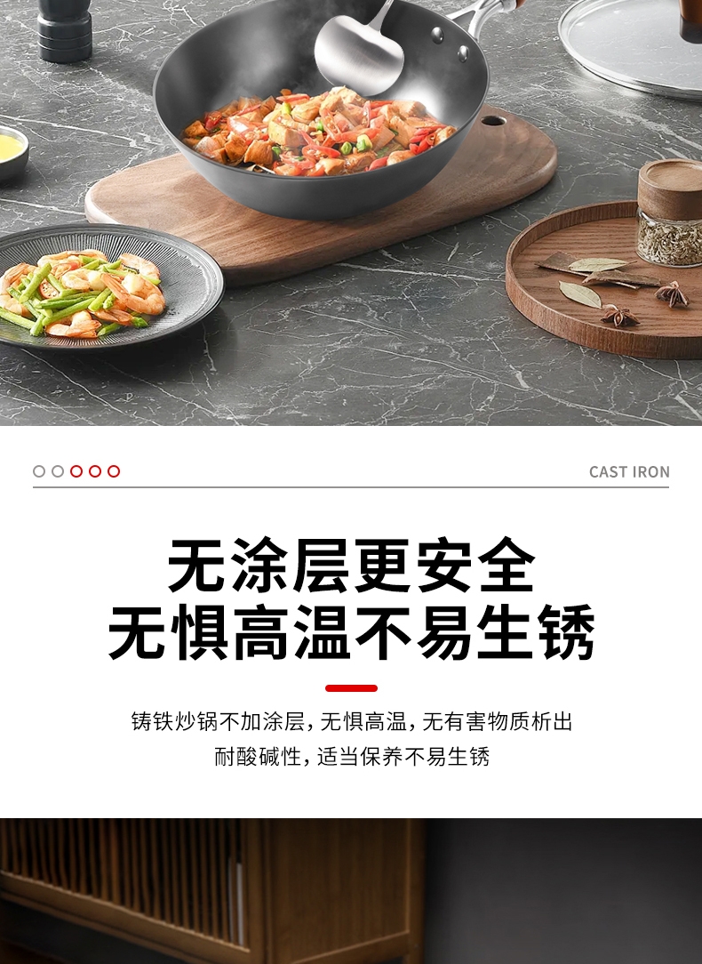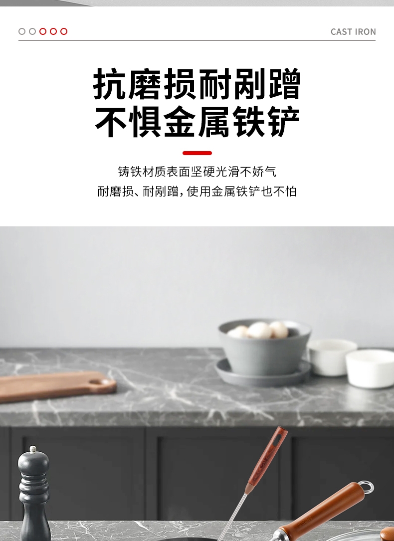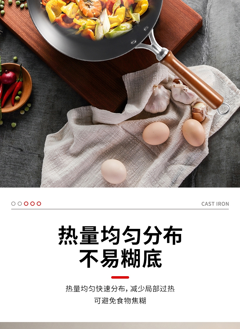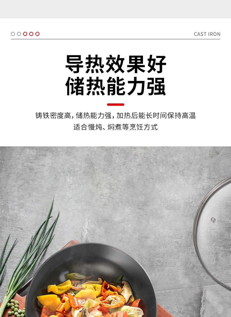 储热能力强:铸铁密度高,加热后能长时间保持高温;抗磨损性强:窒化处理后的的铸铁材质, 表面坚硬光滑;无化学涂层:天然材质不含PFOA等有害物质