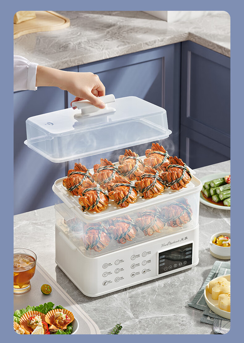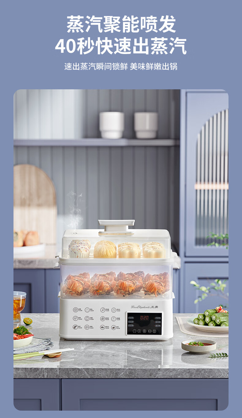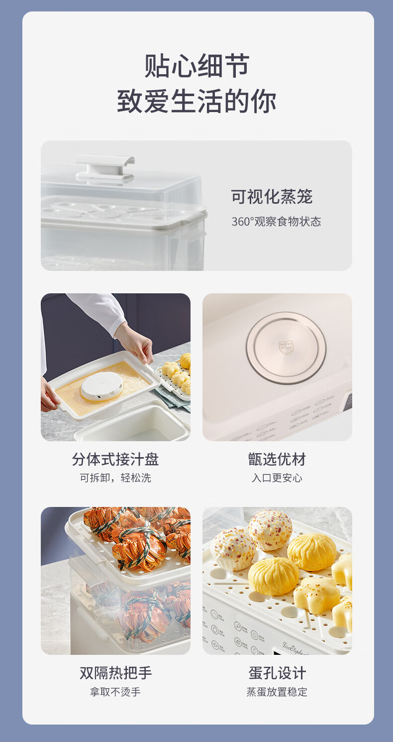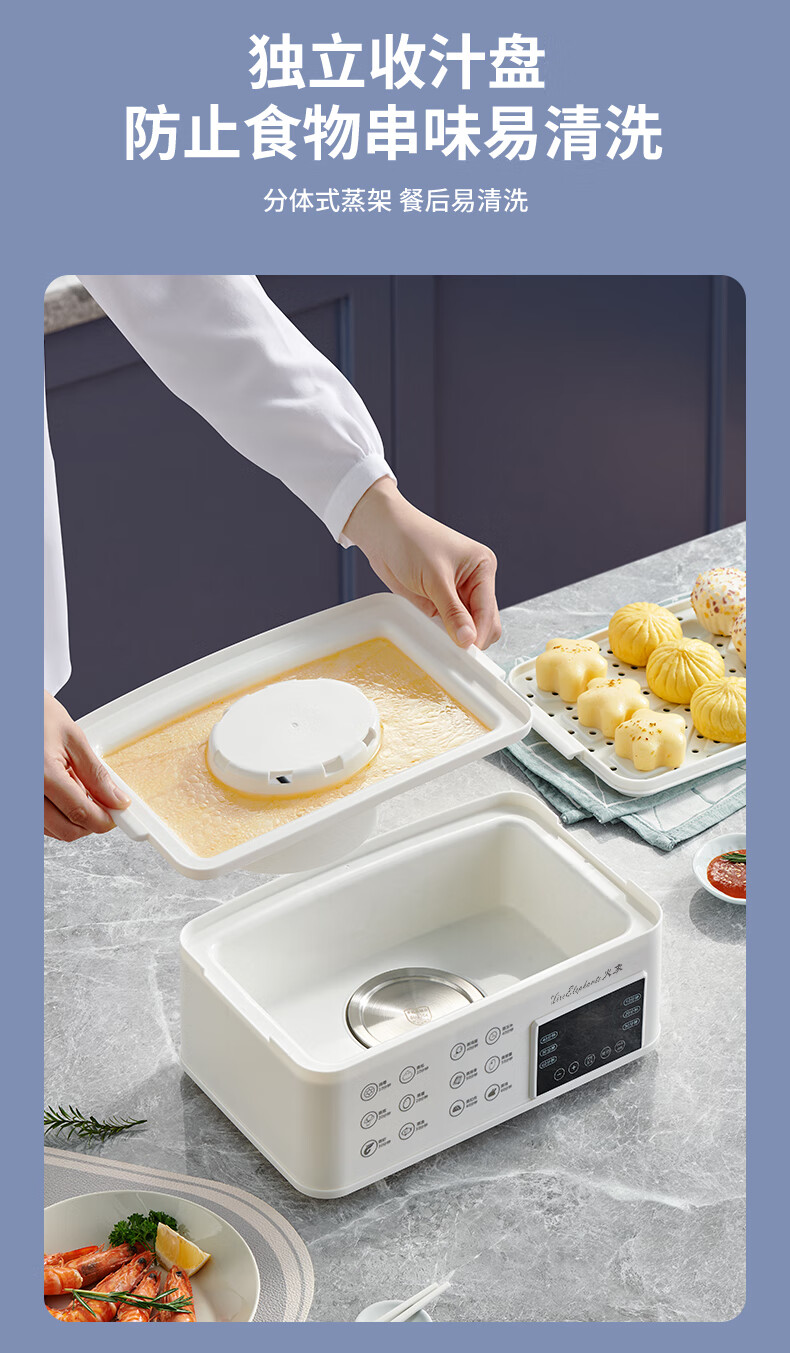 透明可视蒸盖,食物烹饪一目了然;设有独立收汁盘,防止食物串味,清洗更轻松;;锅中设有蒸汽聚能罩,40秒快速出蒸汽;