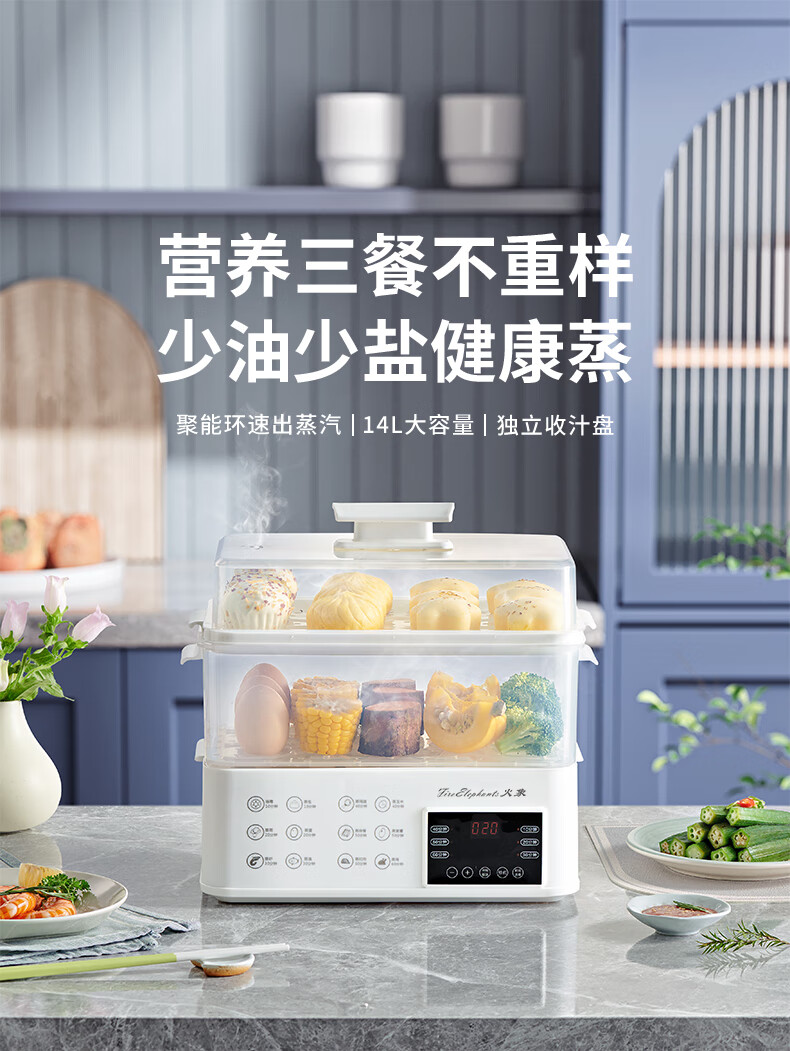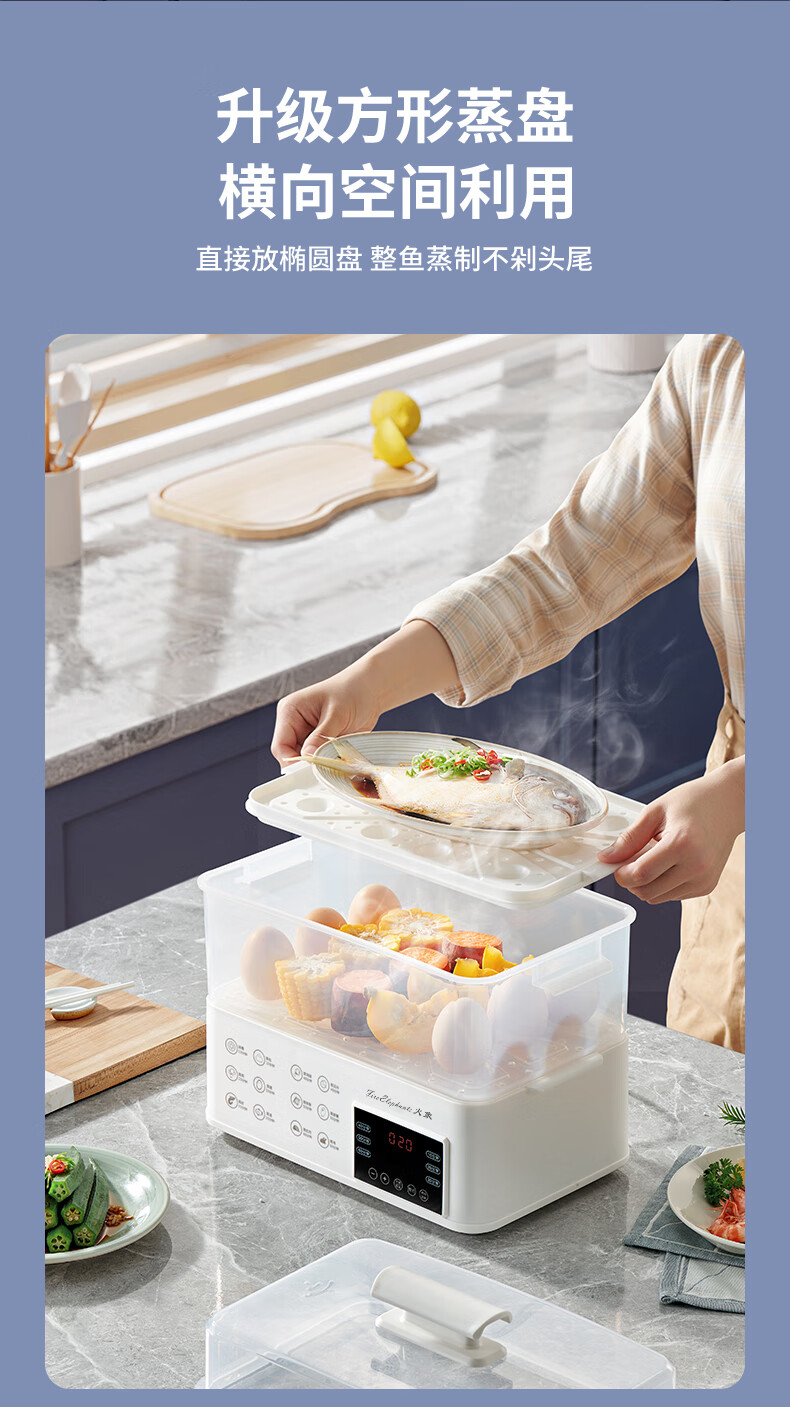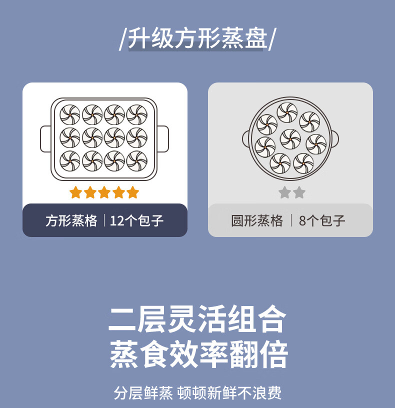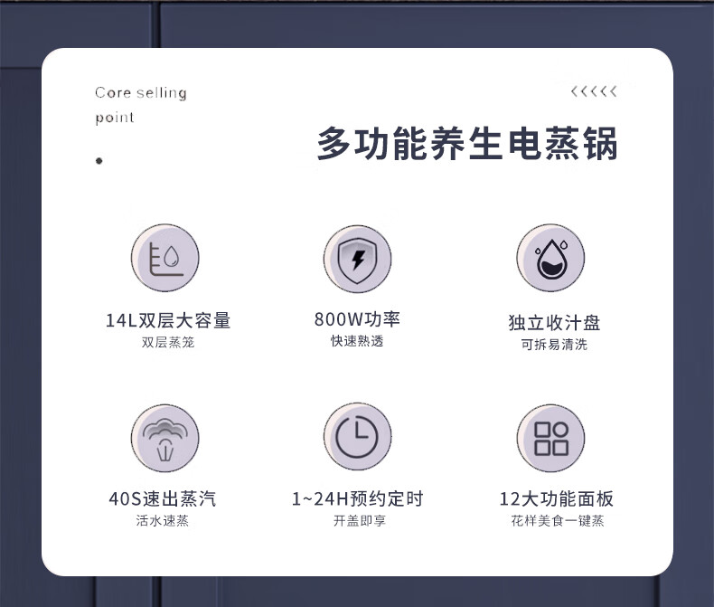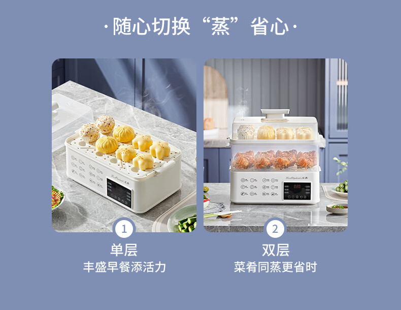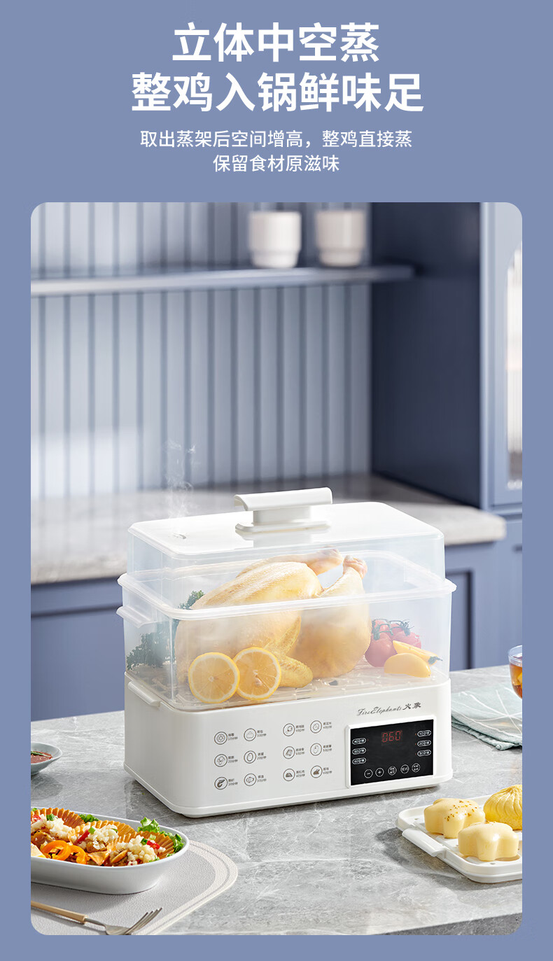 透明可视蒸盖,食物烹饪一目了然;设有独立收汁盘,防止食物串味,清洗更轻松;;锅中设有蒸汽聚能罩,40秒快速出蒸汽;
