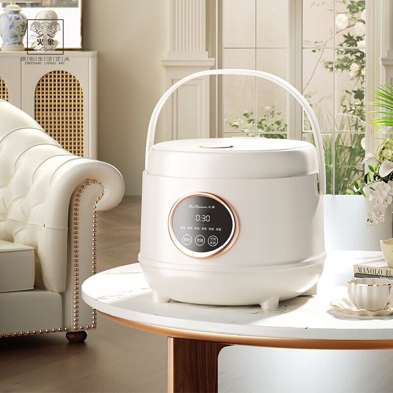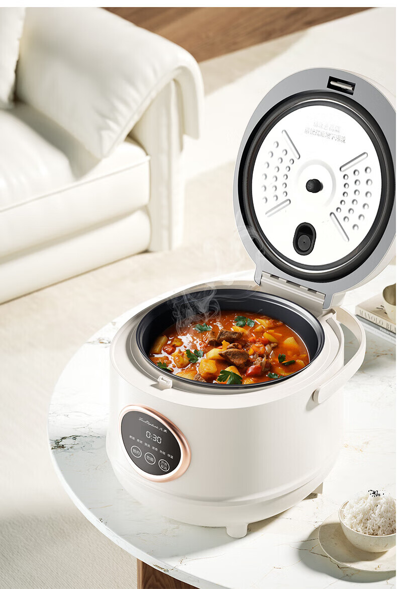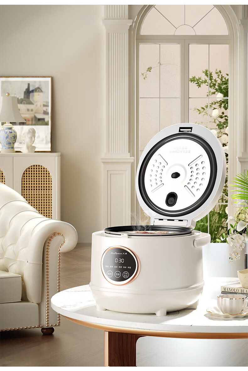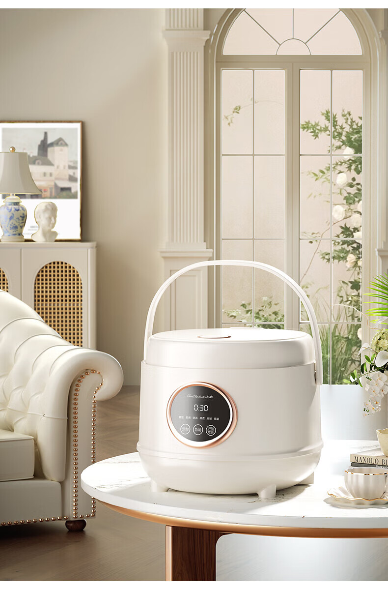 半圆提手设计,符合人体工学,轻松提拿;;轻触按键设计, . 微电脑控制,使用简单方便;;高密度发热盘,铝合金加厚内胆