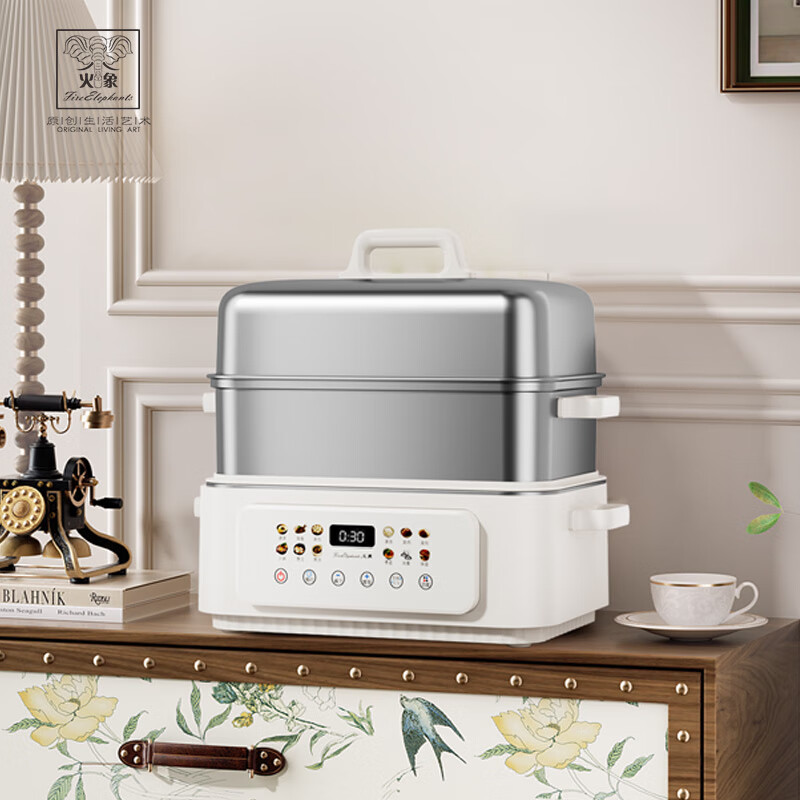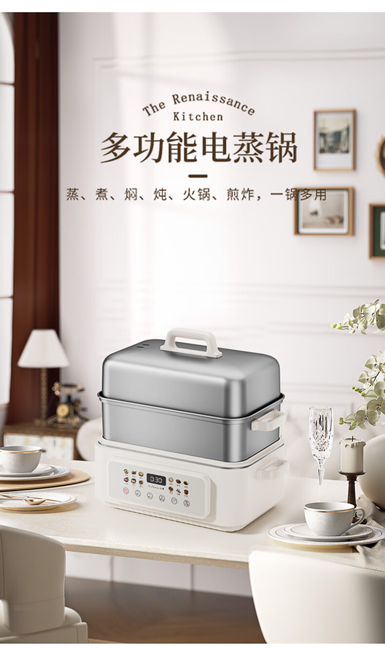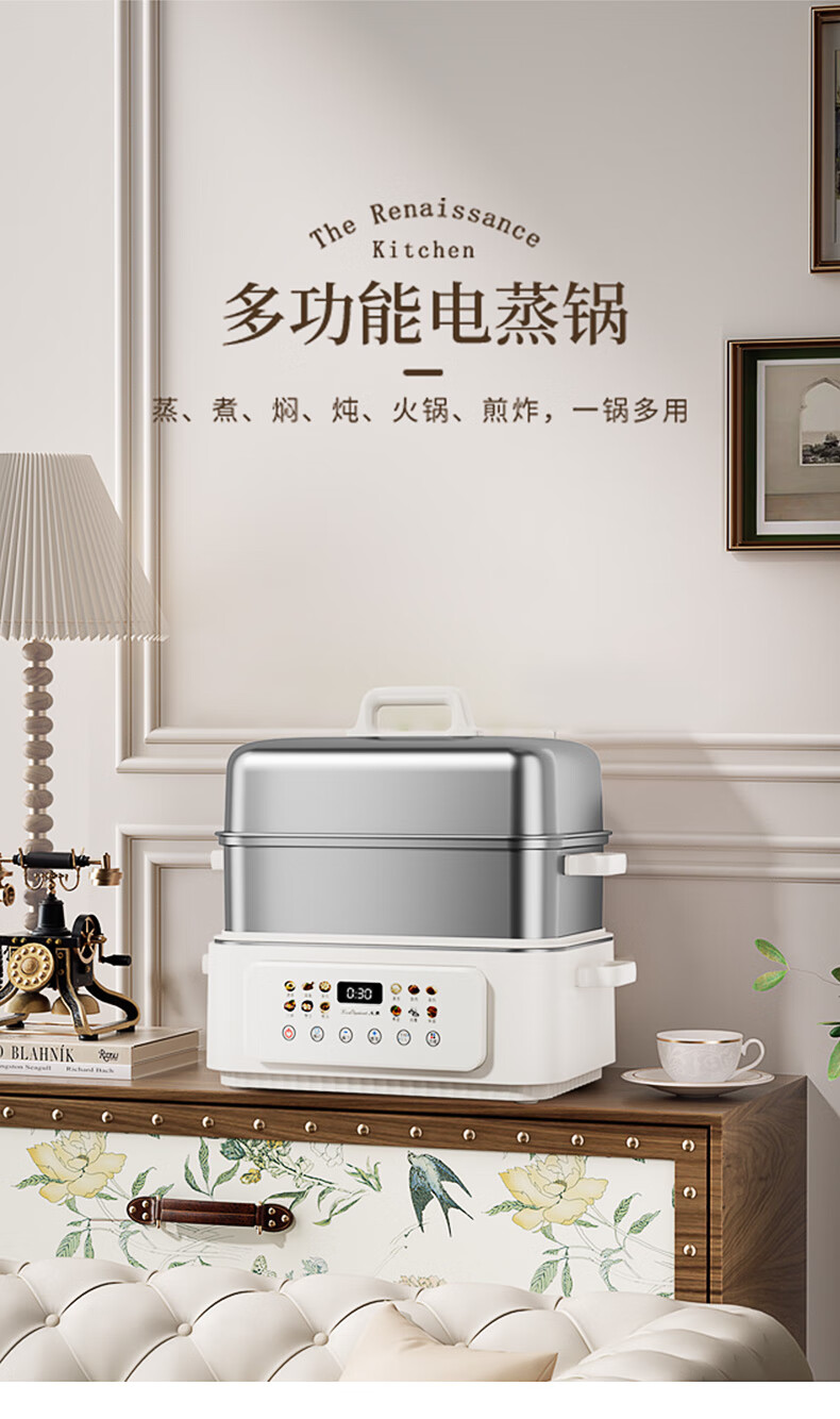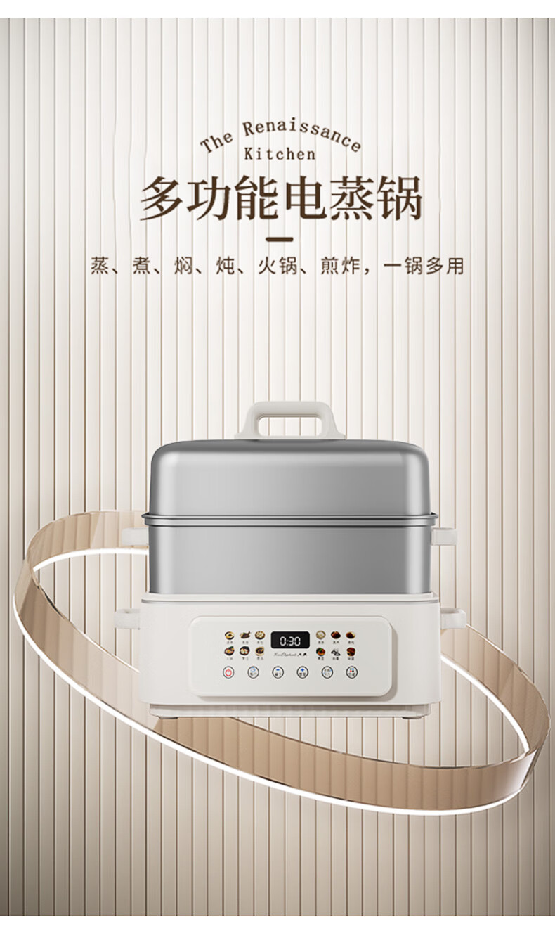 蒸、煮、焖、炖、火锅、煎炸,一锅多用;;蒸笼分体组合设计,清洗更方便;;可定时、可预约、带保温,全自动蒸煮;