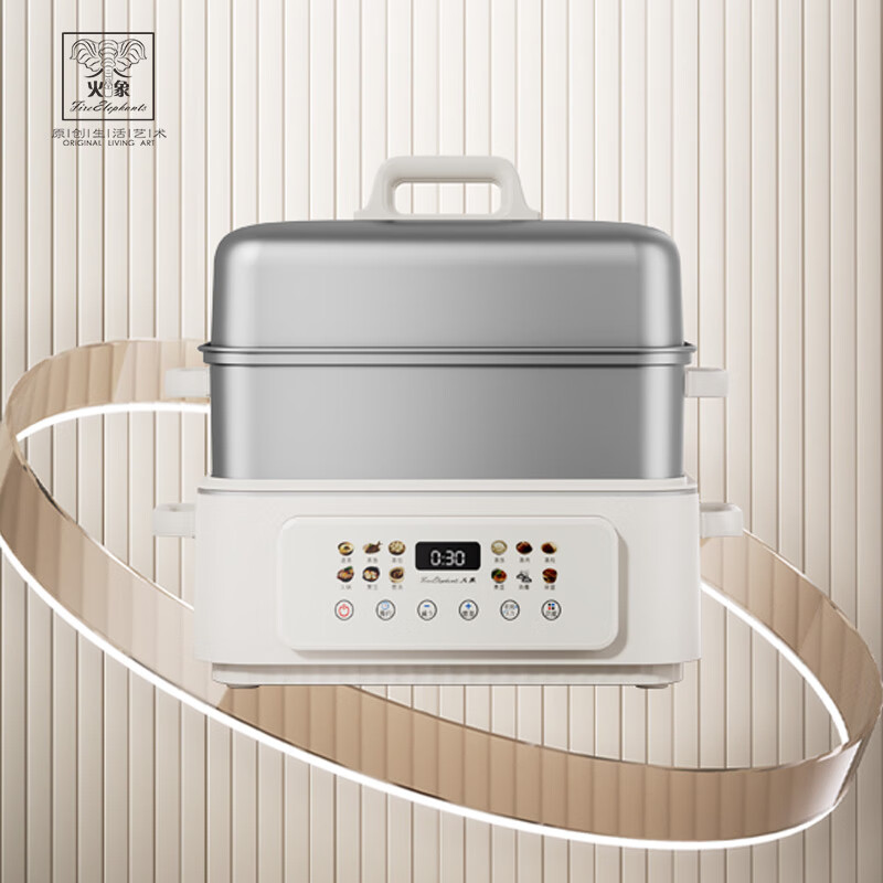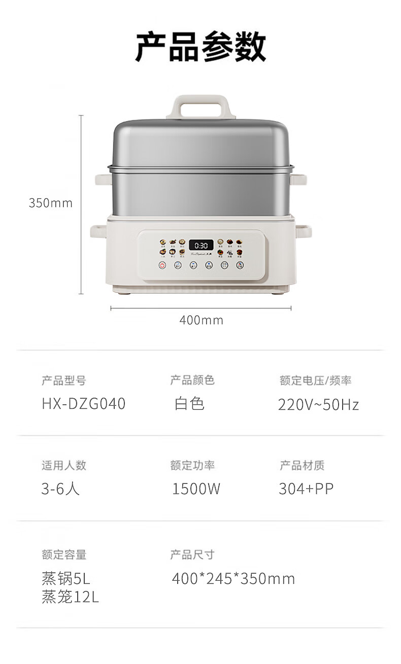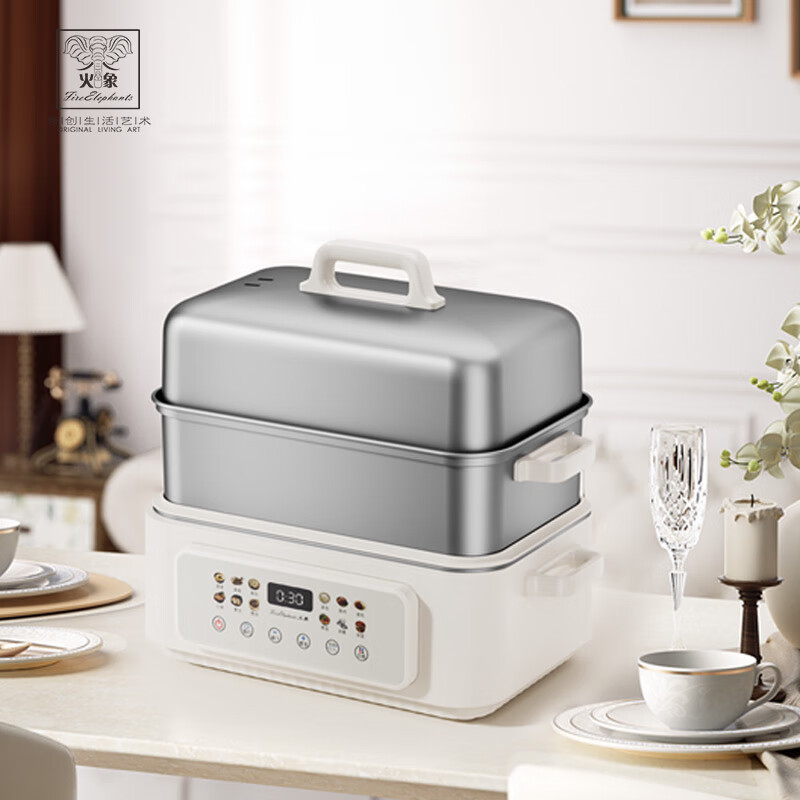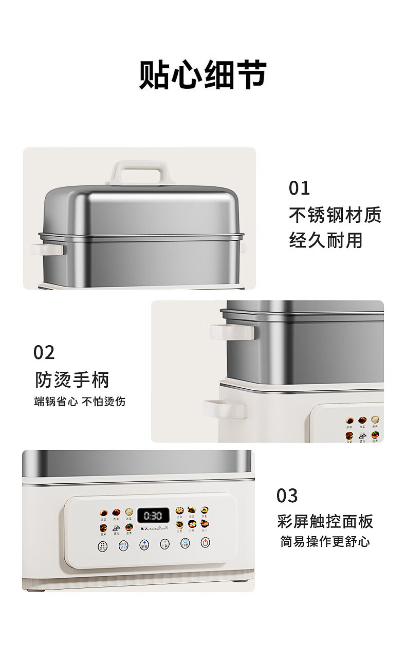 蒸、煮、焖、炖、火锅、煎炸,一锅多用;;蒸笼分体组合设计,清洗更方便;;可定时、可预约、带保温,全自动蒸煮;