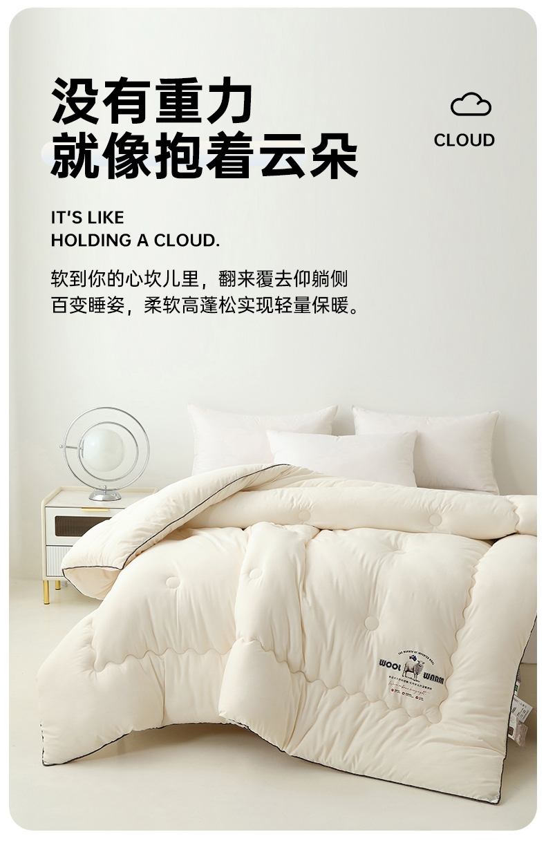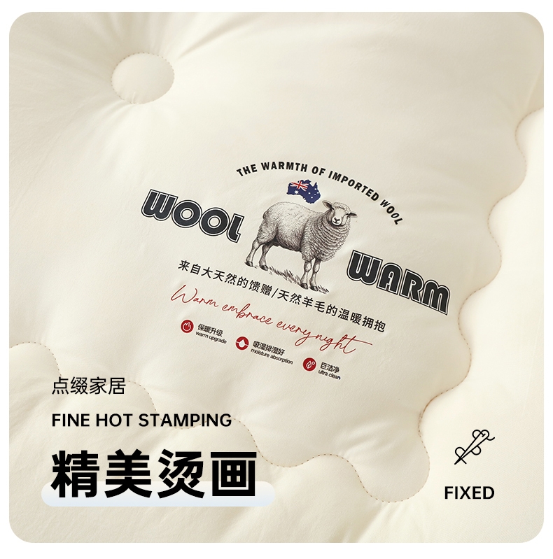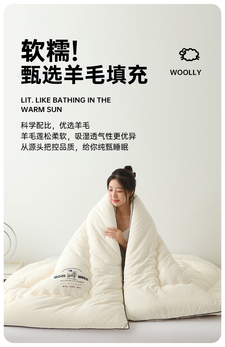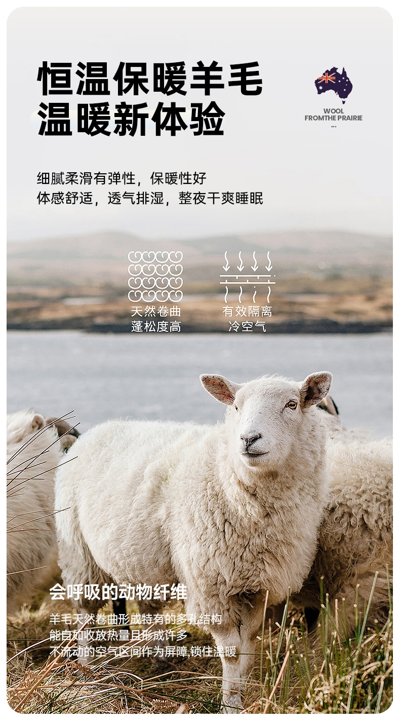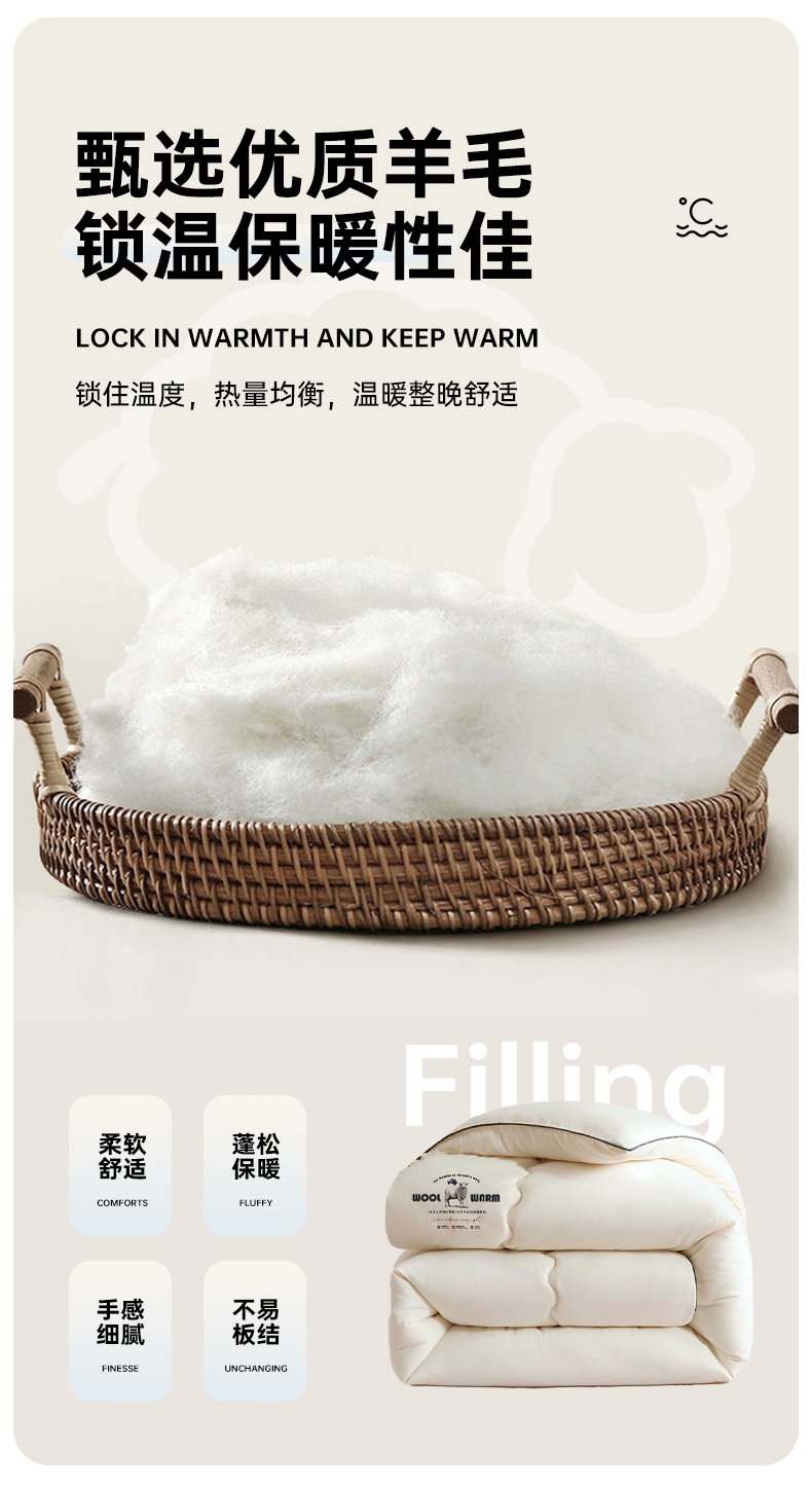甄选羊毛填充,科学配比;羊毛蓬松柔软,吸湿透气性更优异;暖感轻盈入梦,面包般松软