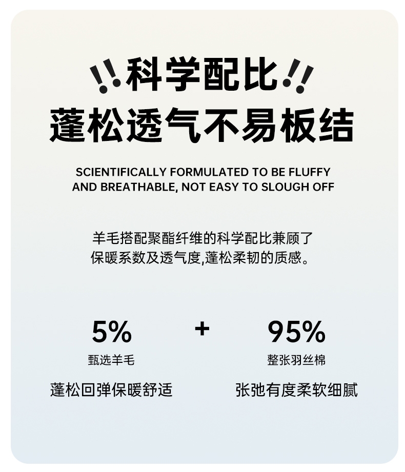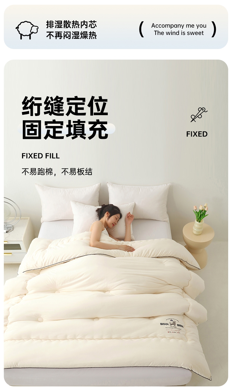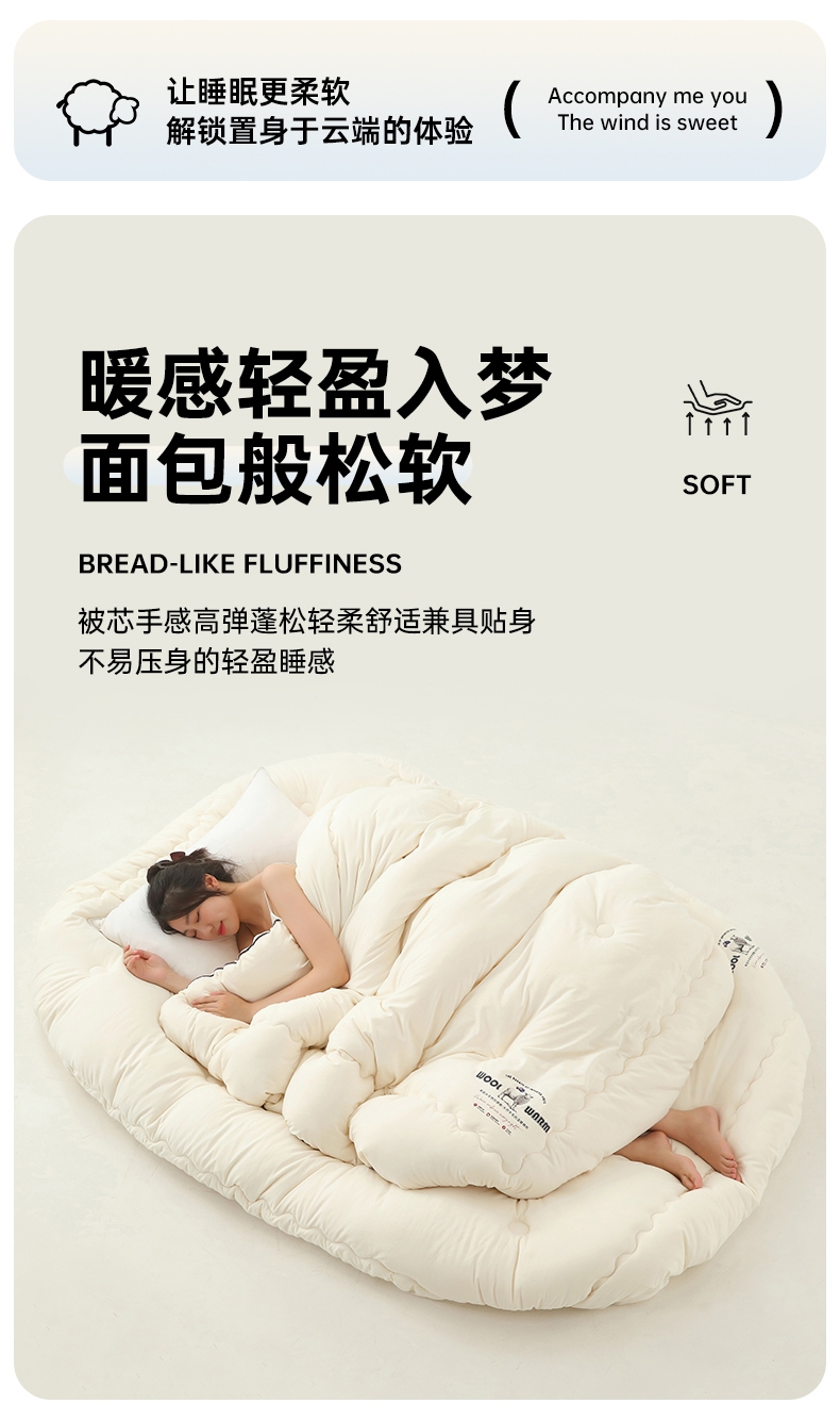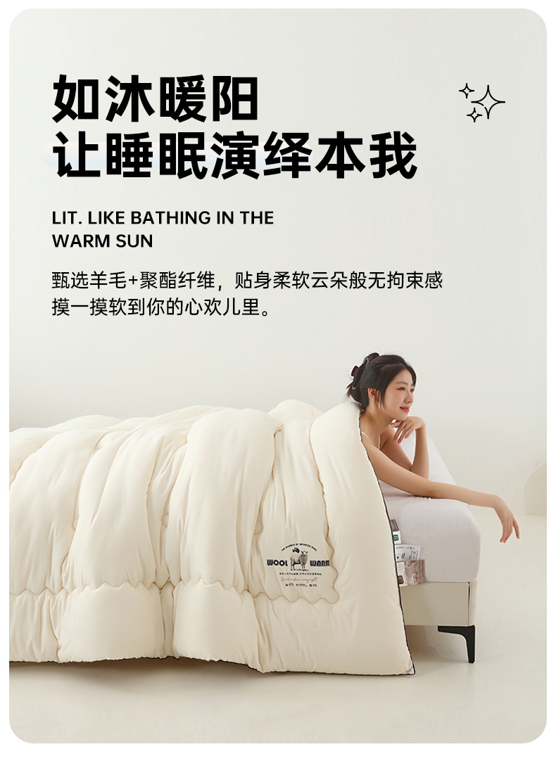 甄选羊毛填充,科学配比;羊毛蓬松柔软,吸湿透气性更优异;暖感轻盈入梦,面包般松软