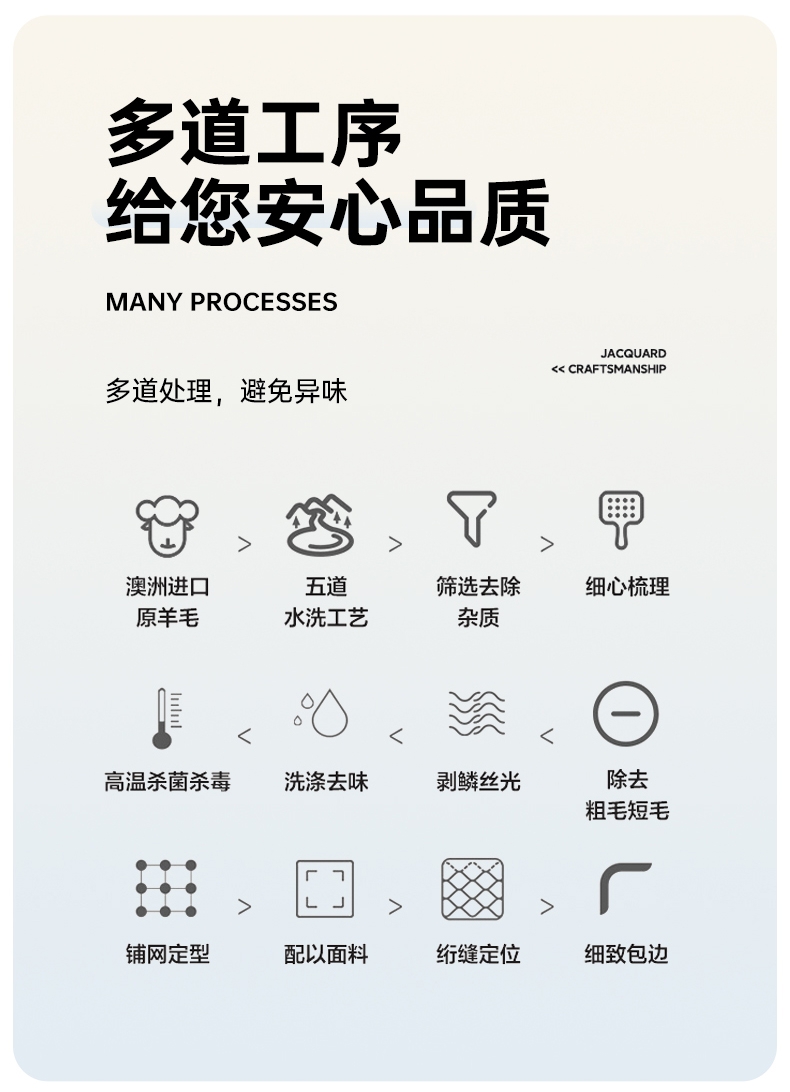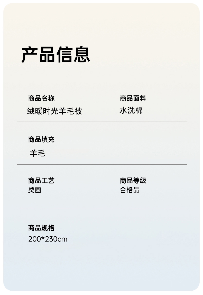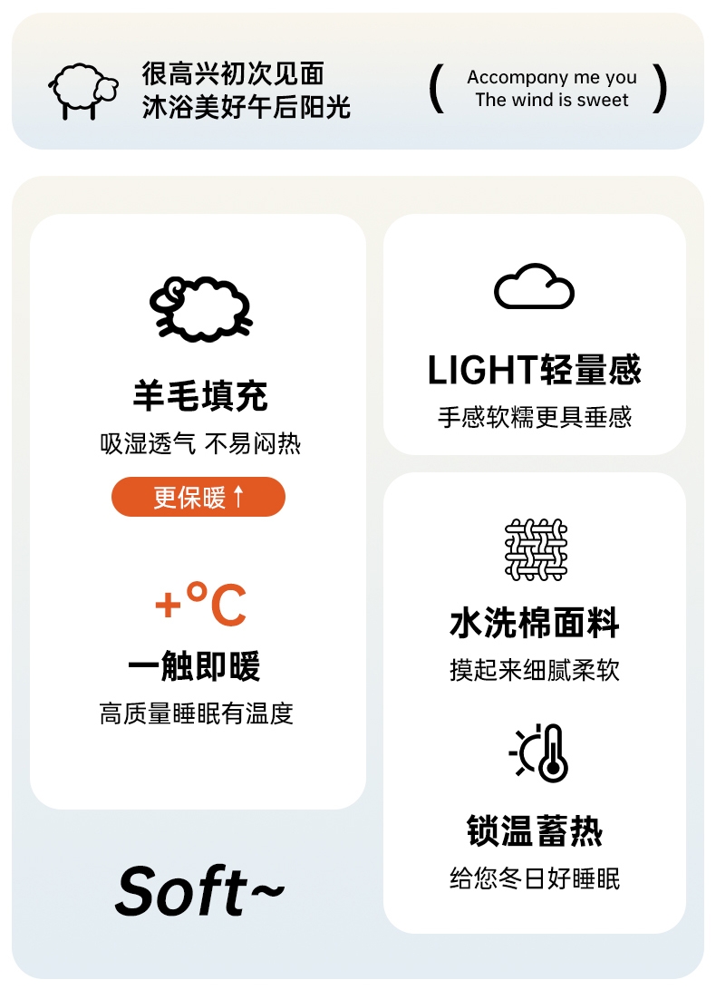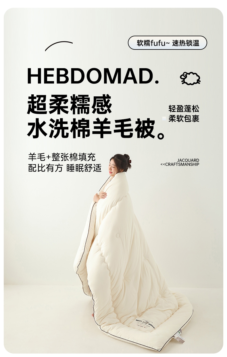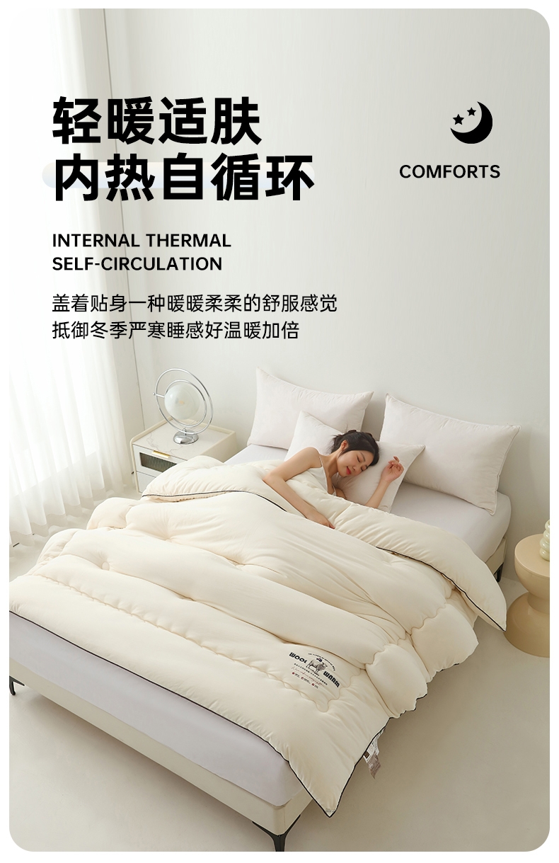 甄选羊毛填充,科学配比;羊毛蓬松柔软,吸湿透气性更优异;暖感轻盈入梦,面包般松软