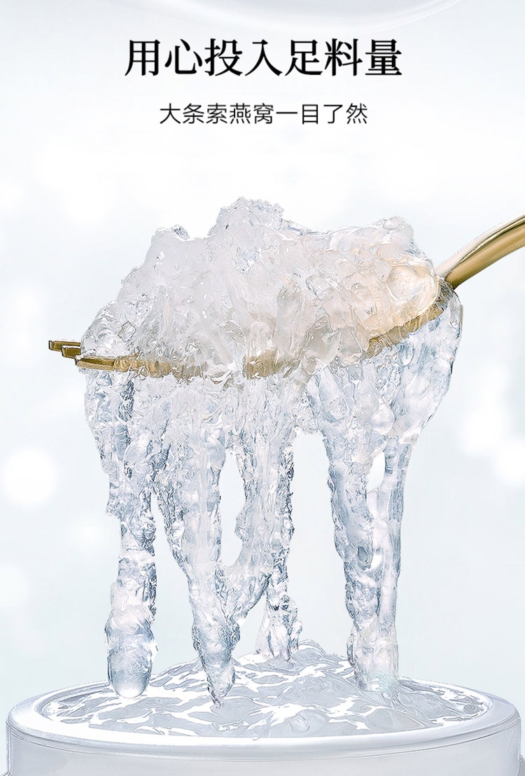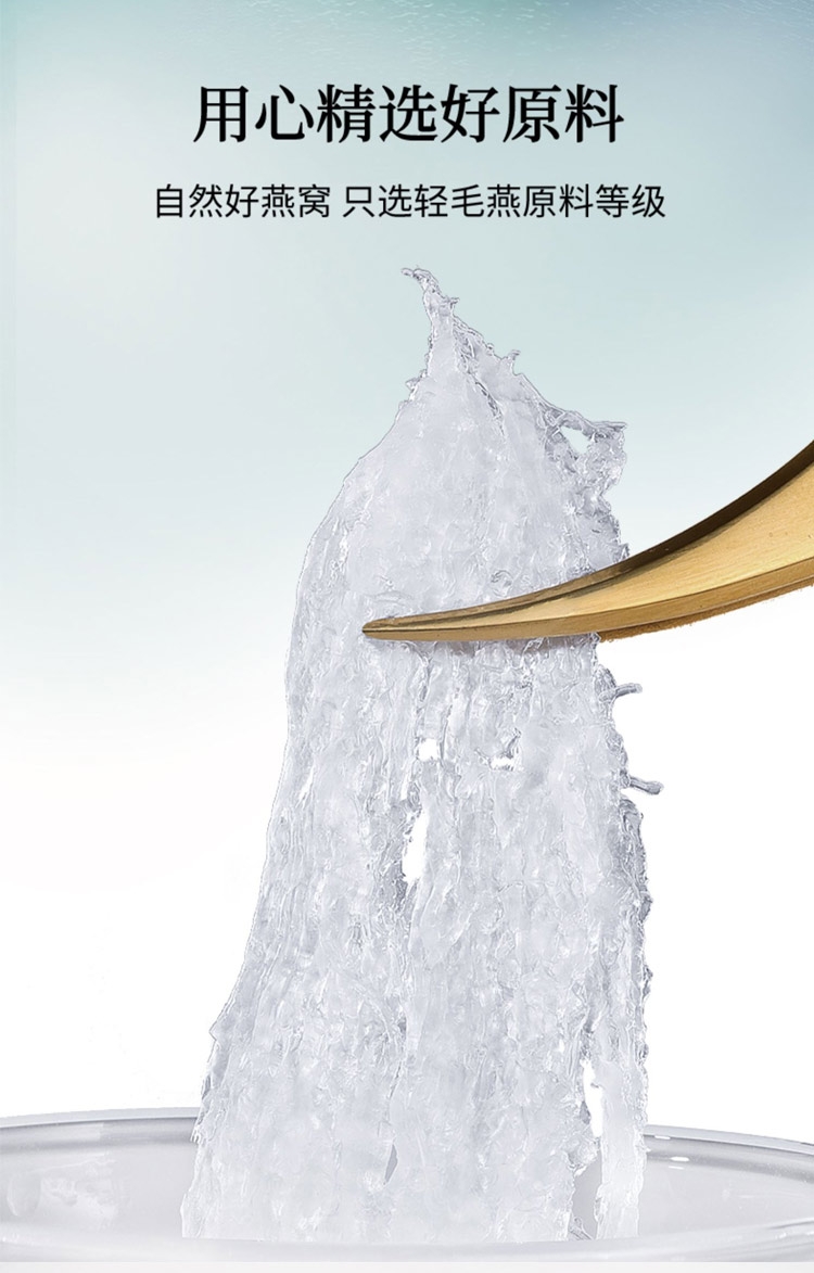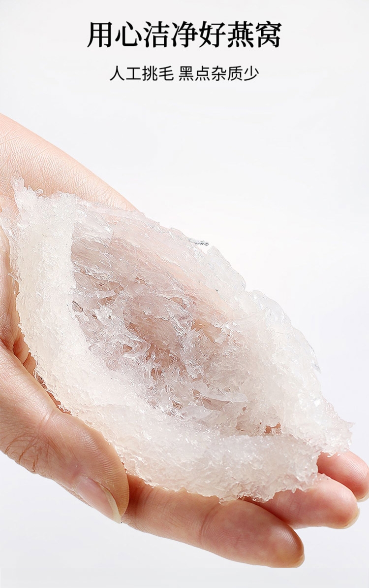 用心把控品质拒配料只有水、冰糖、燕窝;用心精选好原料,自然好燕窝 只选轻毛燕原料等级;人工挑毛 黑点杂质少