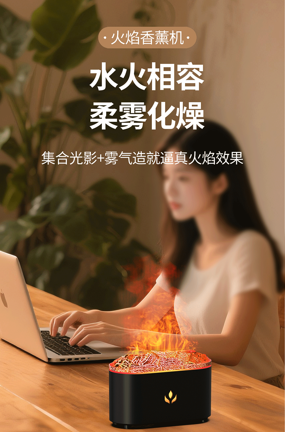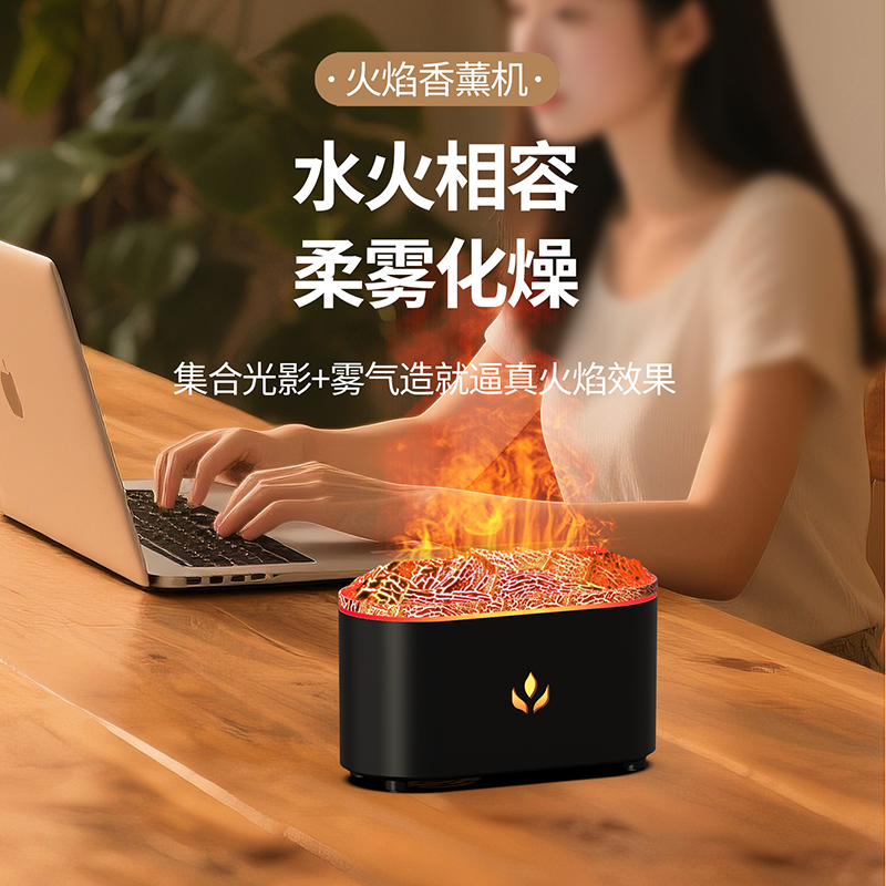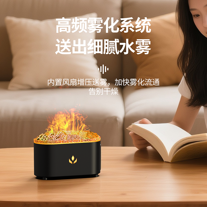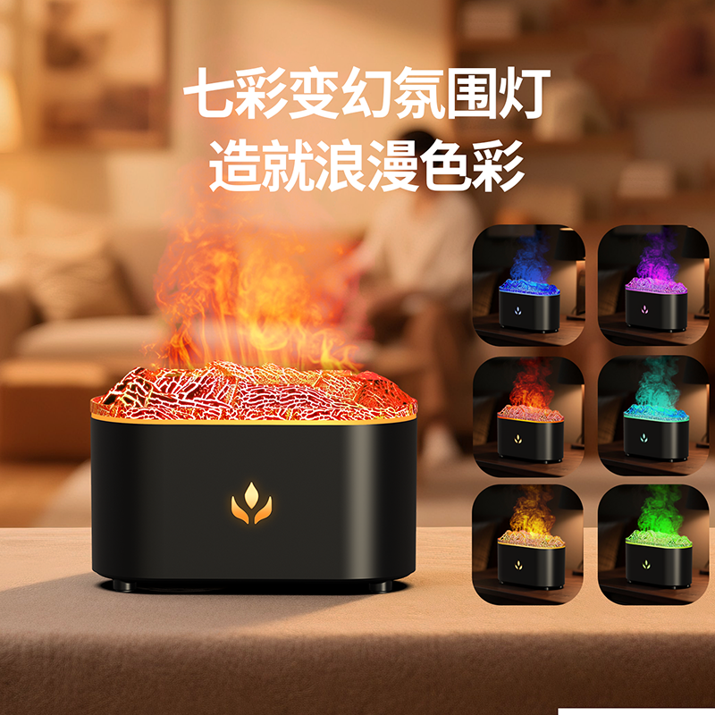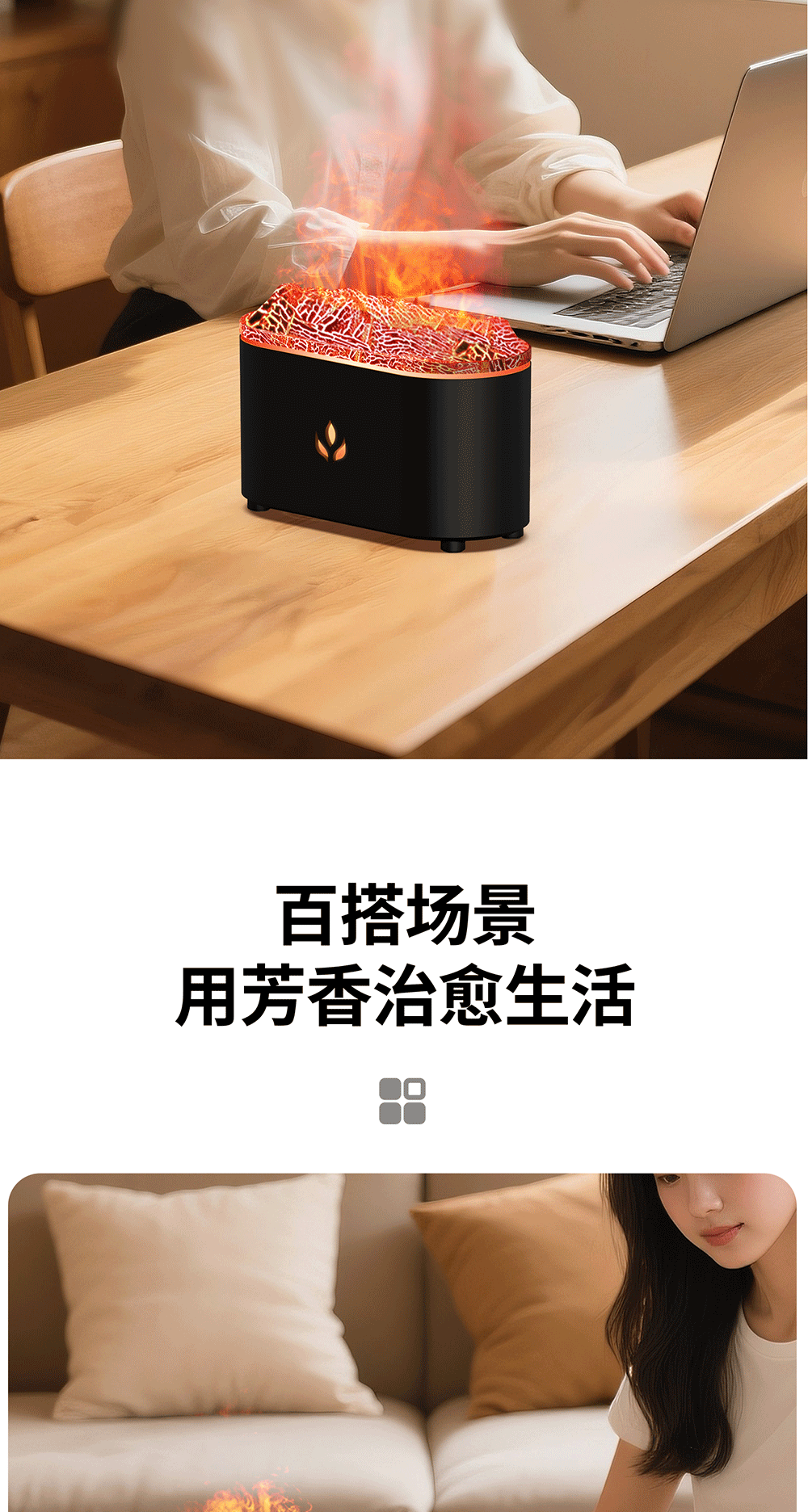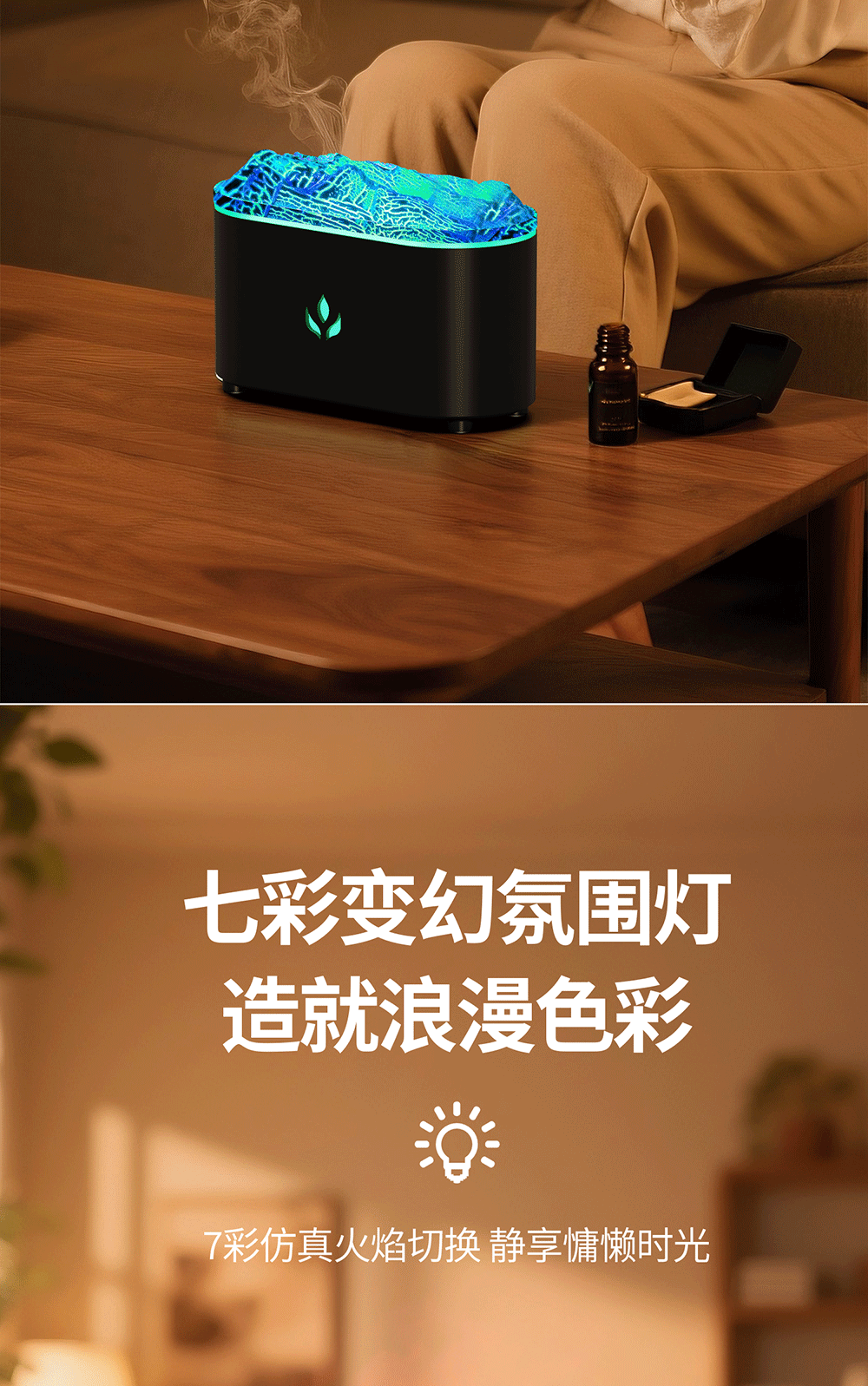 火焰喷雾,七彩灯光;内置风扇增压送雾,加快雾化流通;可添加香薰,持久清香