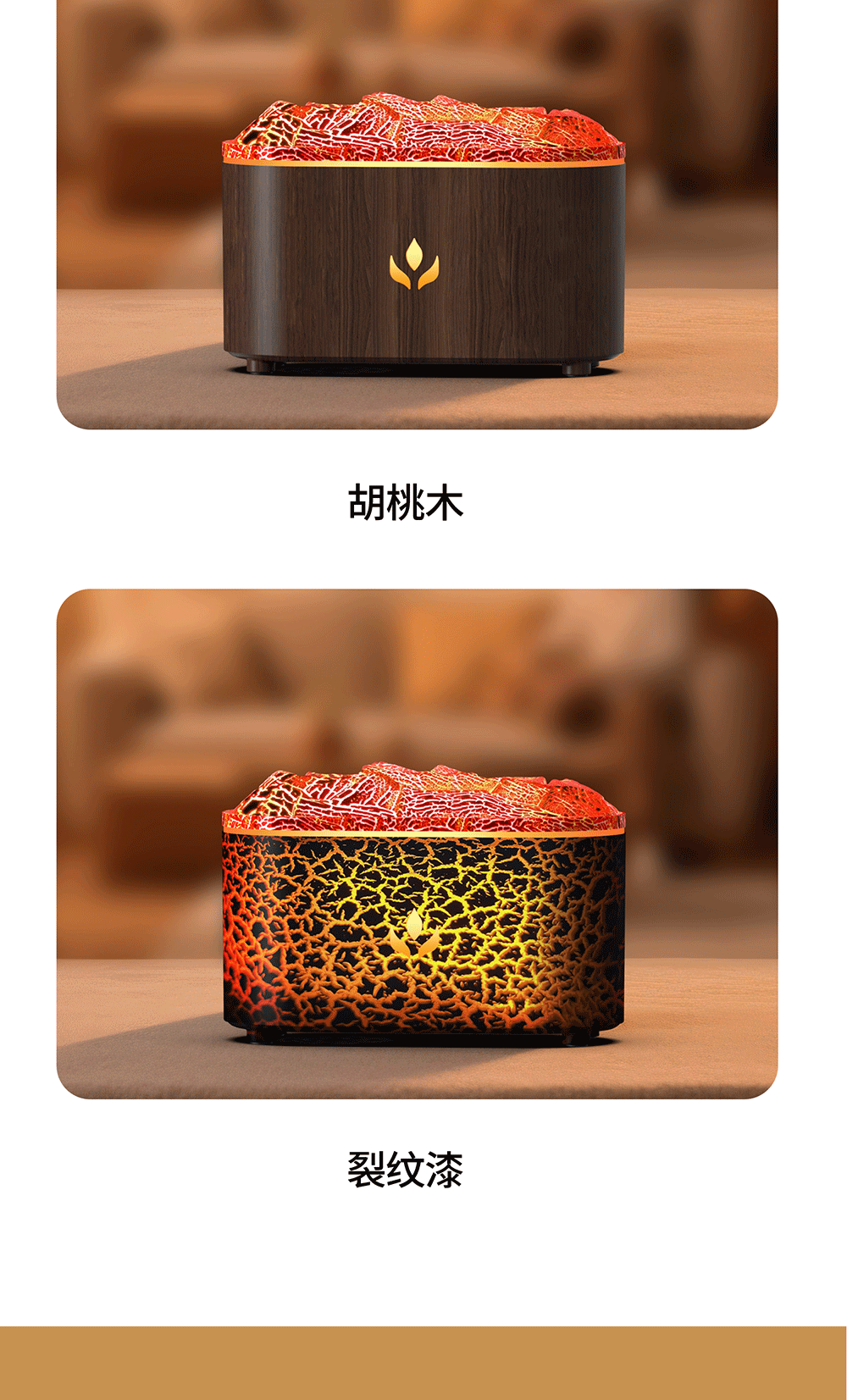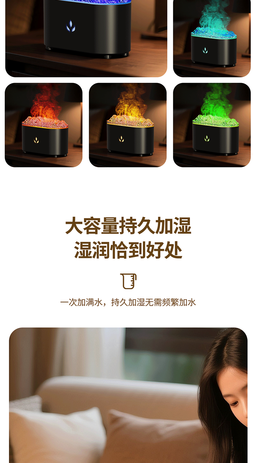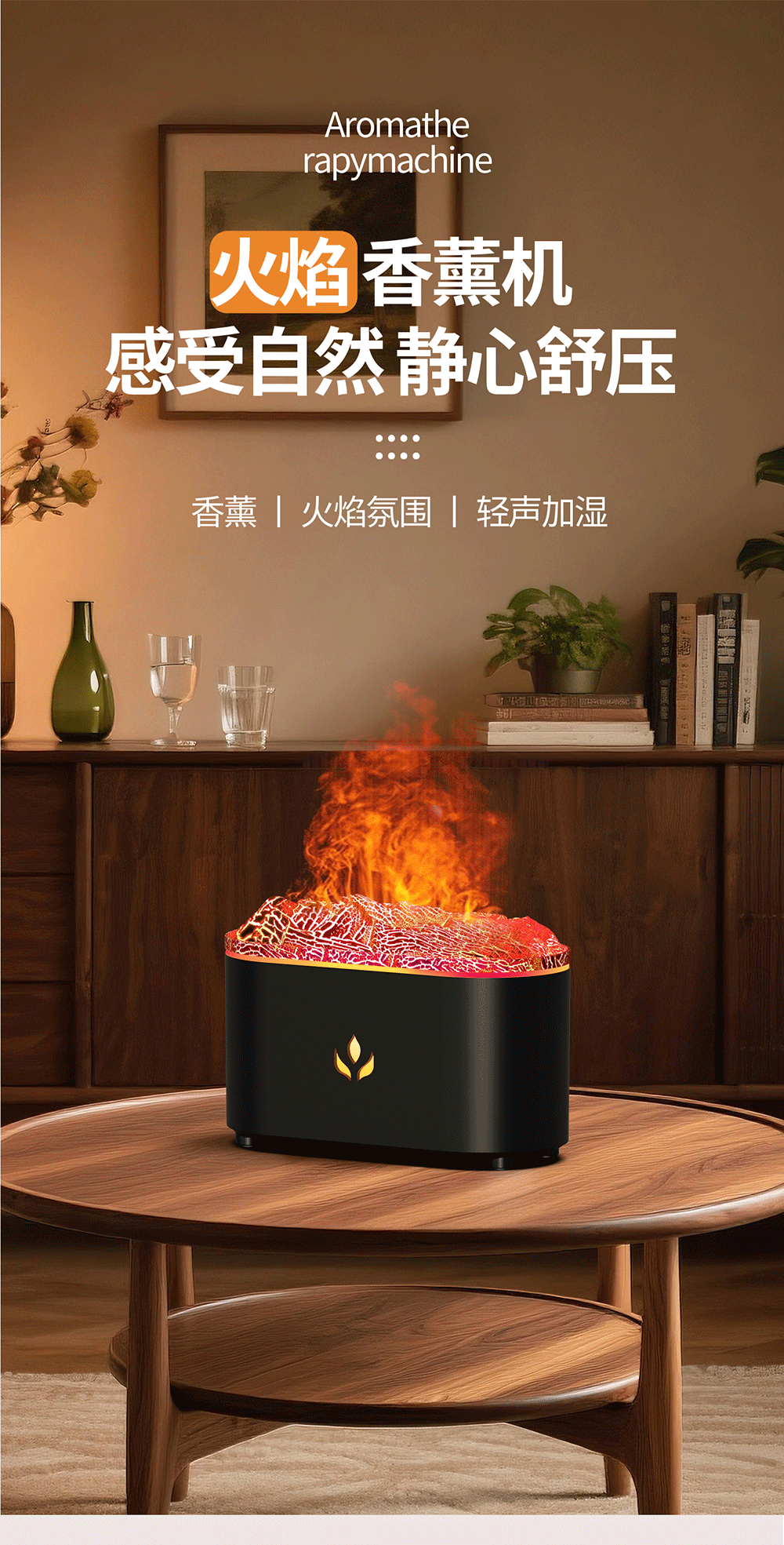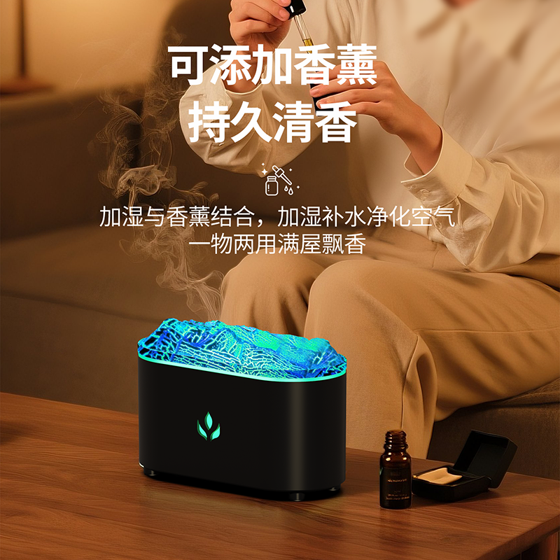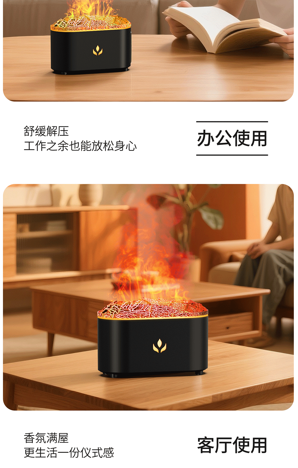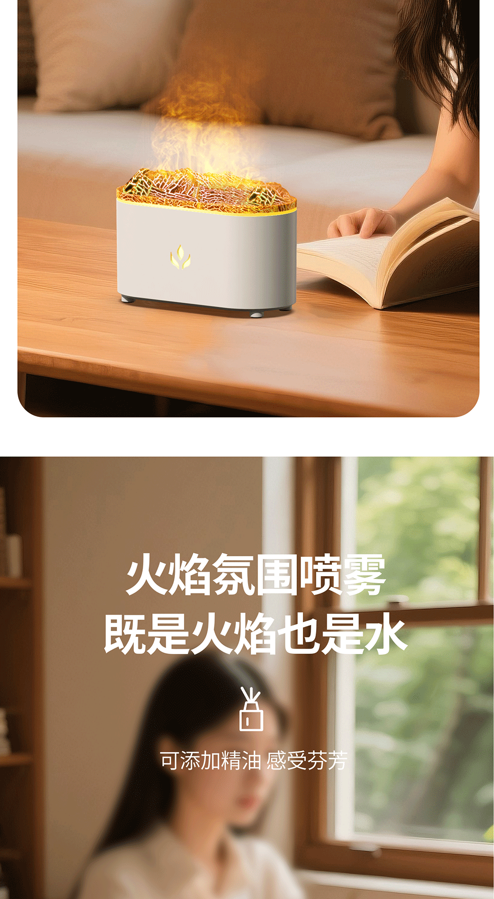 火焰喷雾,七彩灯光;内置风扇增压送雾,加快雾化流通;可添加香薰,持久清香