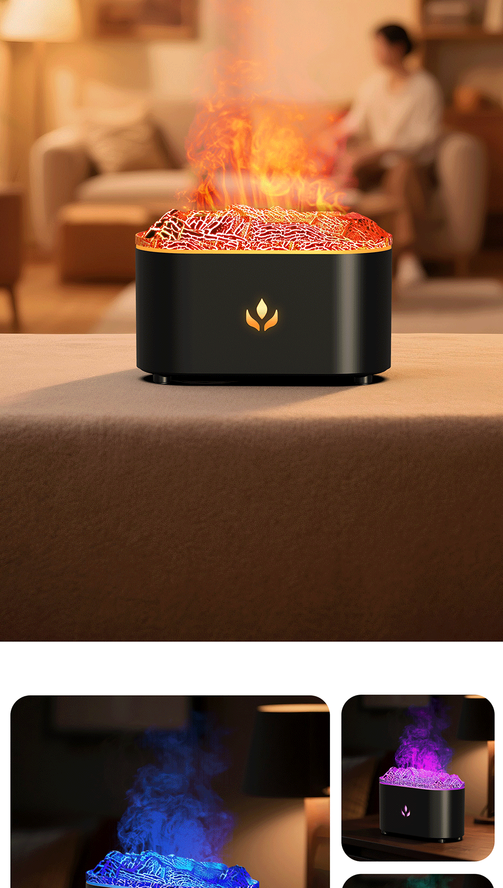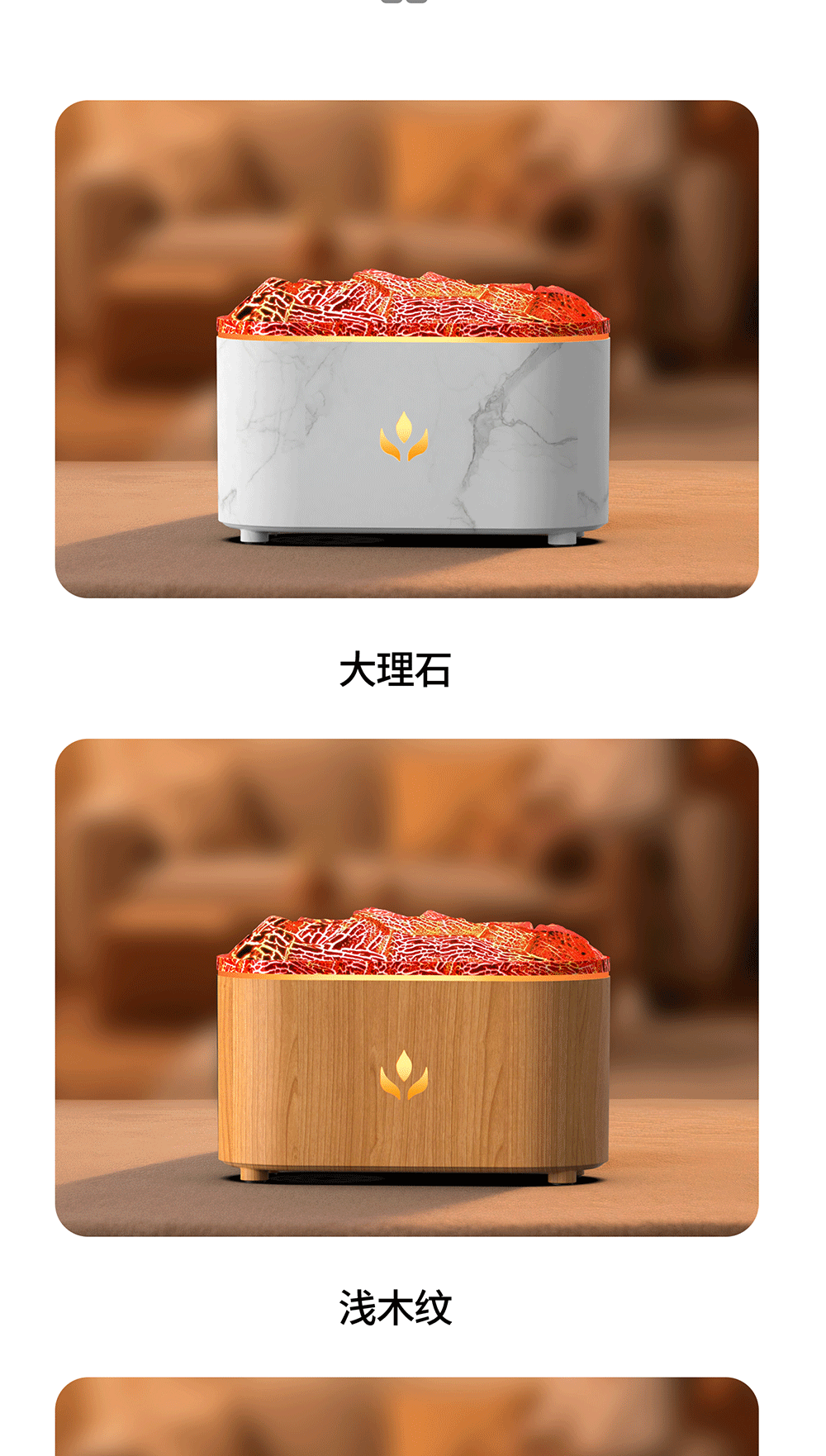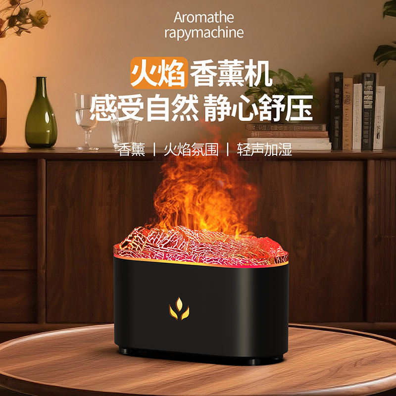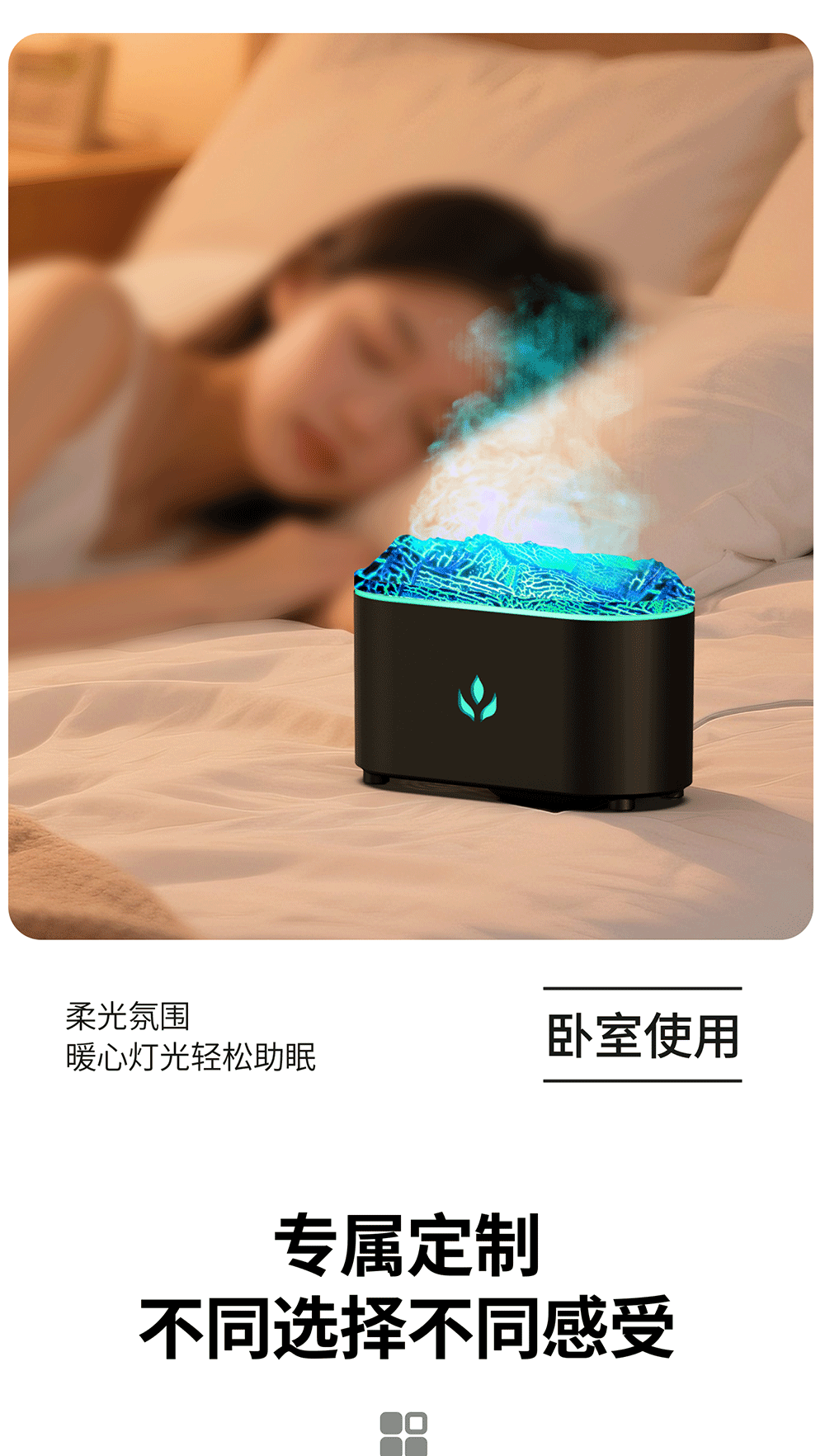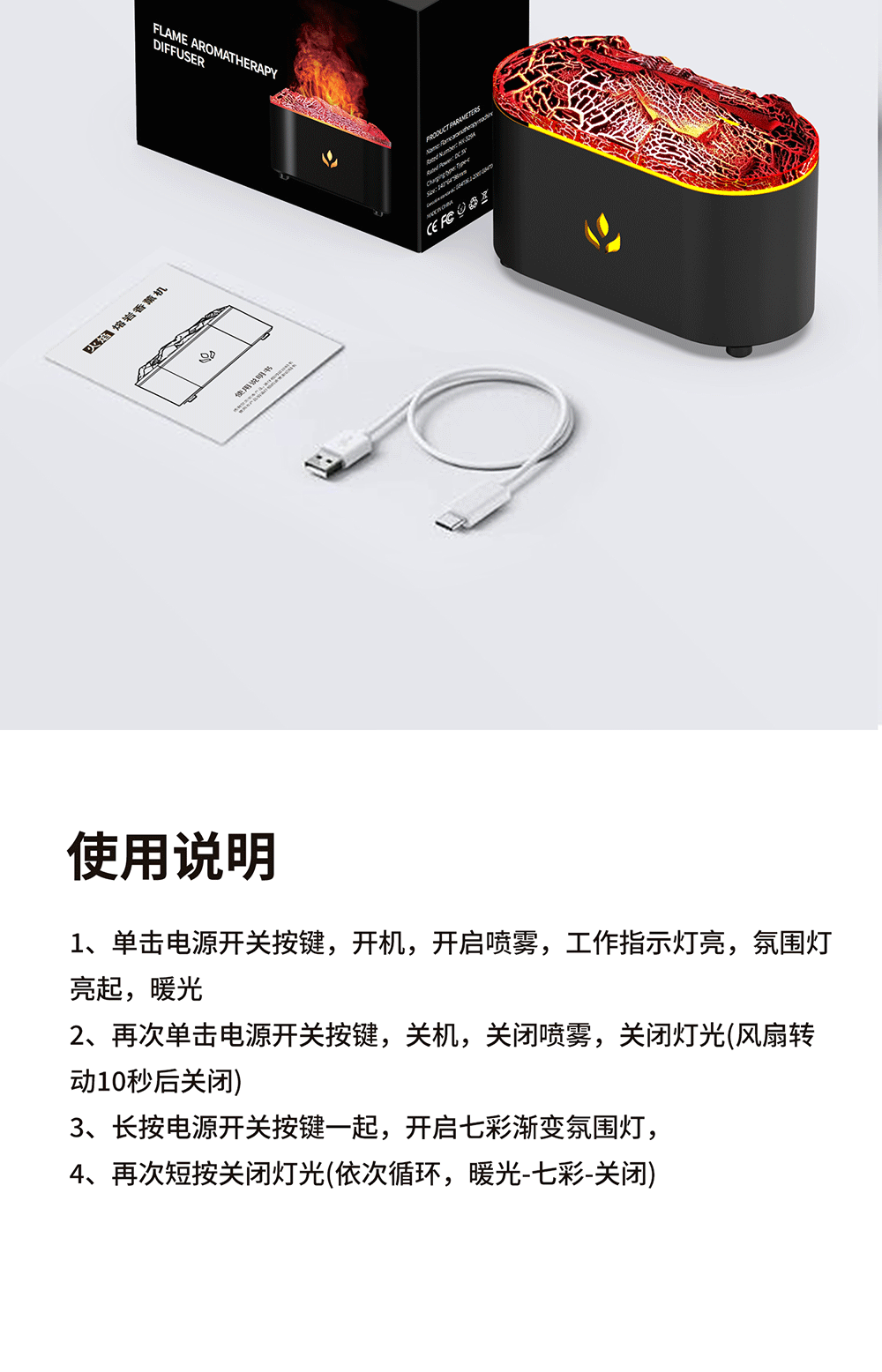 火焰喷雾,七彩灯光;内置风扇增压送雾,加快雾化流通;可添加香薰,持久清香