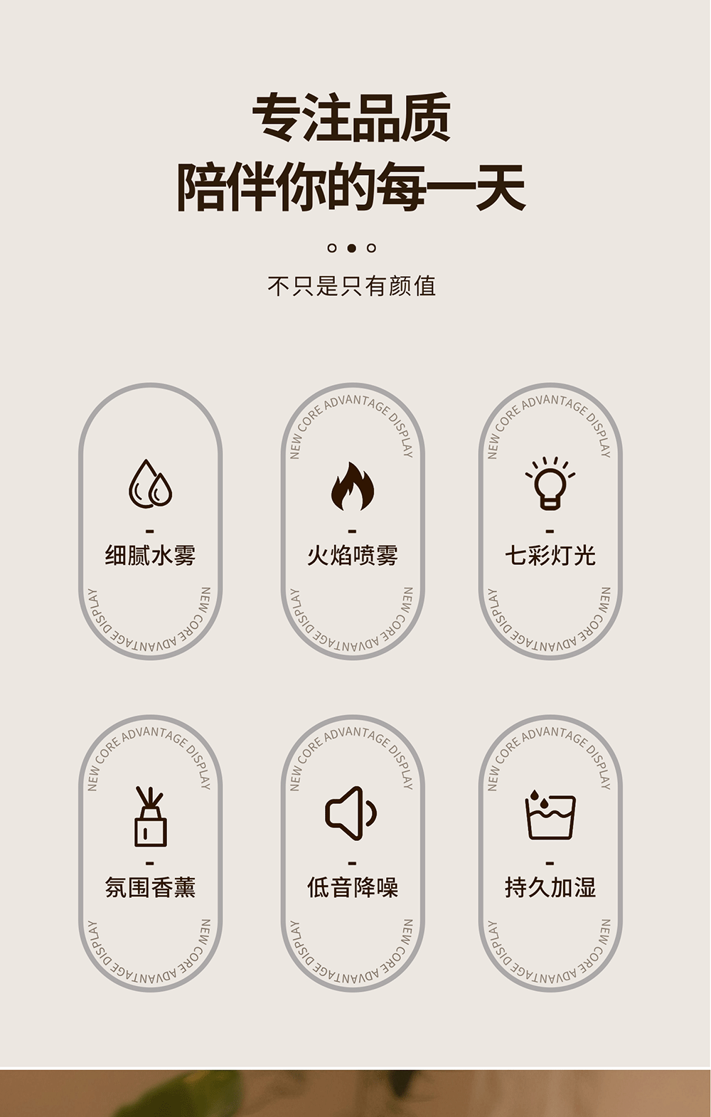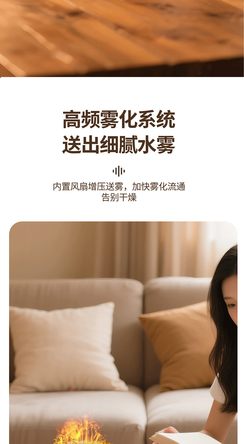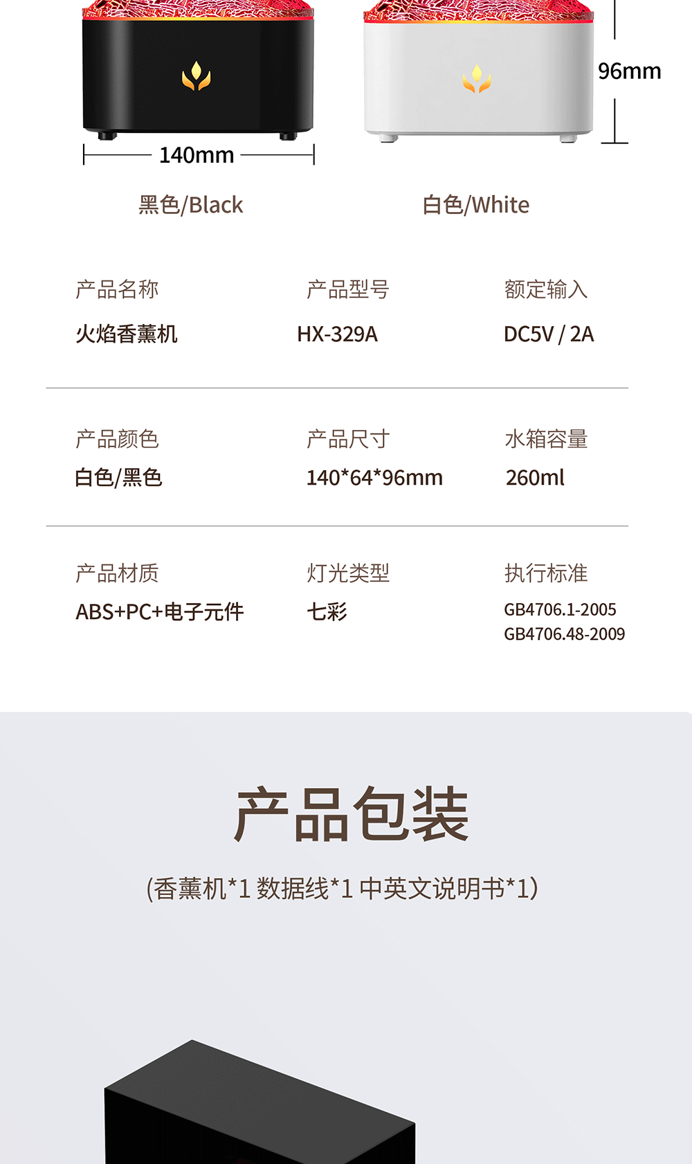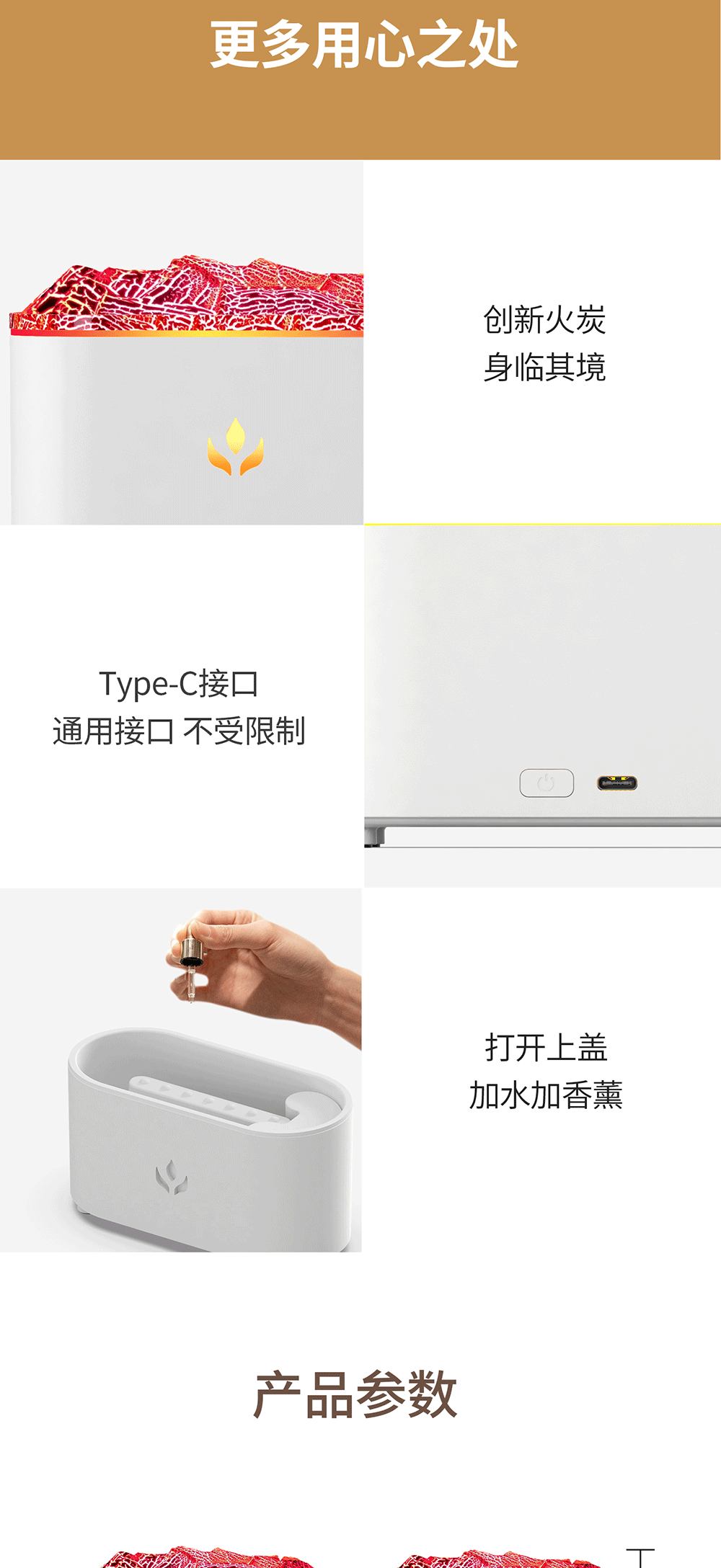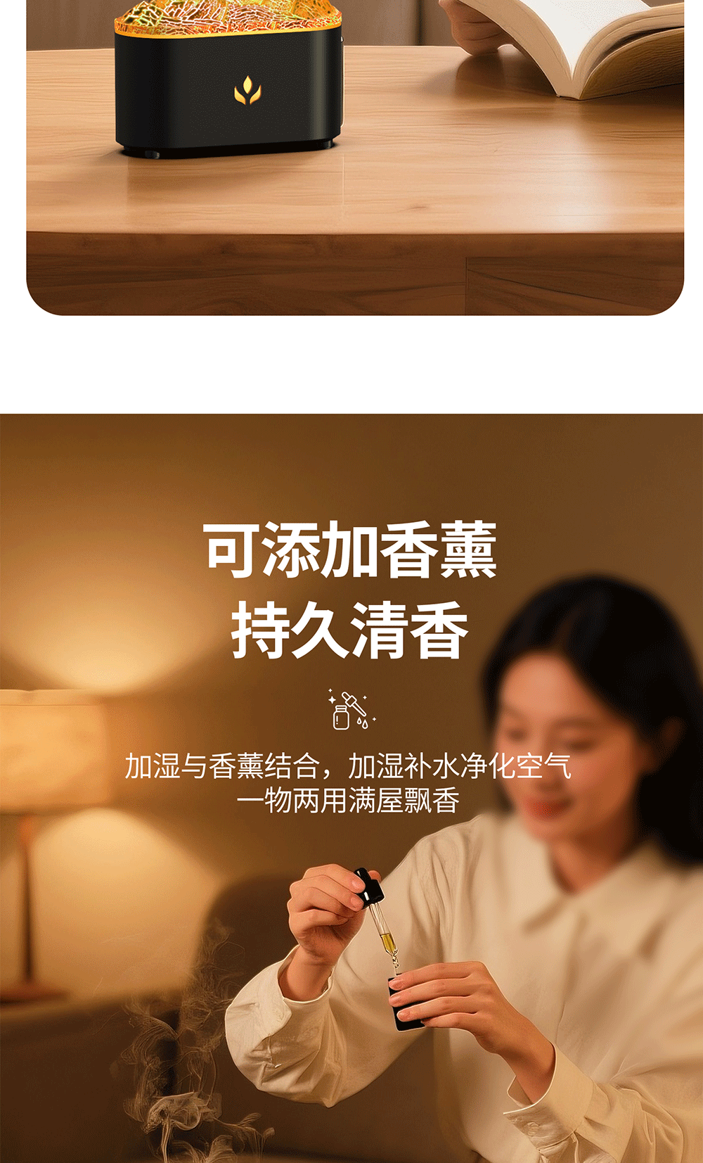 火焰喷雾,七彩灯光;内置风扇增压送雾,加快雾化流通;可添加香薰,持久清香