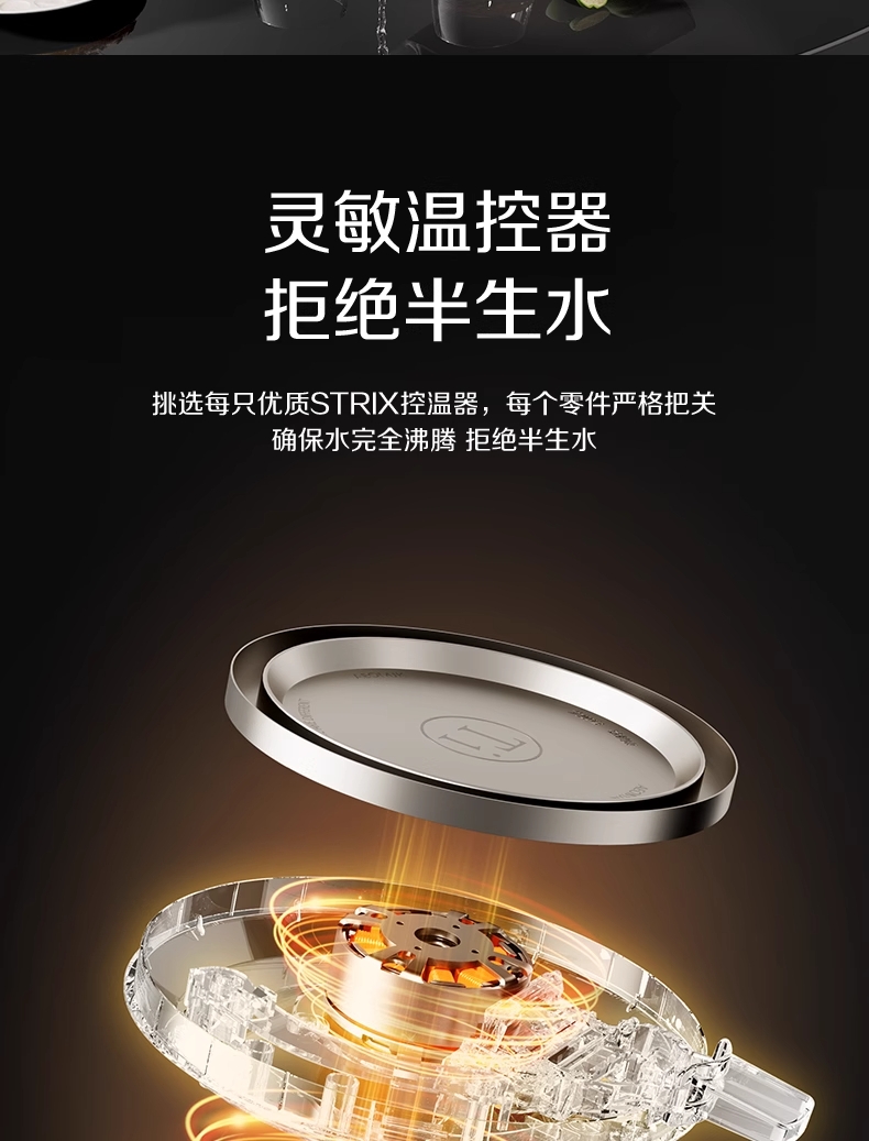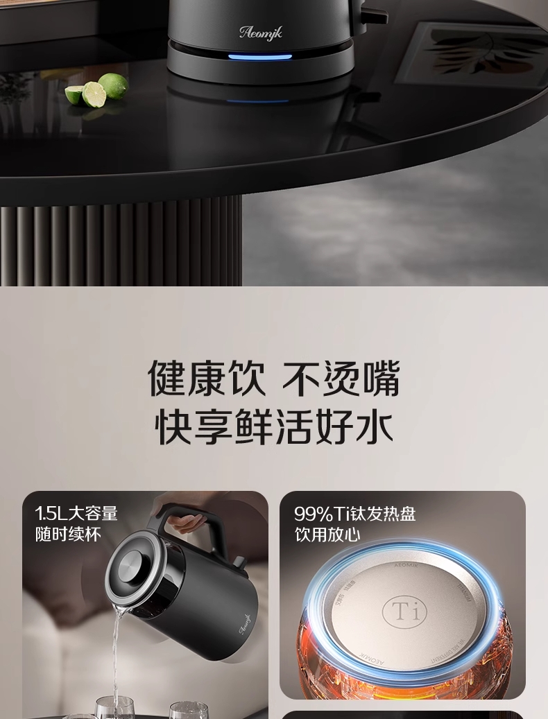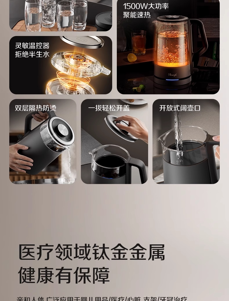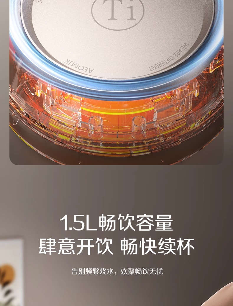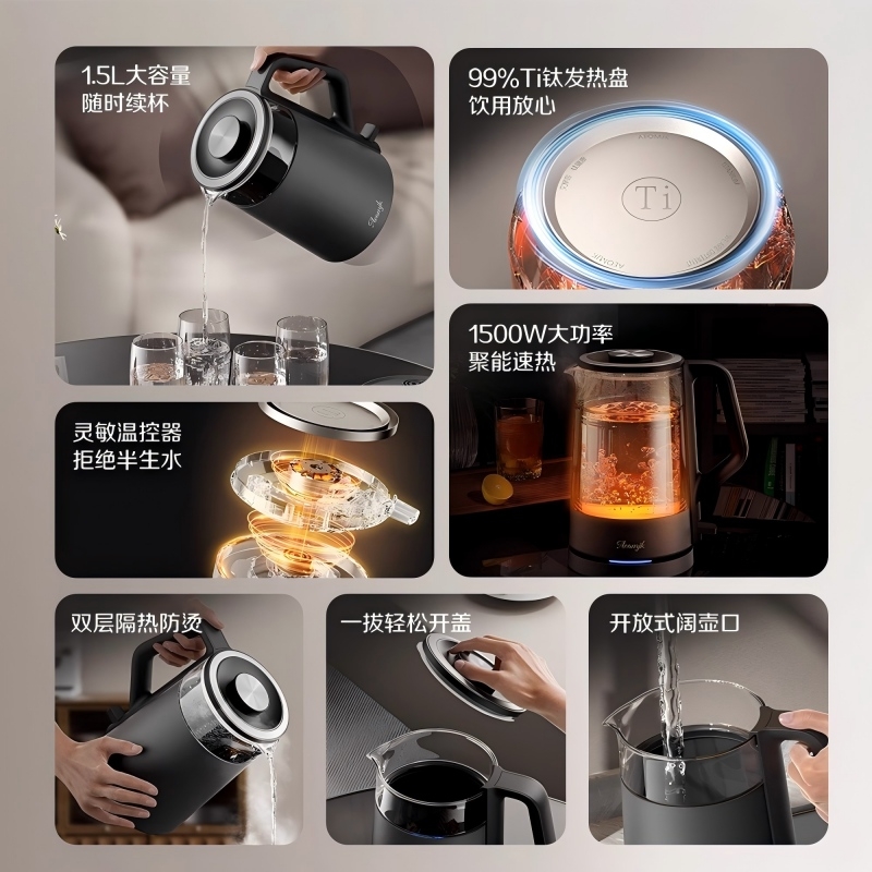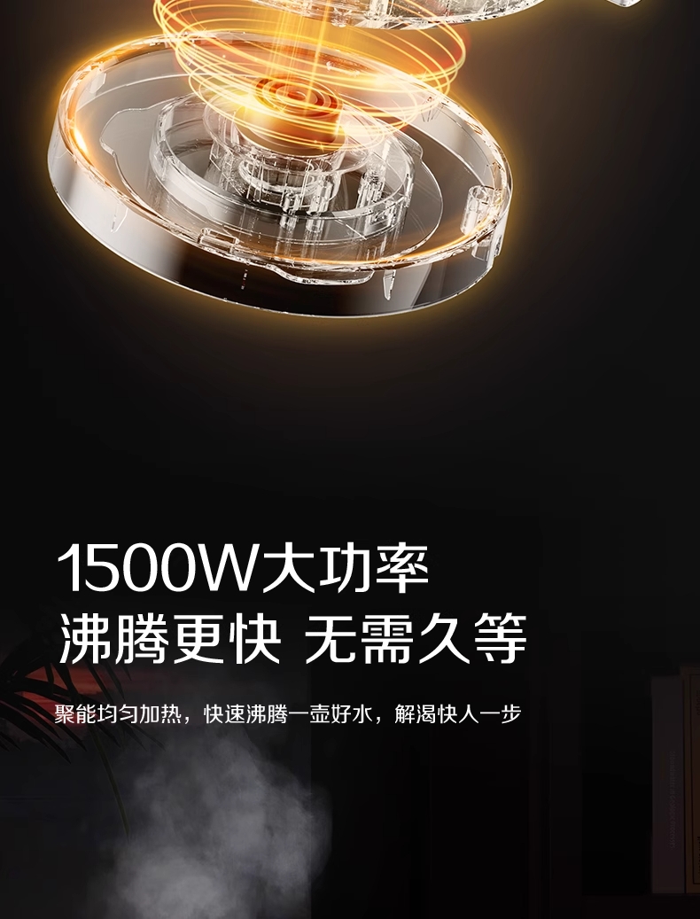 ·采用钛底盘瞬热,健康耐用无涂层,99%钛发热盘;1.5L大容量,1500W大功率聚能速热,灵敏温控;·开放式阔壶口,防烫把手贴心设计
