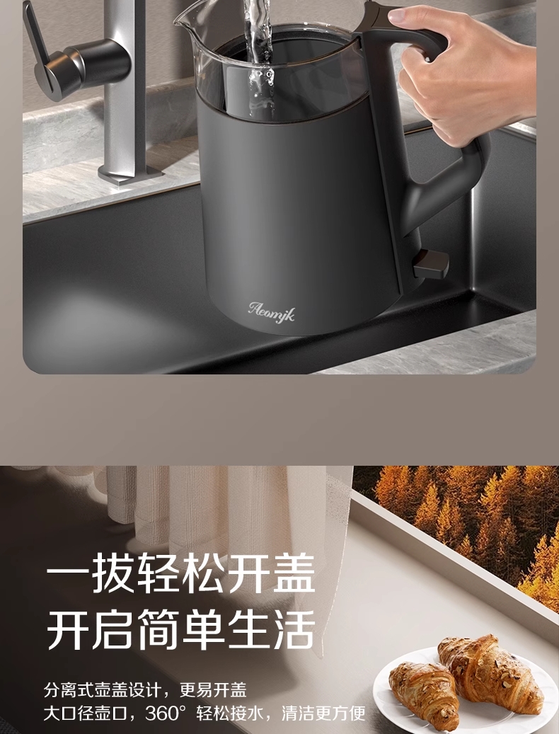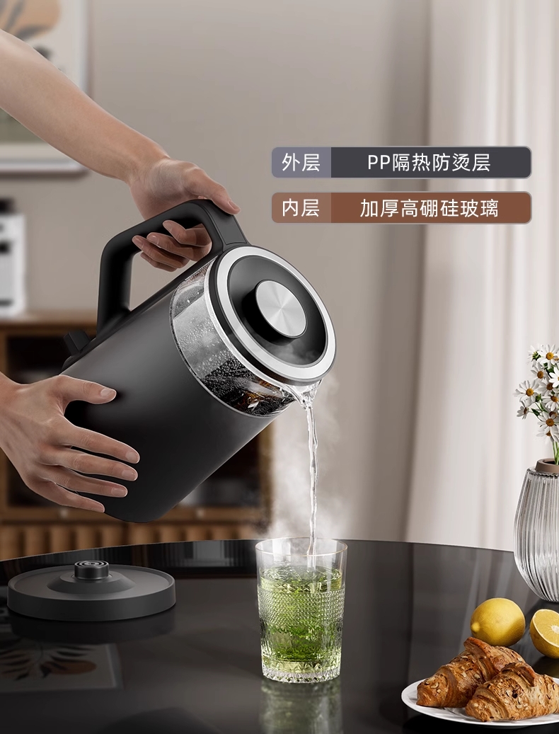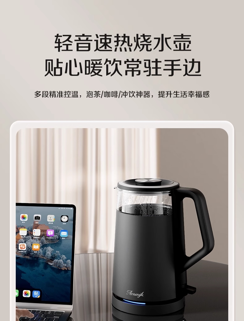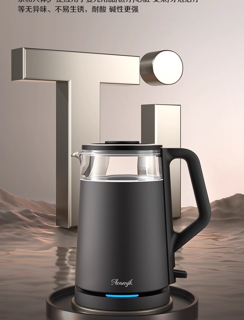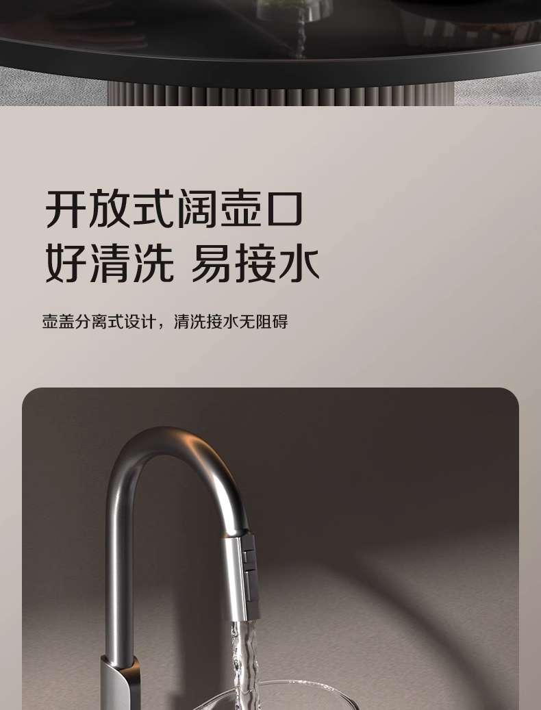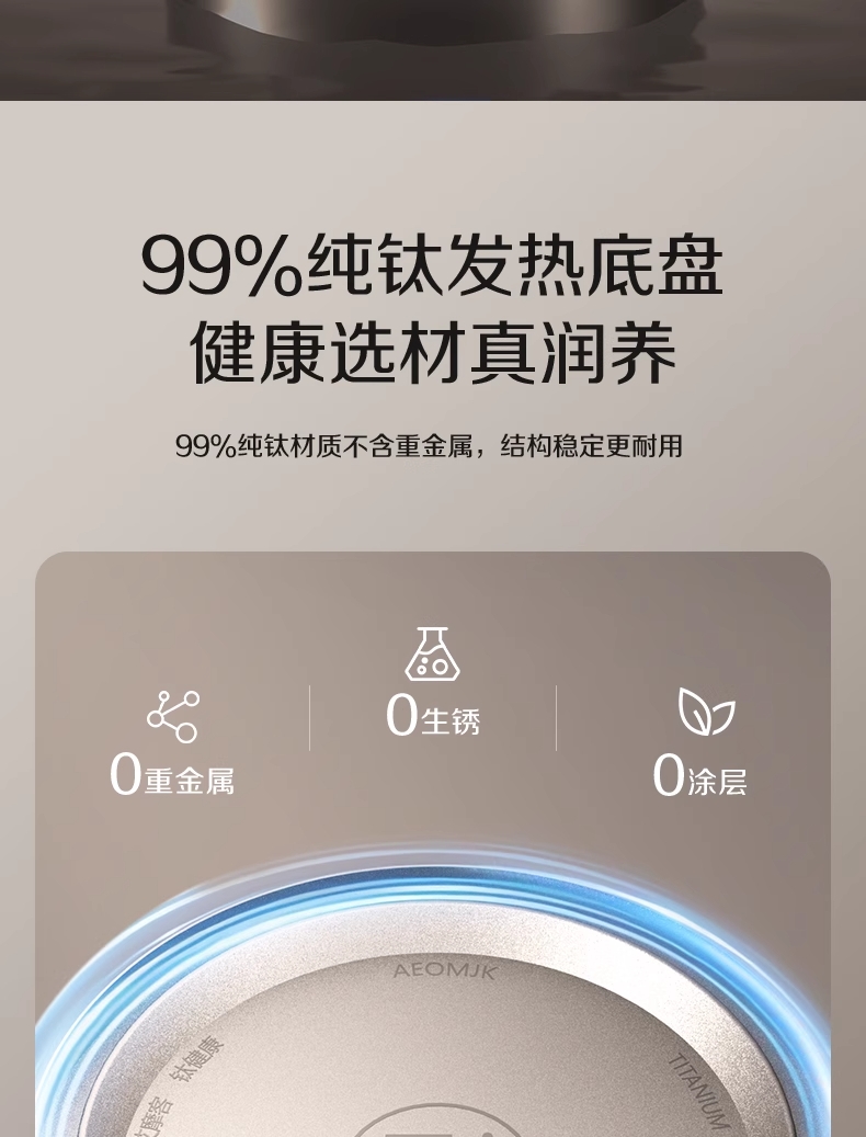 ·采用钛底盘瞬热,健康耐用无涂层,99%钛发热盘;1.5L大容量,1500W大功率聚能速热,灵敏温控;·开放式阔壶口,防烫把手贴心设计