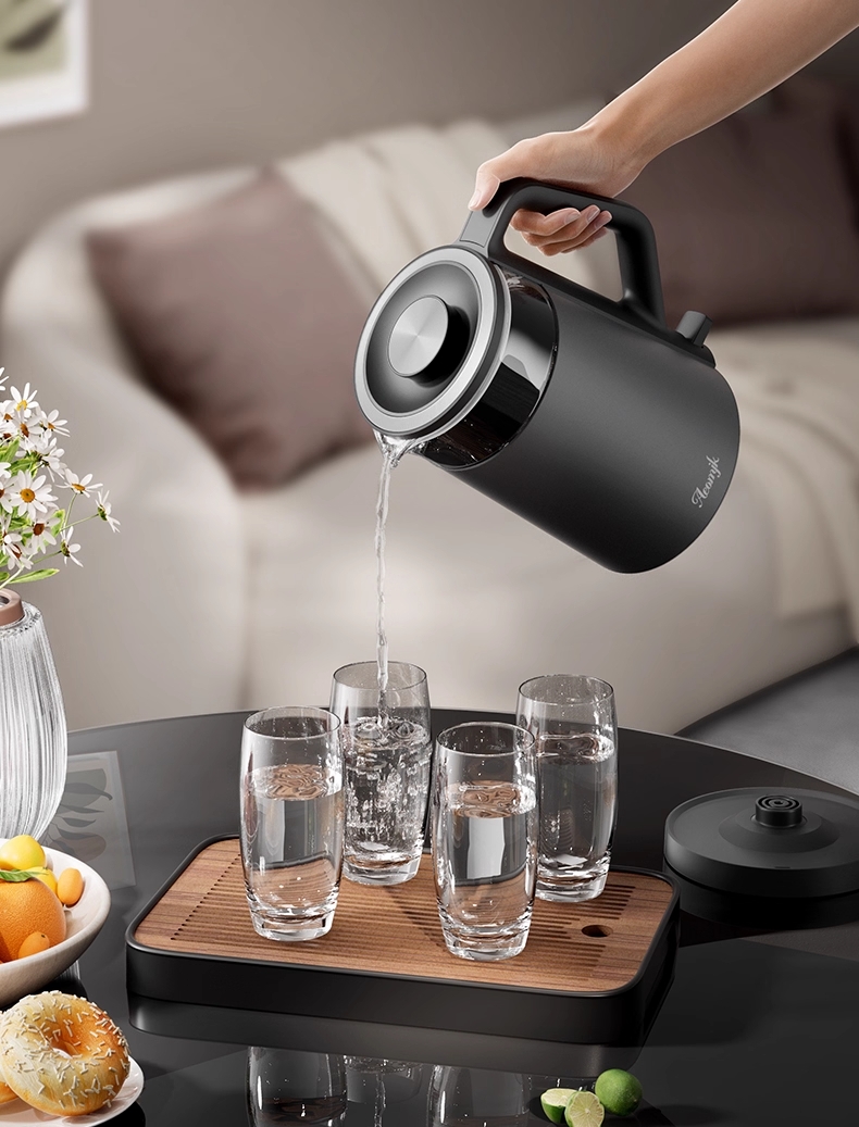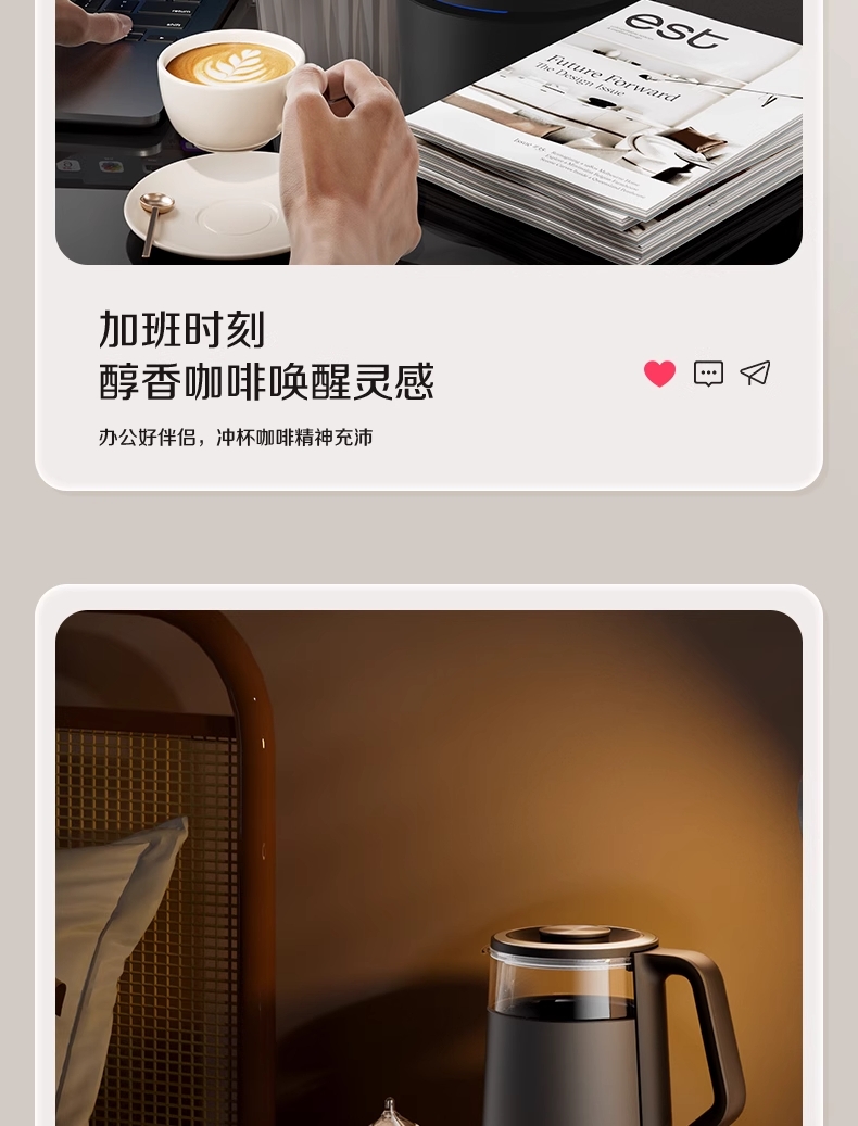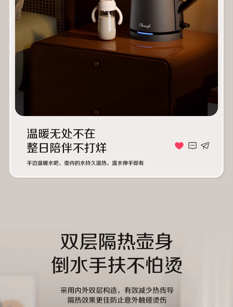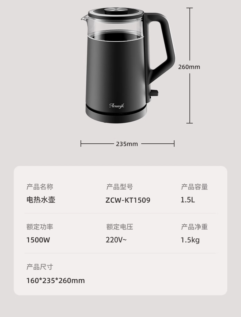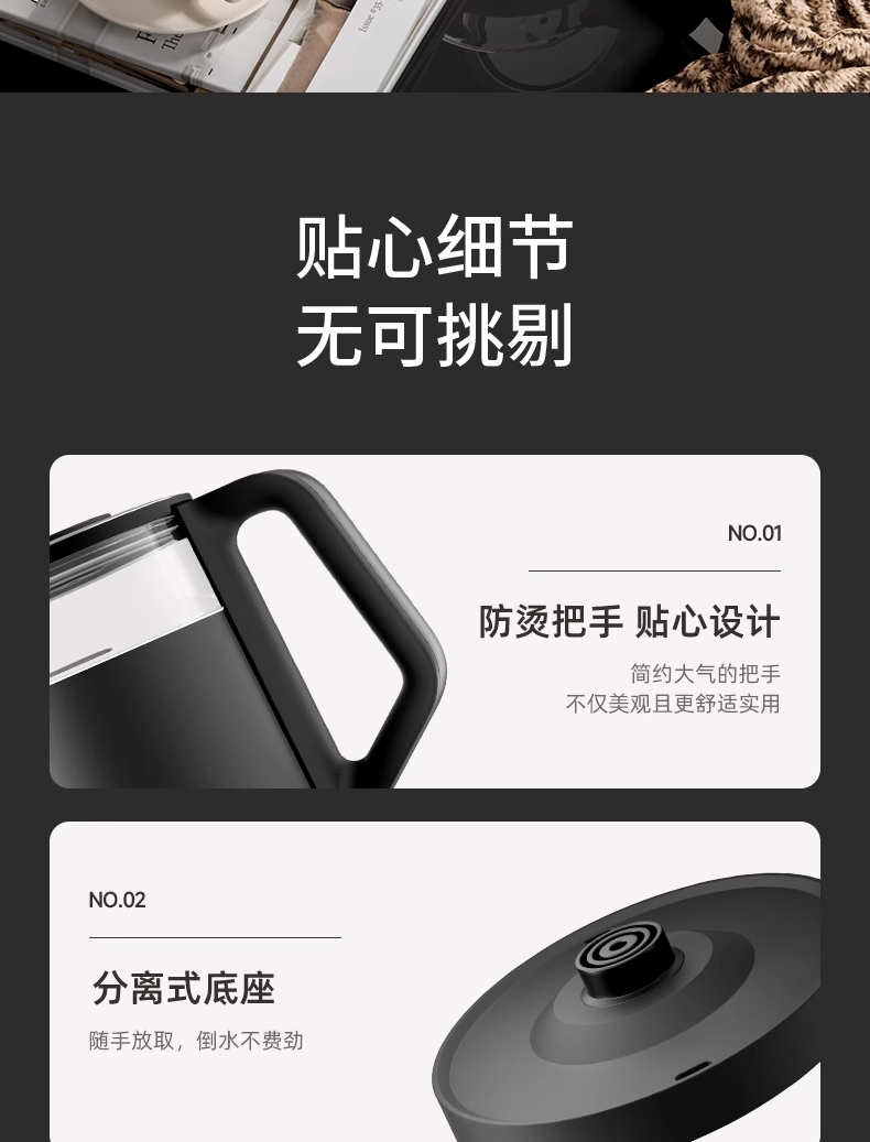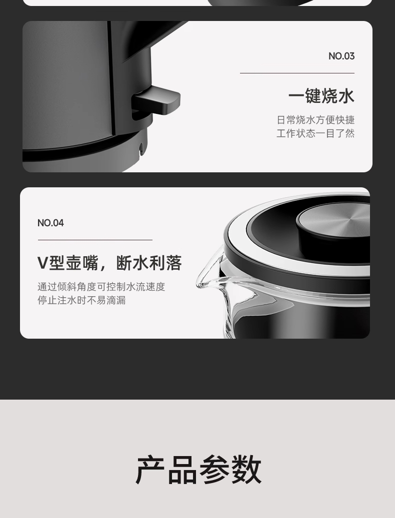 ·采用钛底盘瞬热,健康耐用无涂层,99%钛发热盘;1.5L大容量,1500W大功率聚能速热,灵敏温控;·开放式阔壶口,防烫把手贴心设计