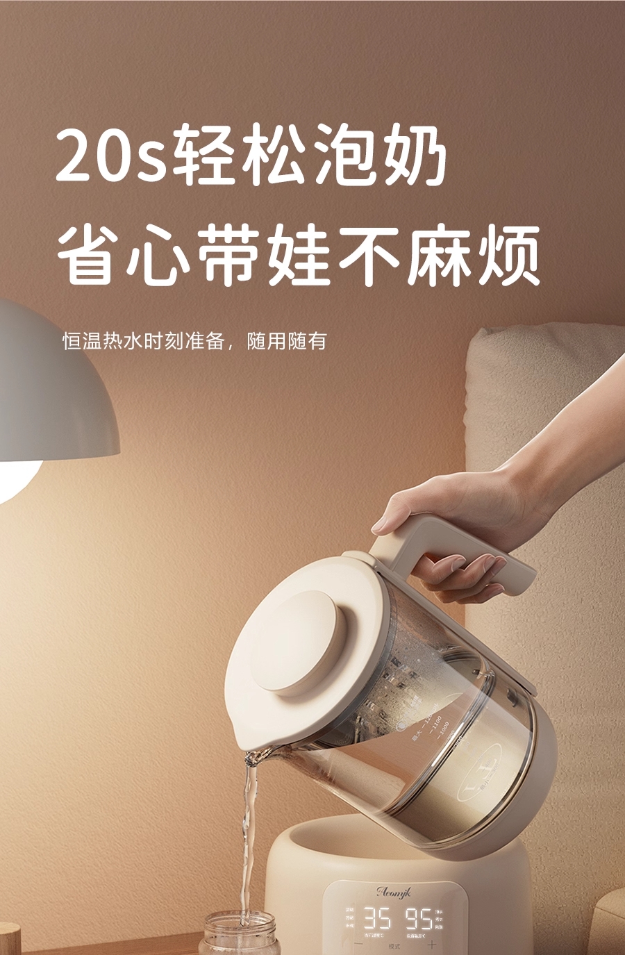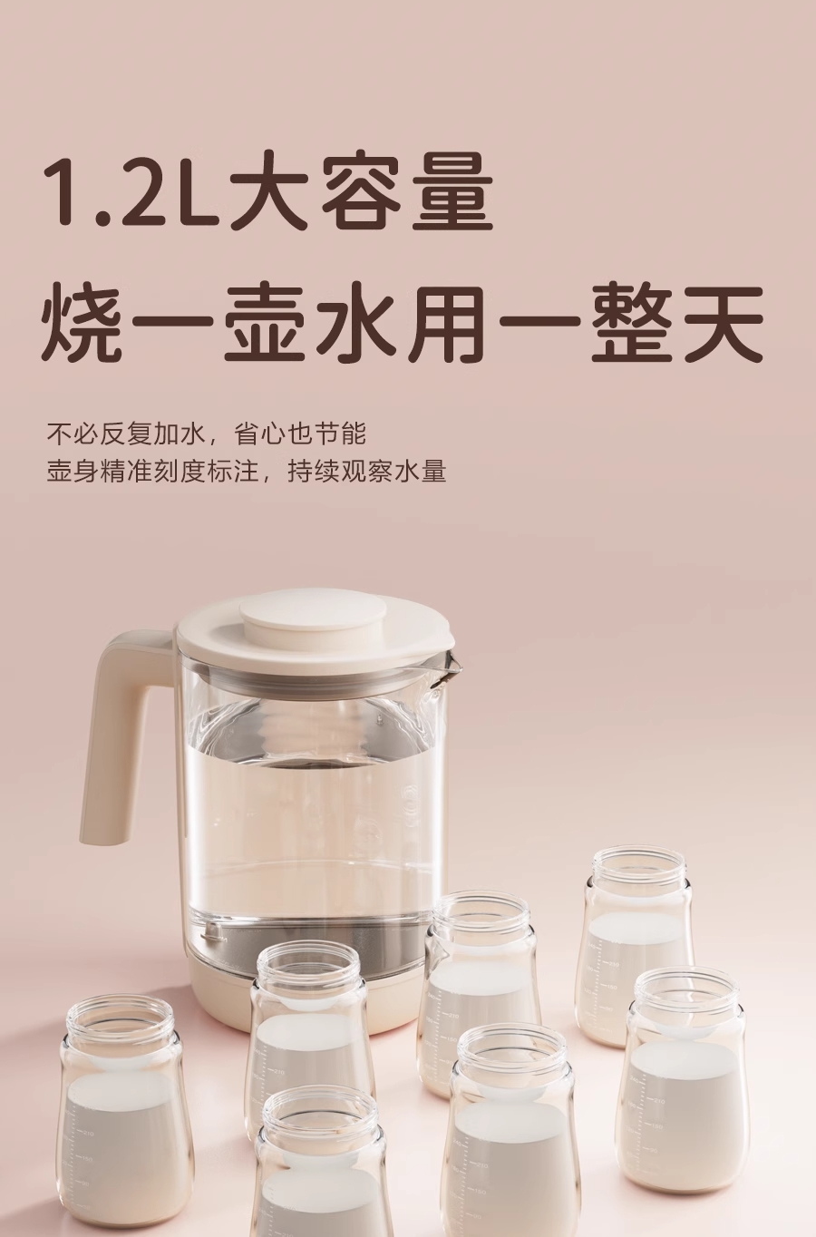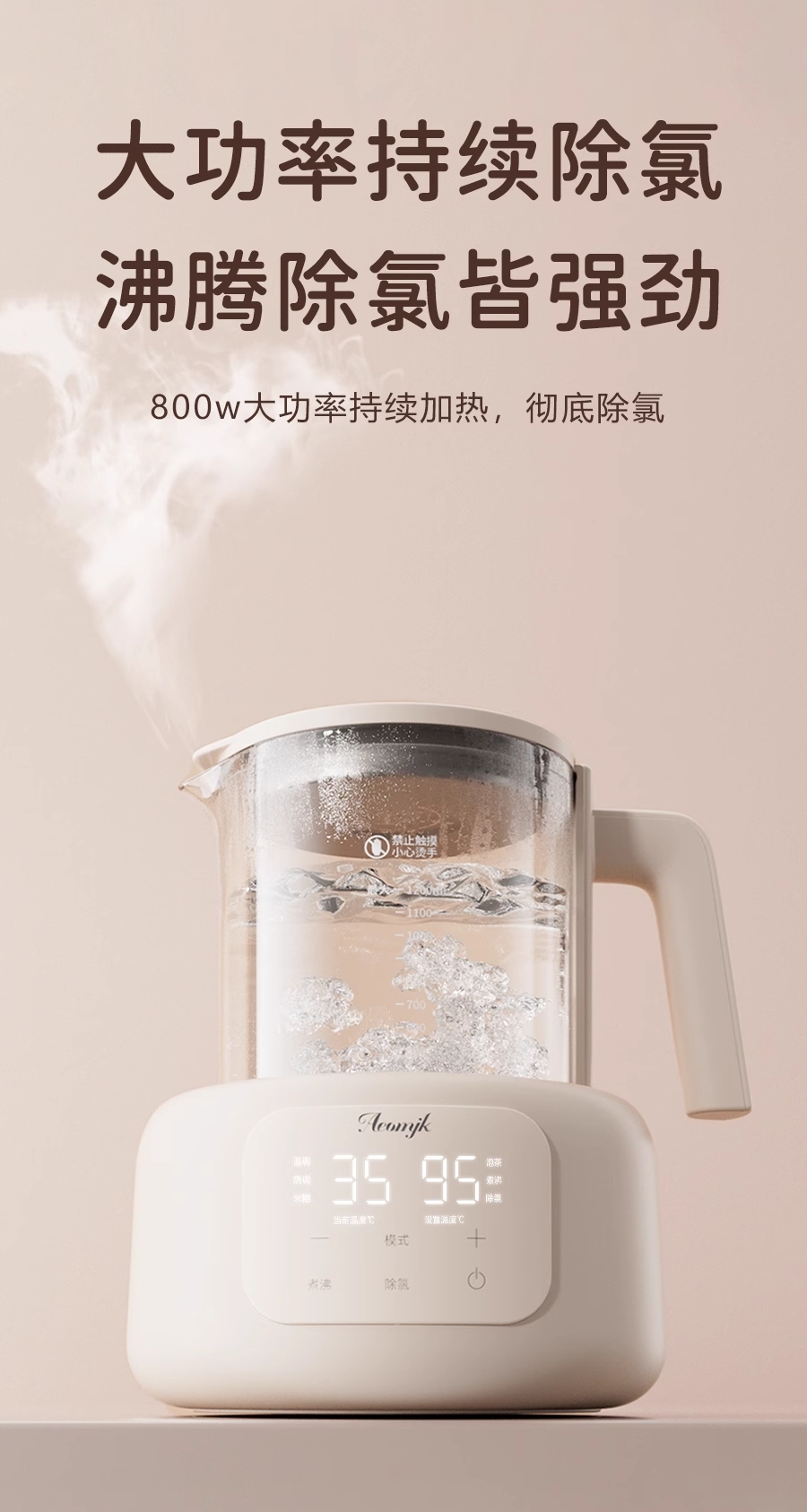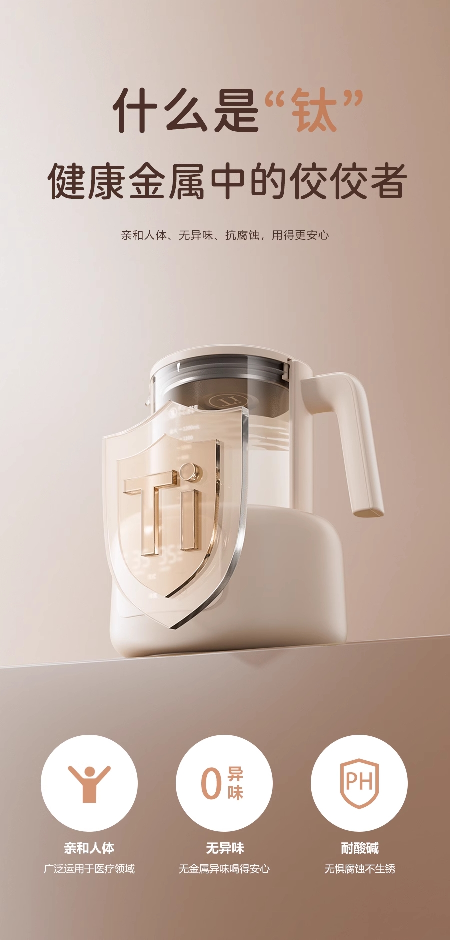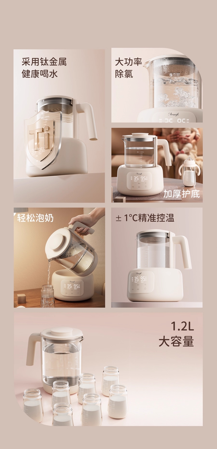采用钛金属健康喝水,大功率快速除氯;35℃-95℃精准控温每一度,1.2L大容量;20s轻松泡奶,800w大功率持续加热彻底除氯