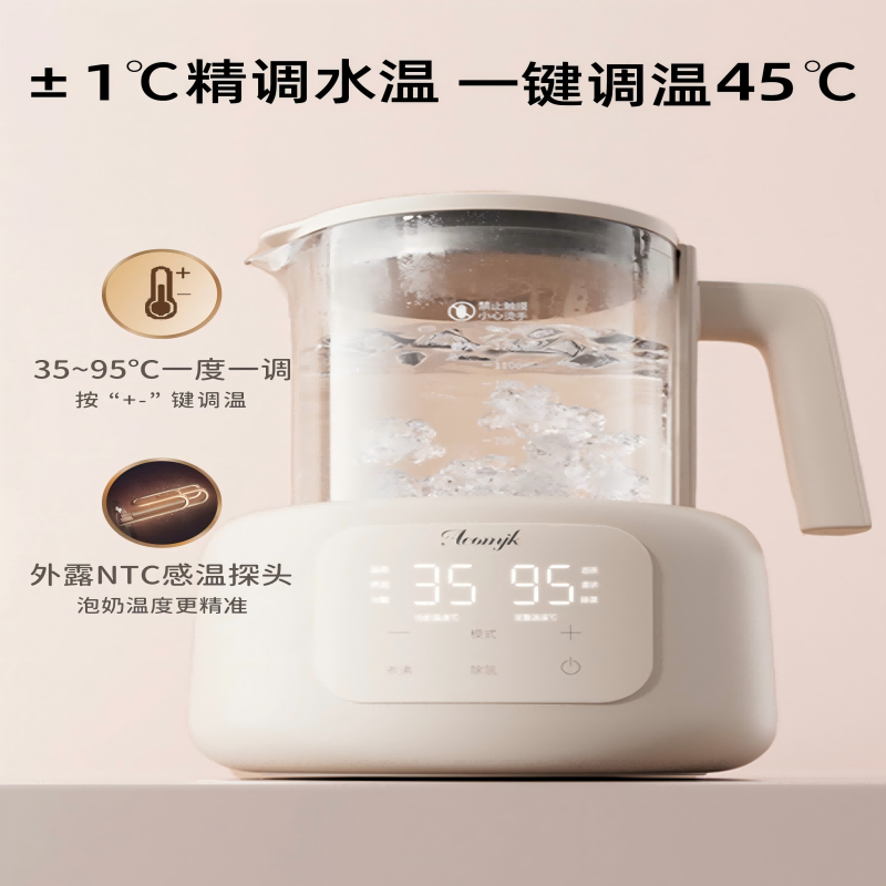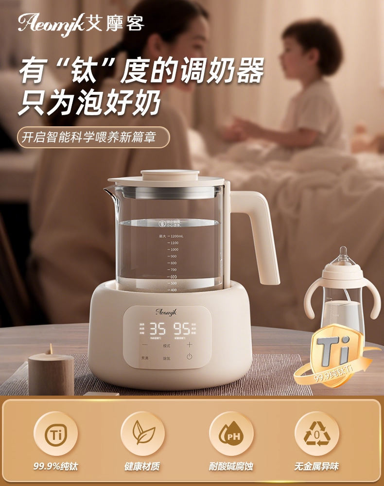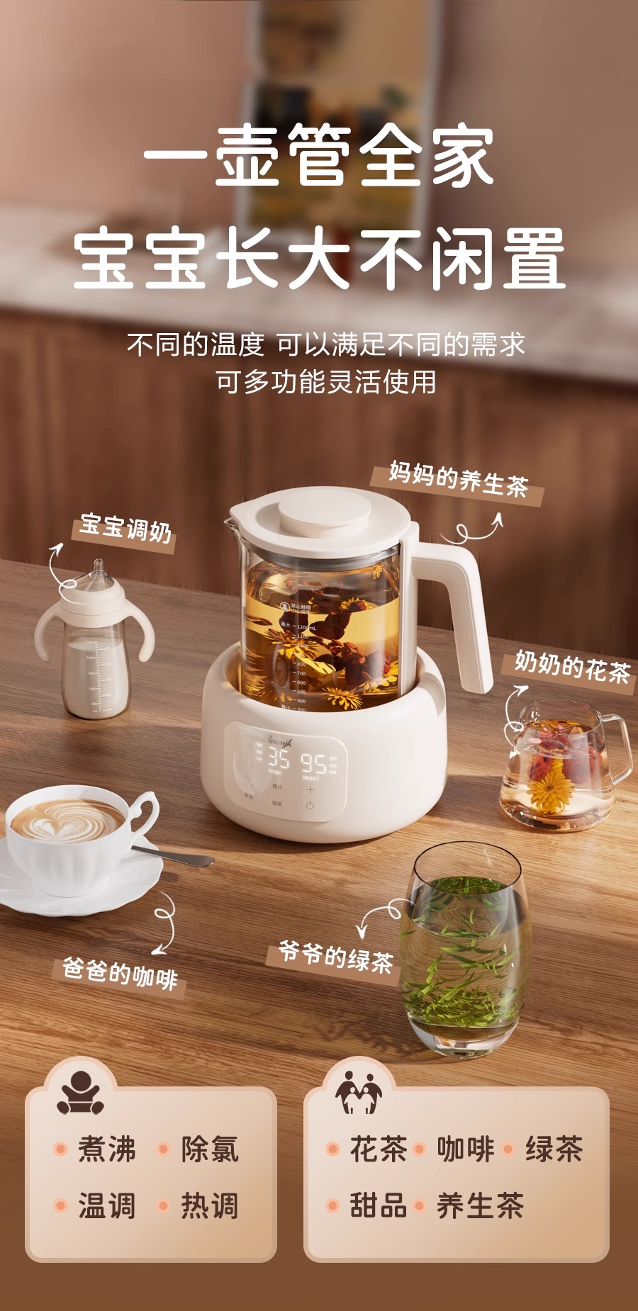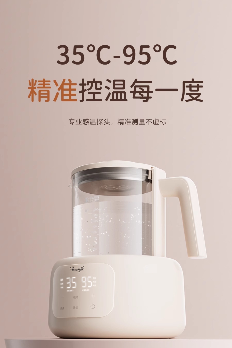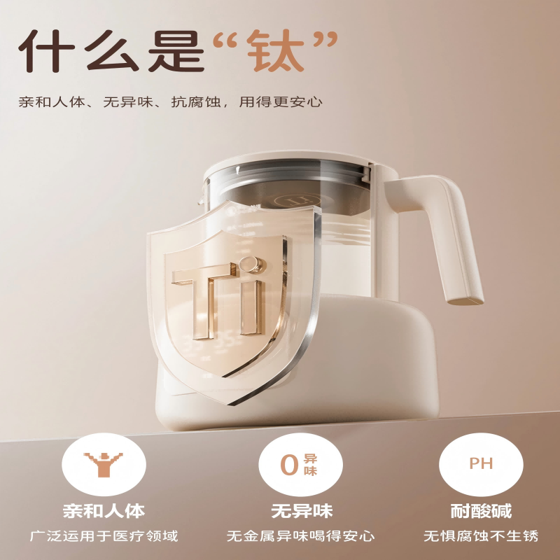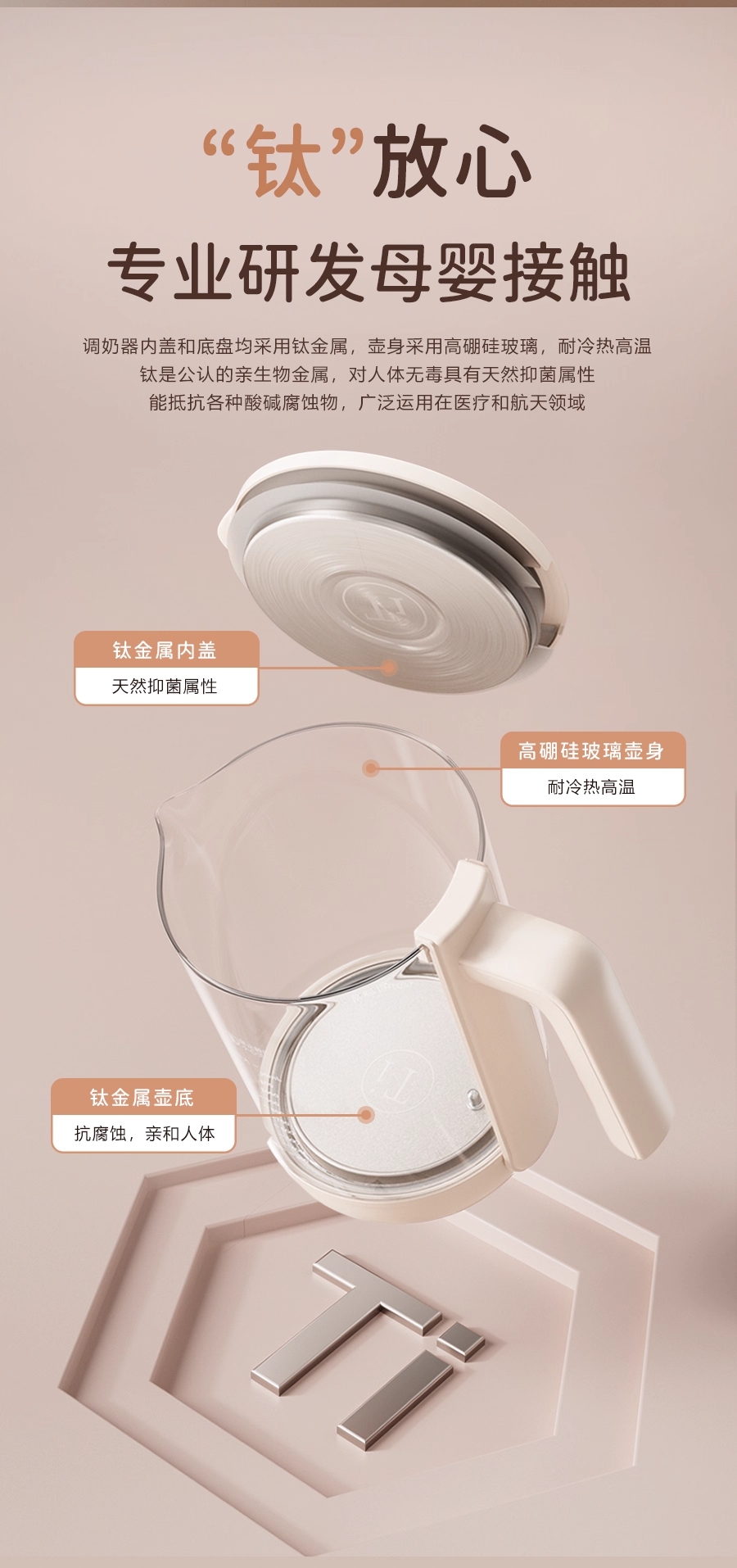 采用钛金属健康喝水,大功率快速除氯;35℃-95℃精准控温每一度,1.2L大容量;20s轻松泡奶,800w大功率持续加热彻底除氯