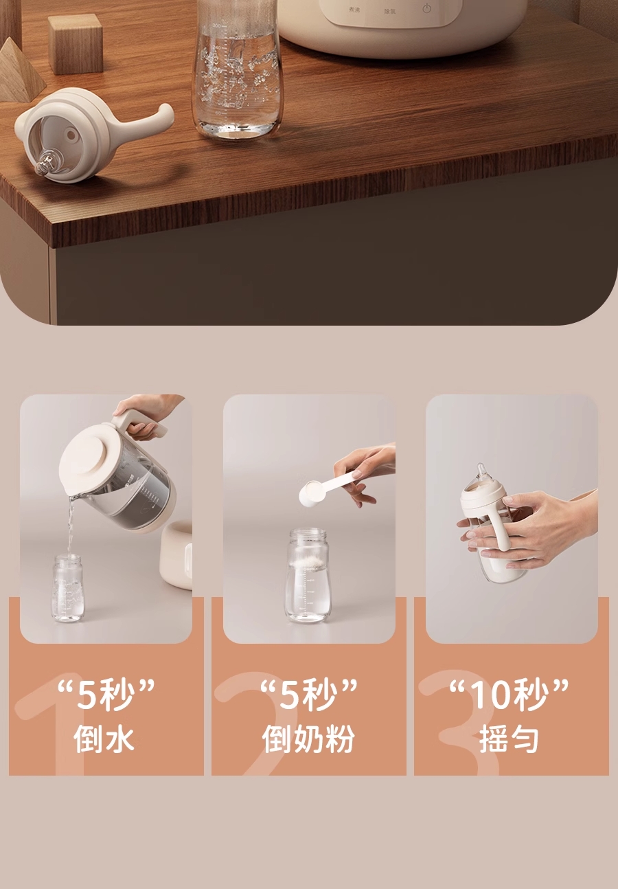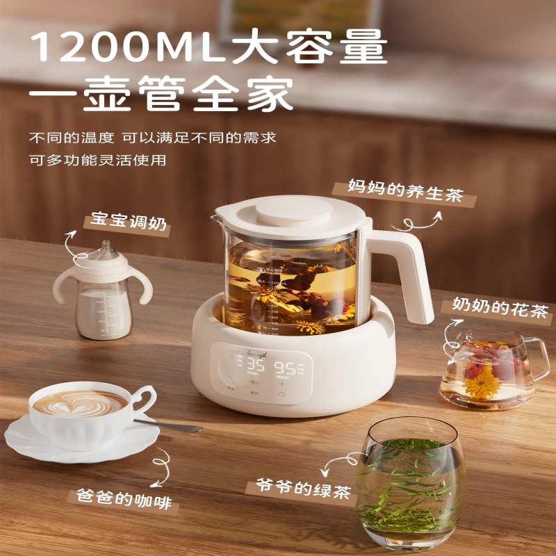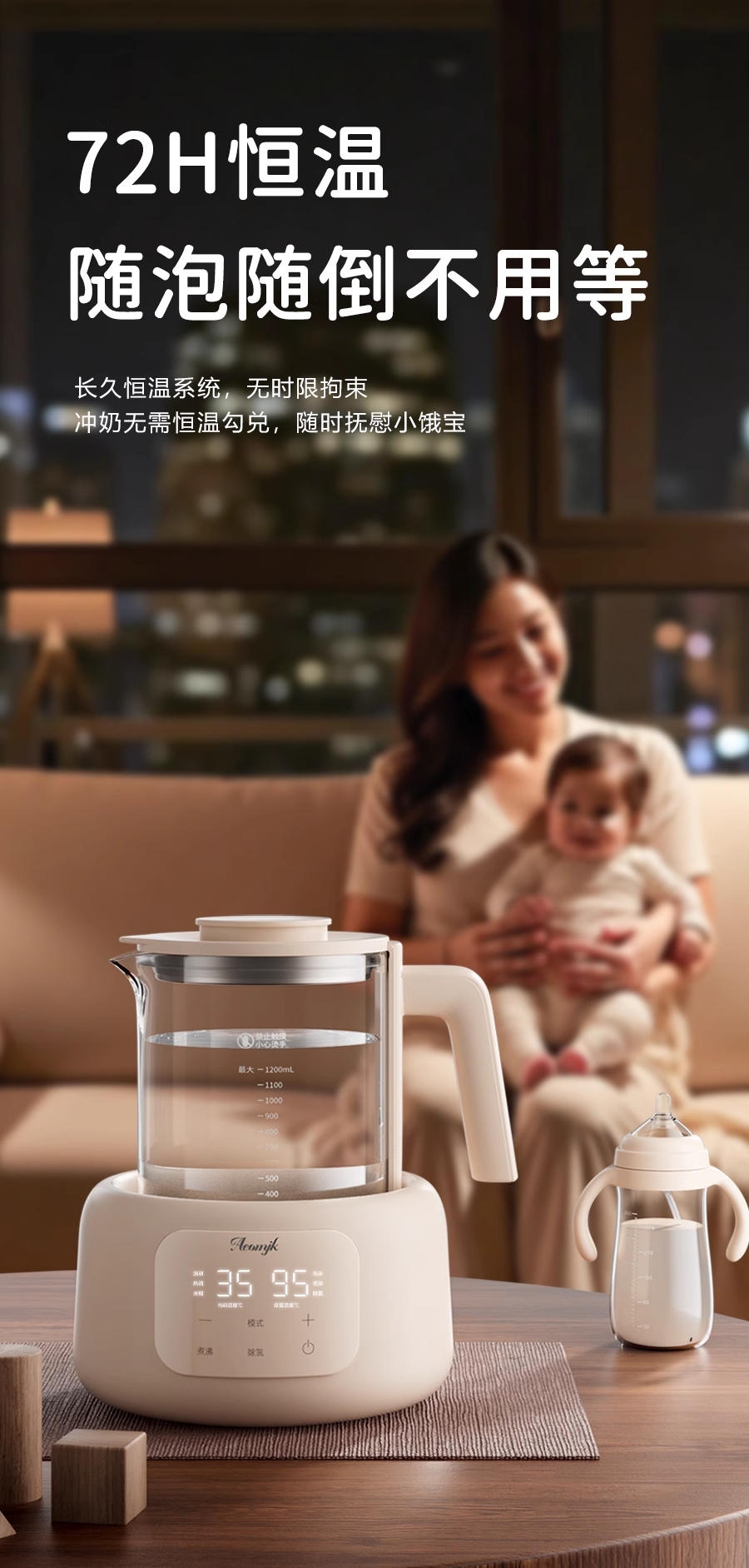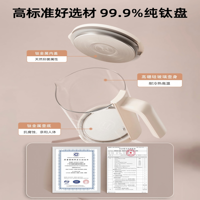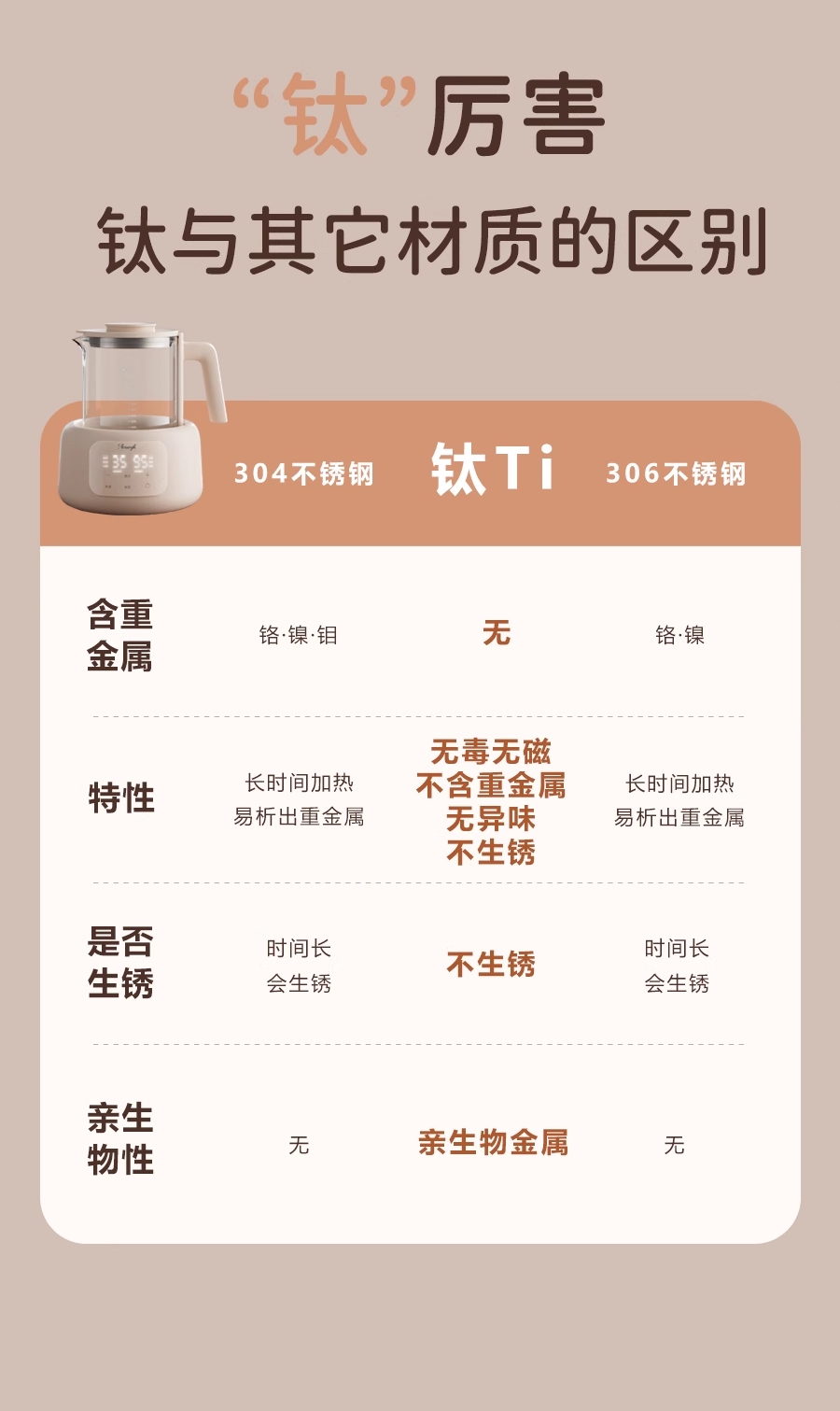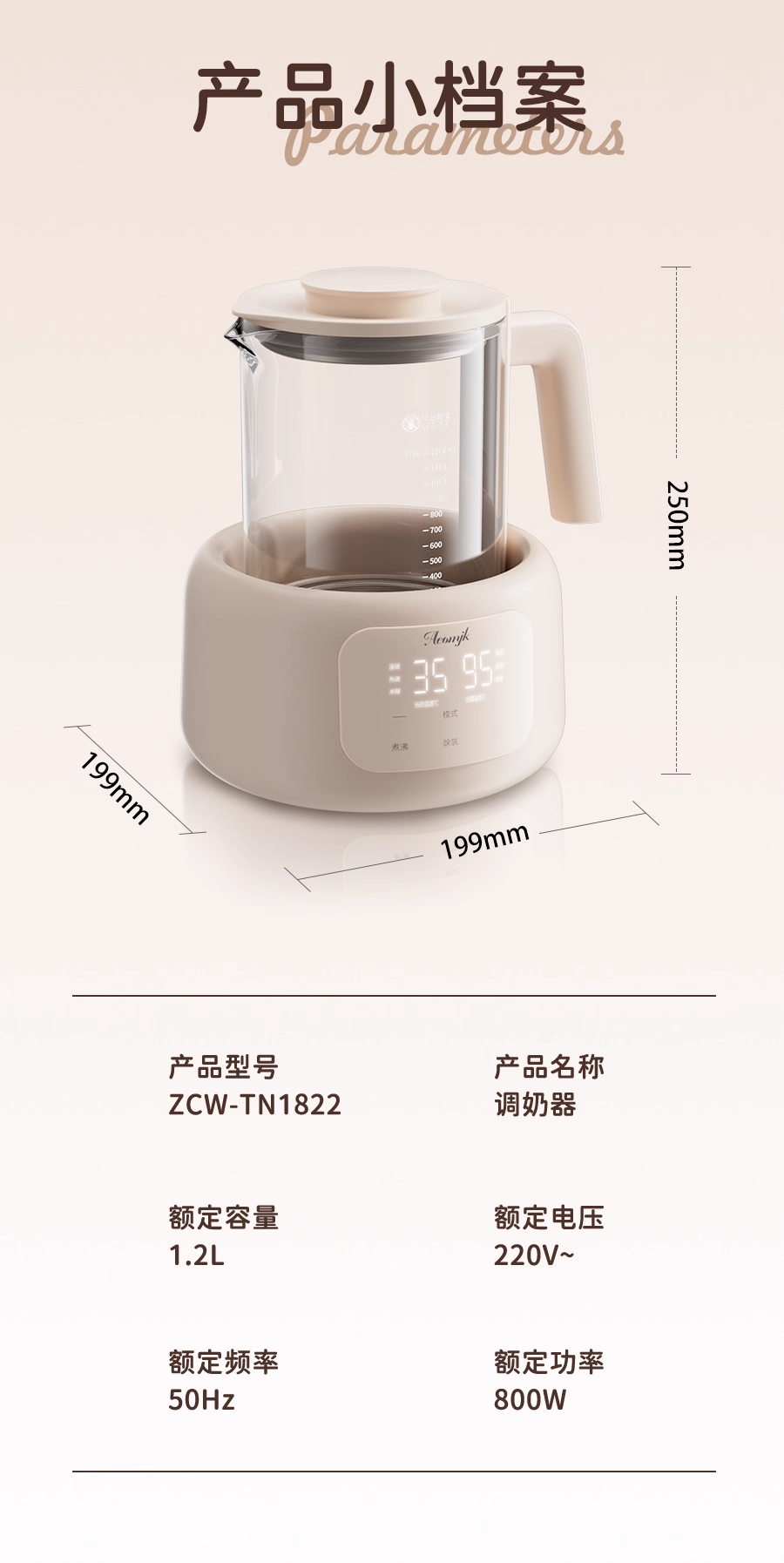 采用钛金属健康喝水,大功率快速除氯;35℃-95℃精准控温每一度,1.2L大容量;20s轻松泡奶,800w大功率持续加热彻底除氯