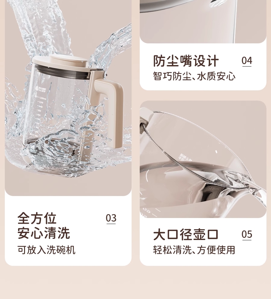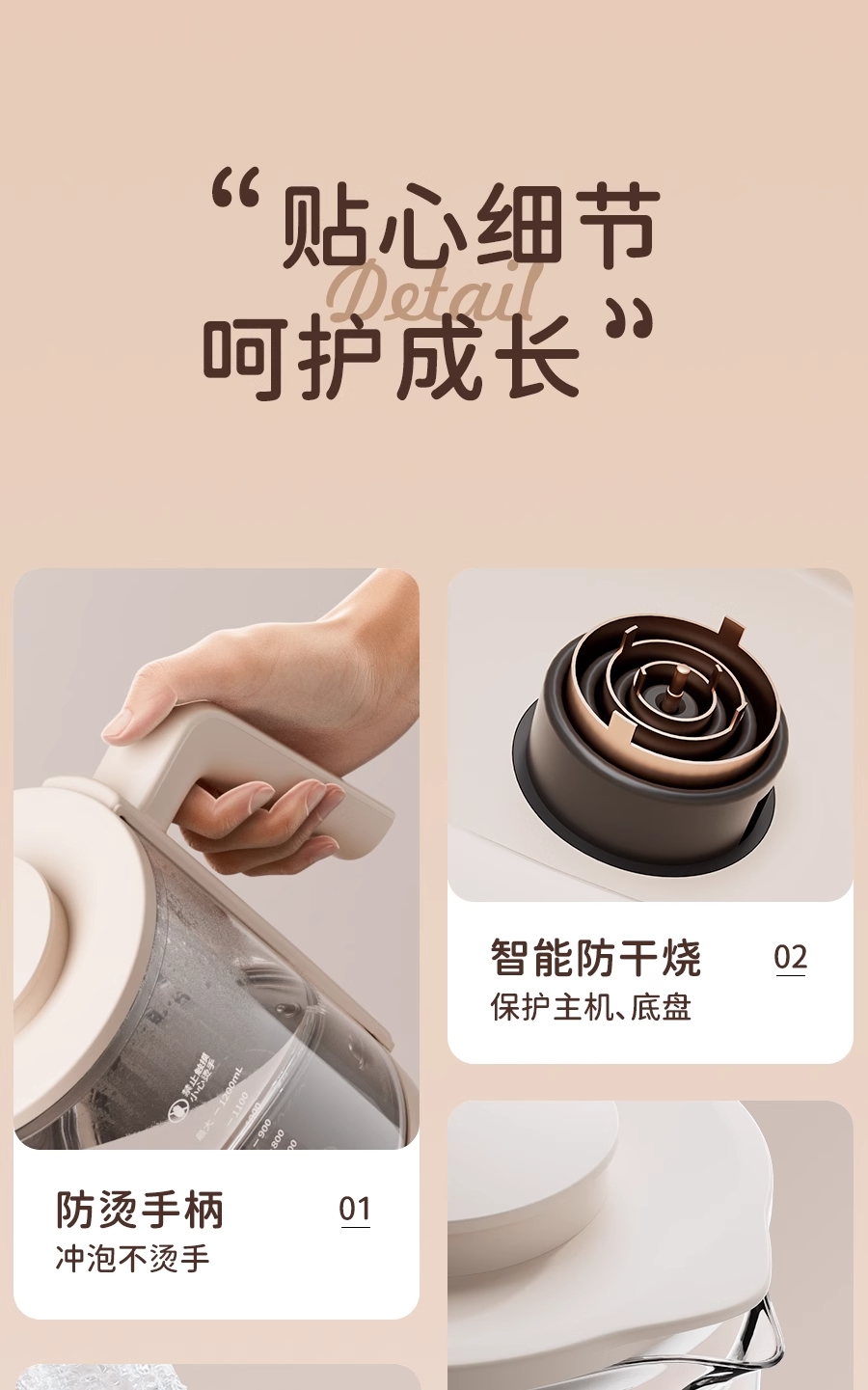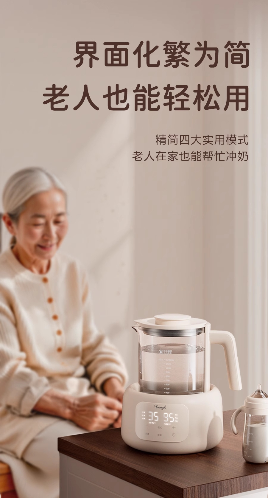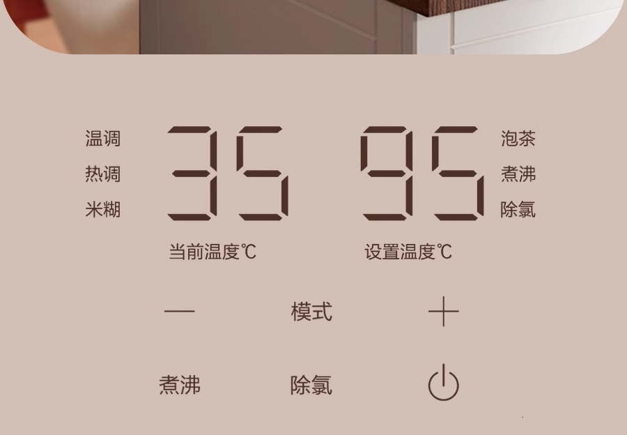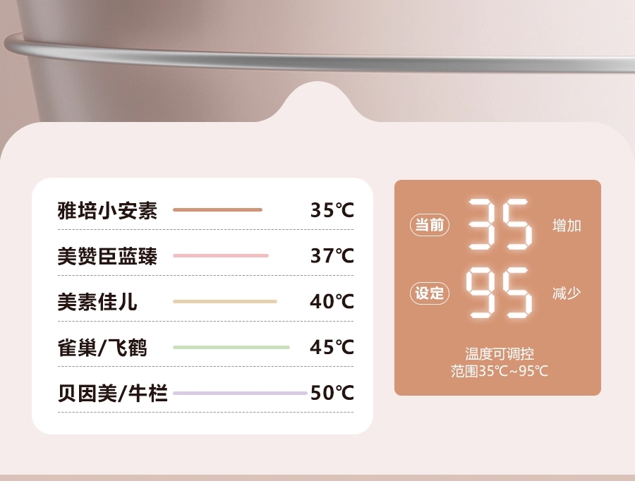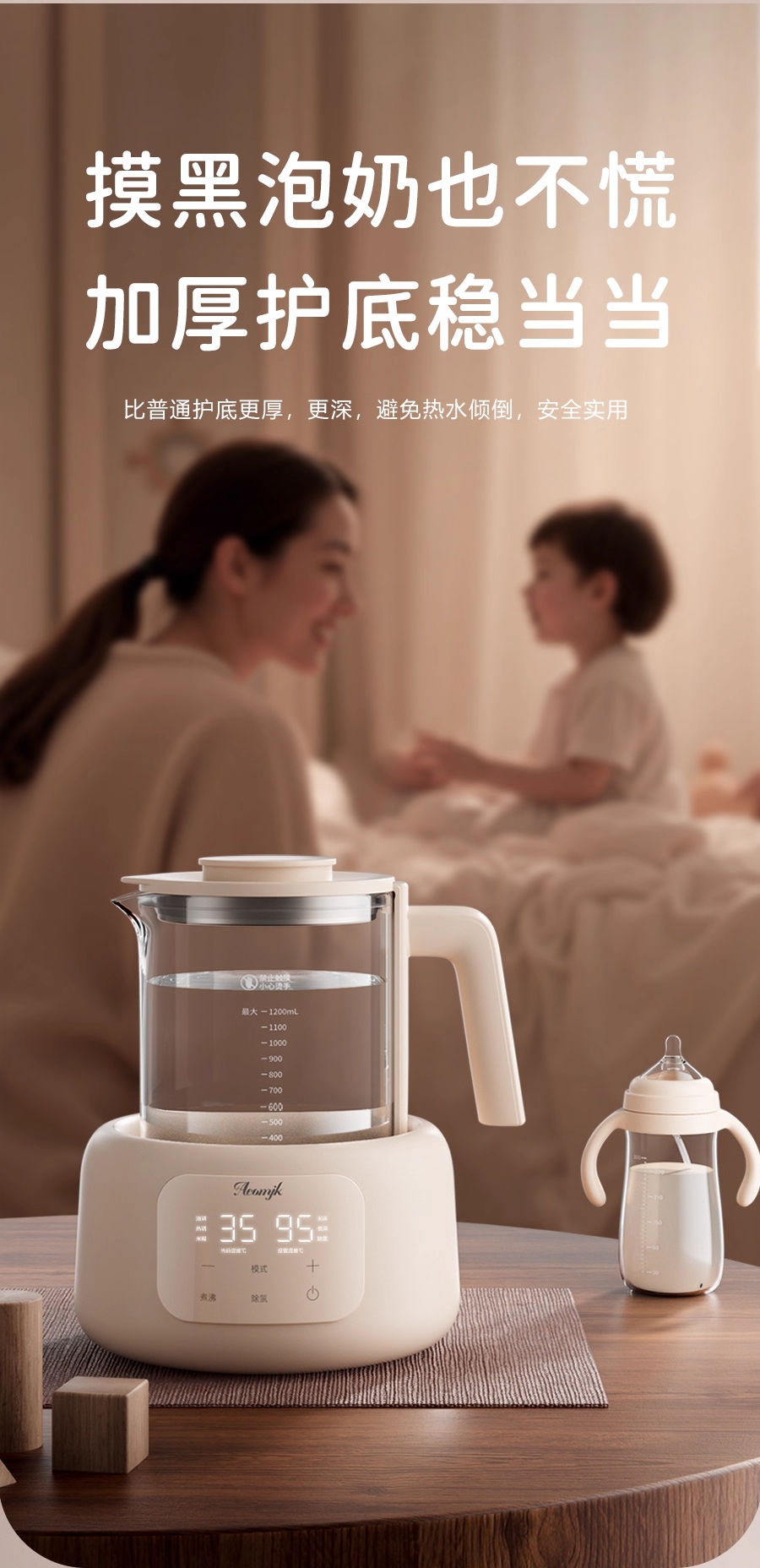 采用钛金属健康喝水,大功率快速除氯;35℃-95℃精准控温每一度,1.2L大容量;20s轻松泡奶,800w大功率持续加热彻底除氯