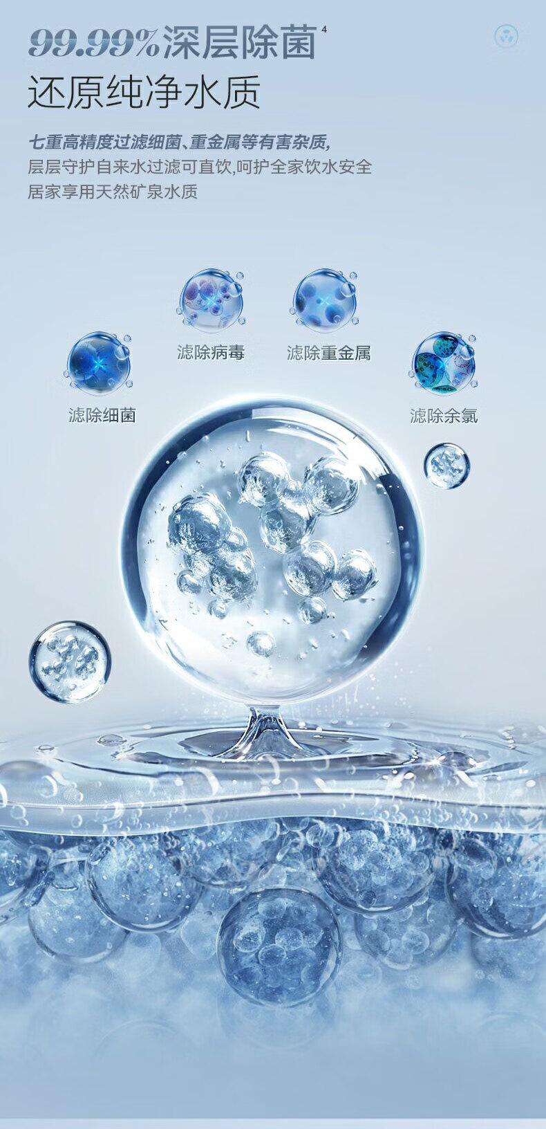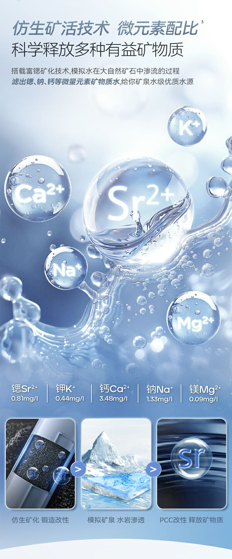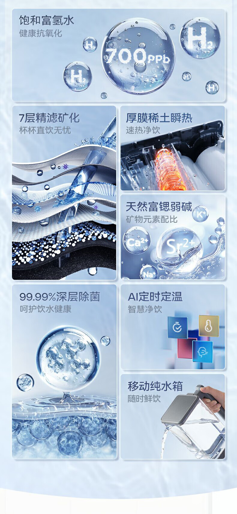 七重复合精滤,洁净畅饮活矿泉;AI定量定温出水,随时畅饮;甄选天然矿藏,补充稀缺营养