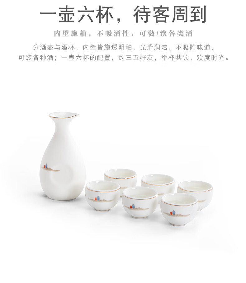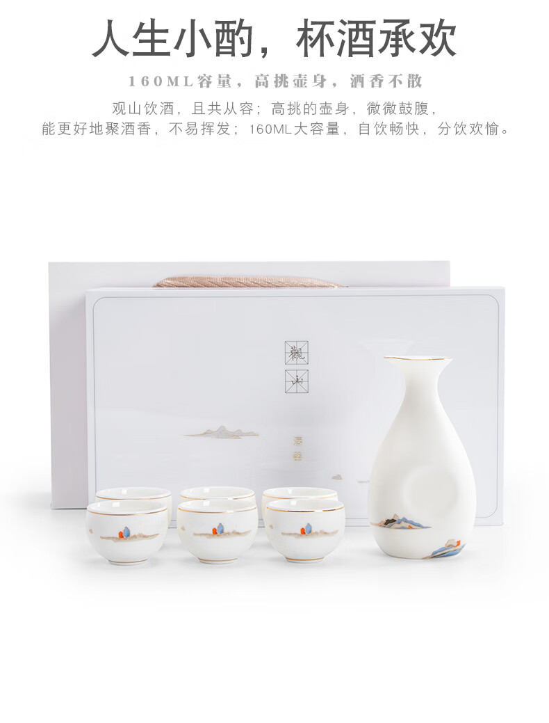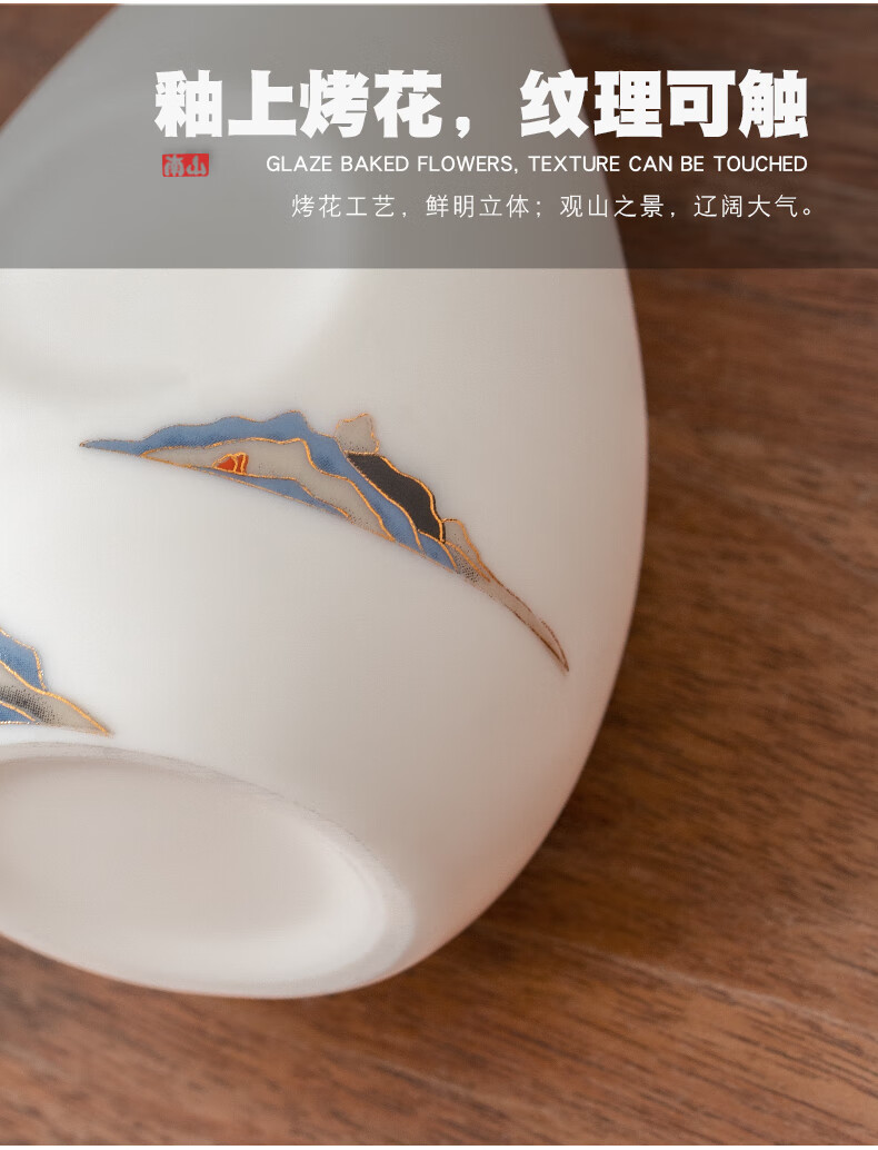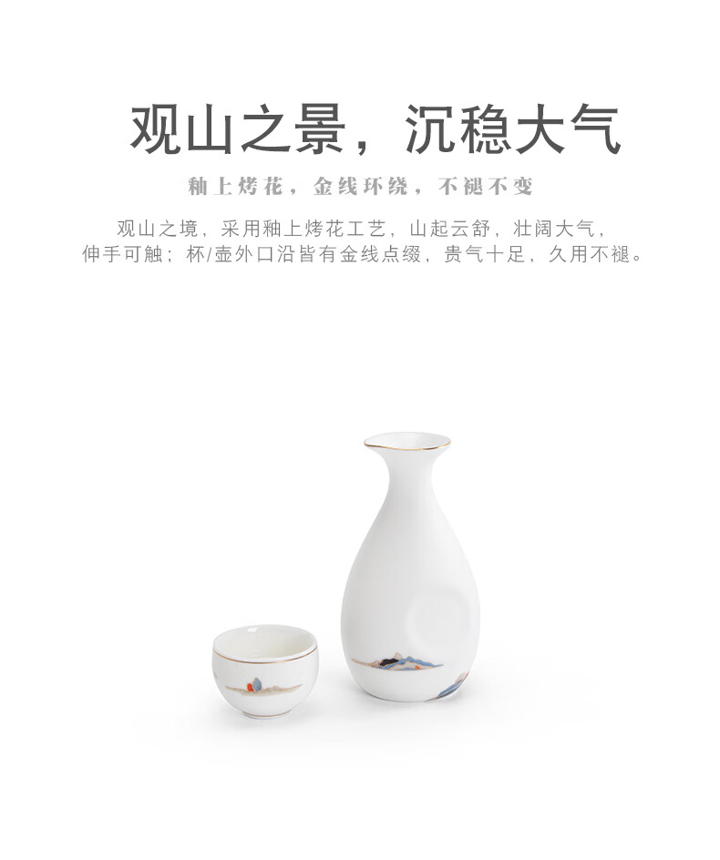 内壁施釉,不吸酒性,可装饮各类酒;内壁皆施透明釉,光滑润洁,不吸附味道;烤花工艺,鲜明立体;观山之景,辽阔大气