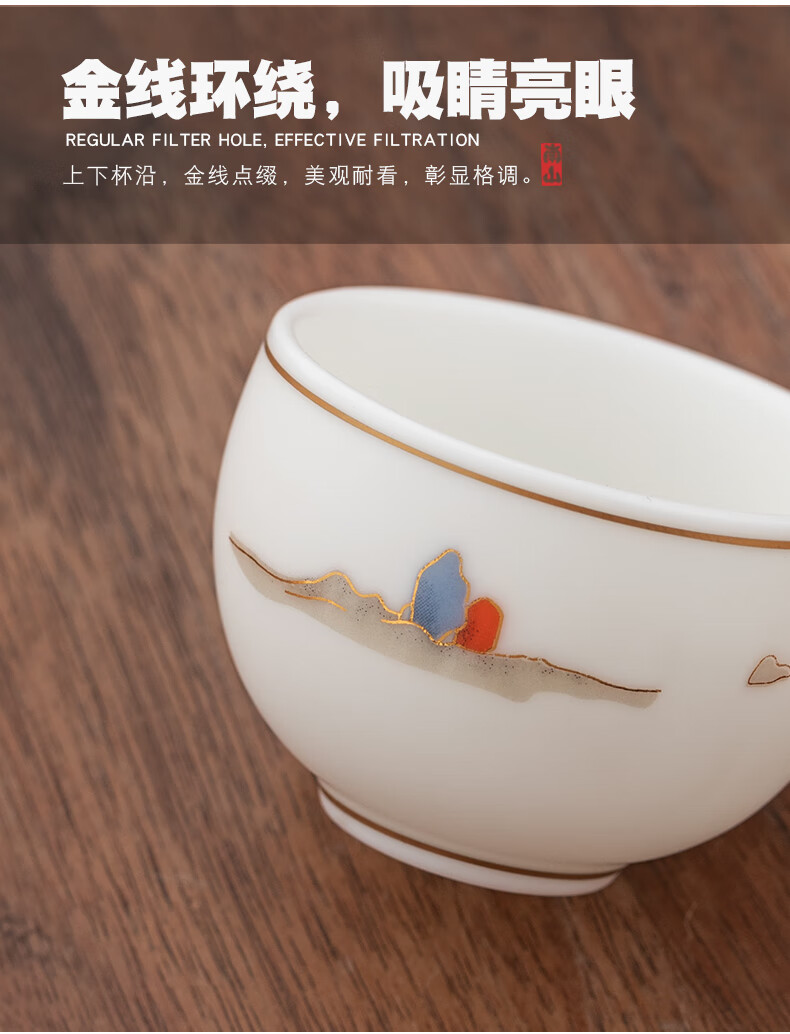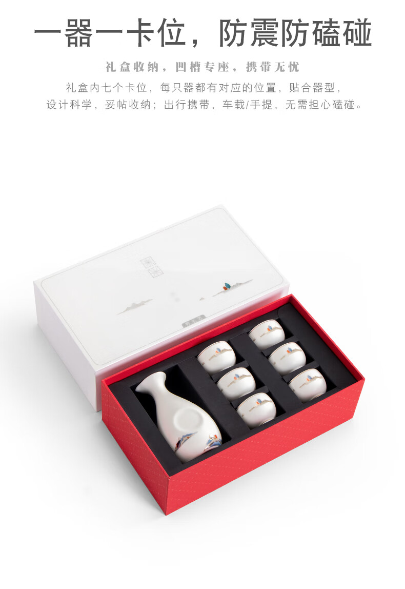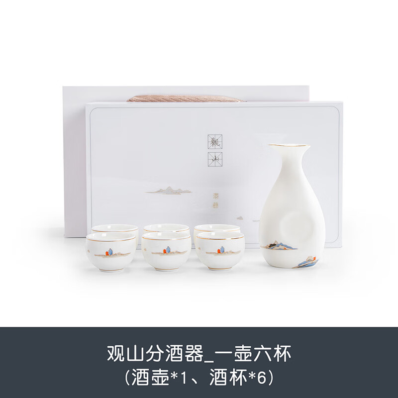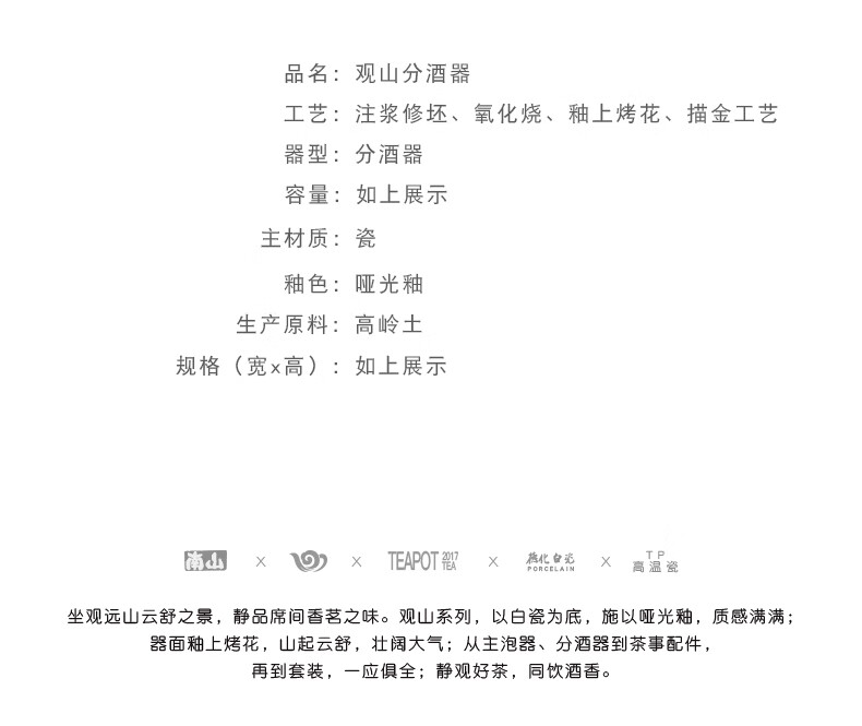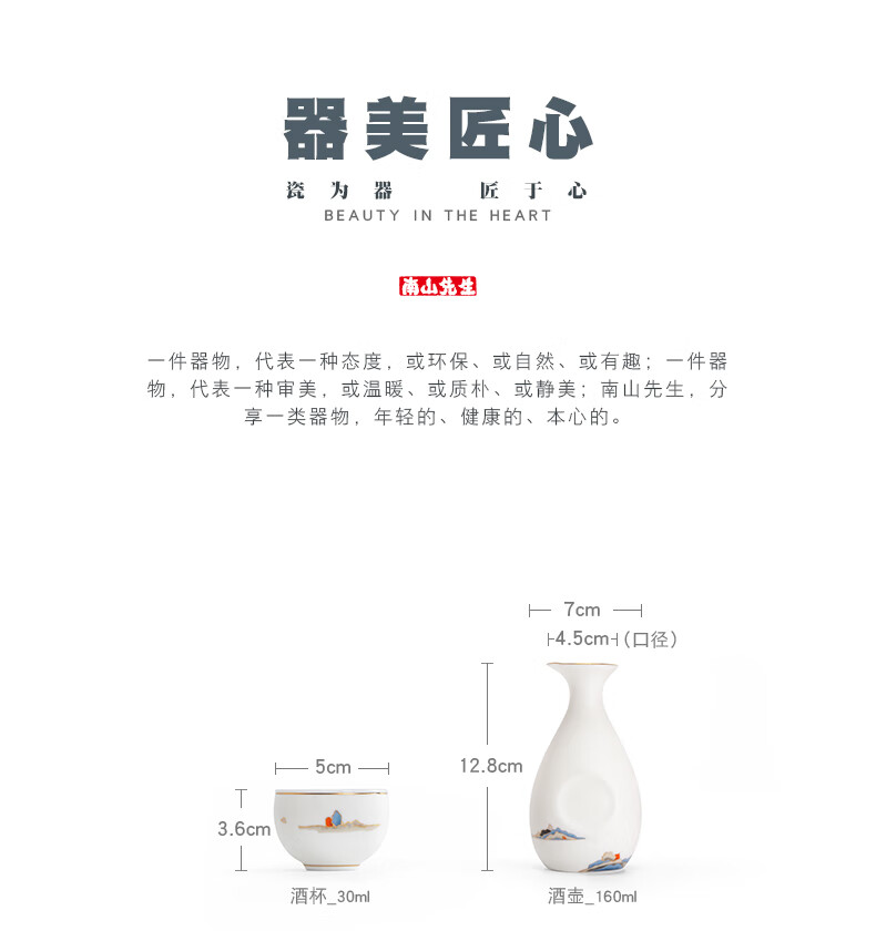 内壁施釉,不吸酒性,可装饮各类酒;内壁皆施透明釉,光滑润洁,不吸附味道;烤花工艺,鲜明立体;观山之景,辽阔大气