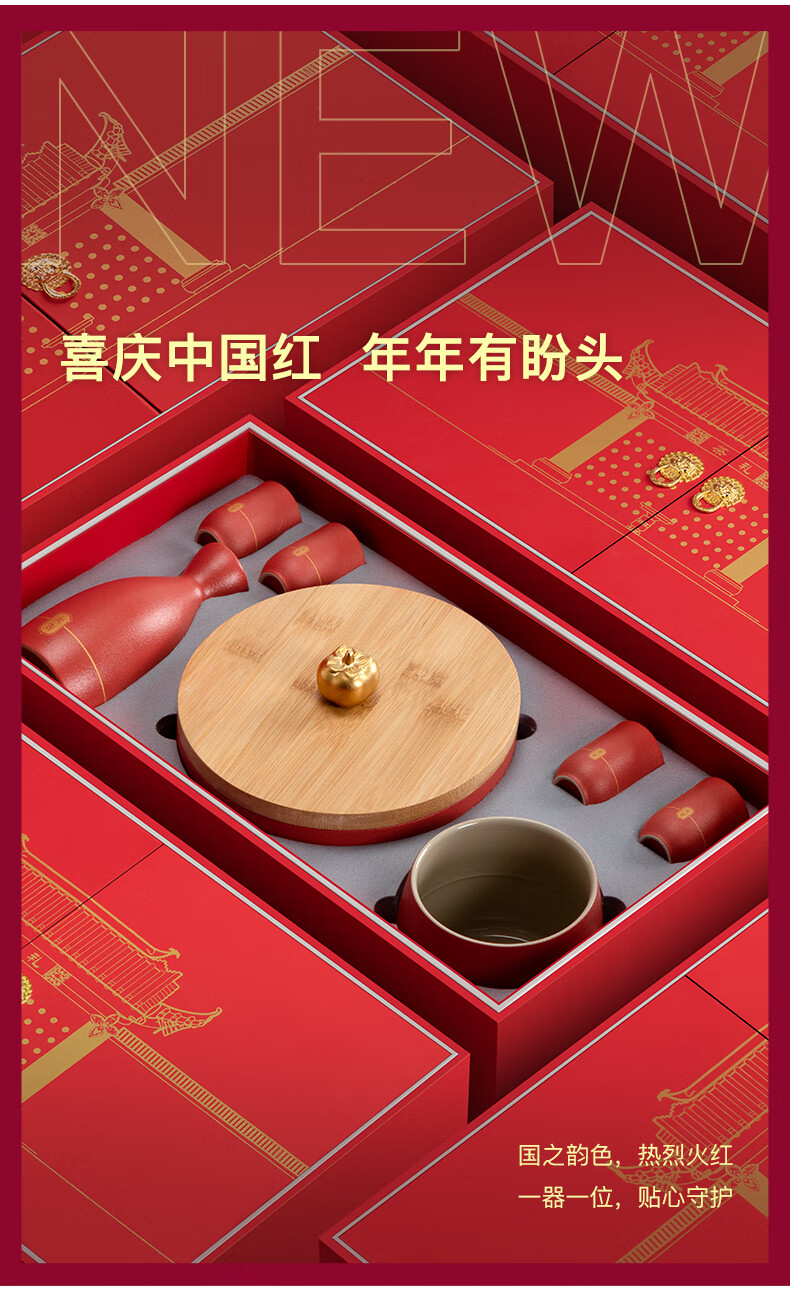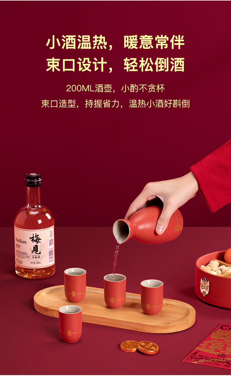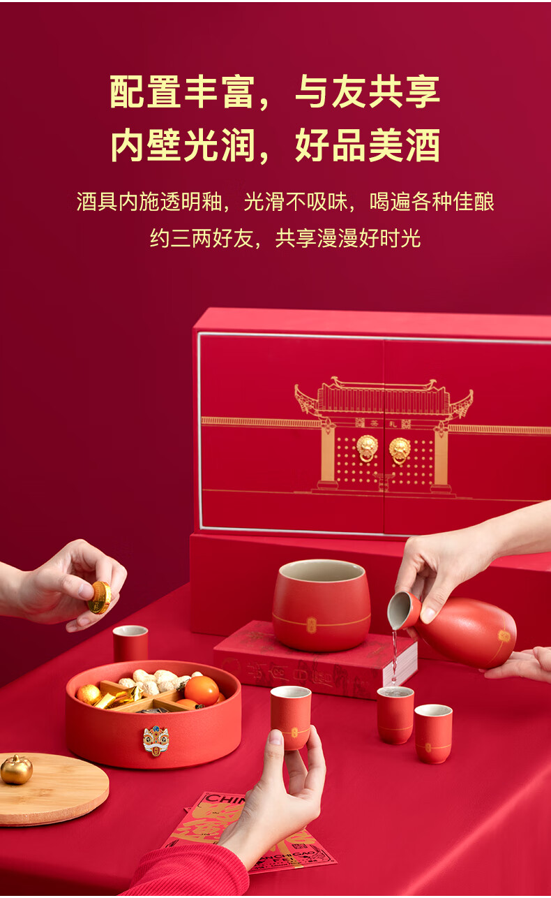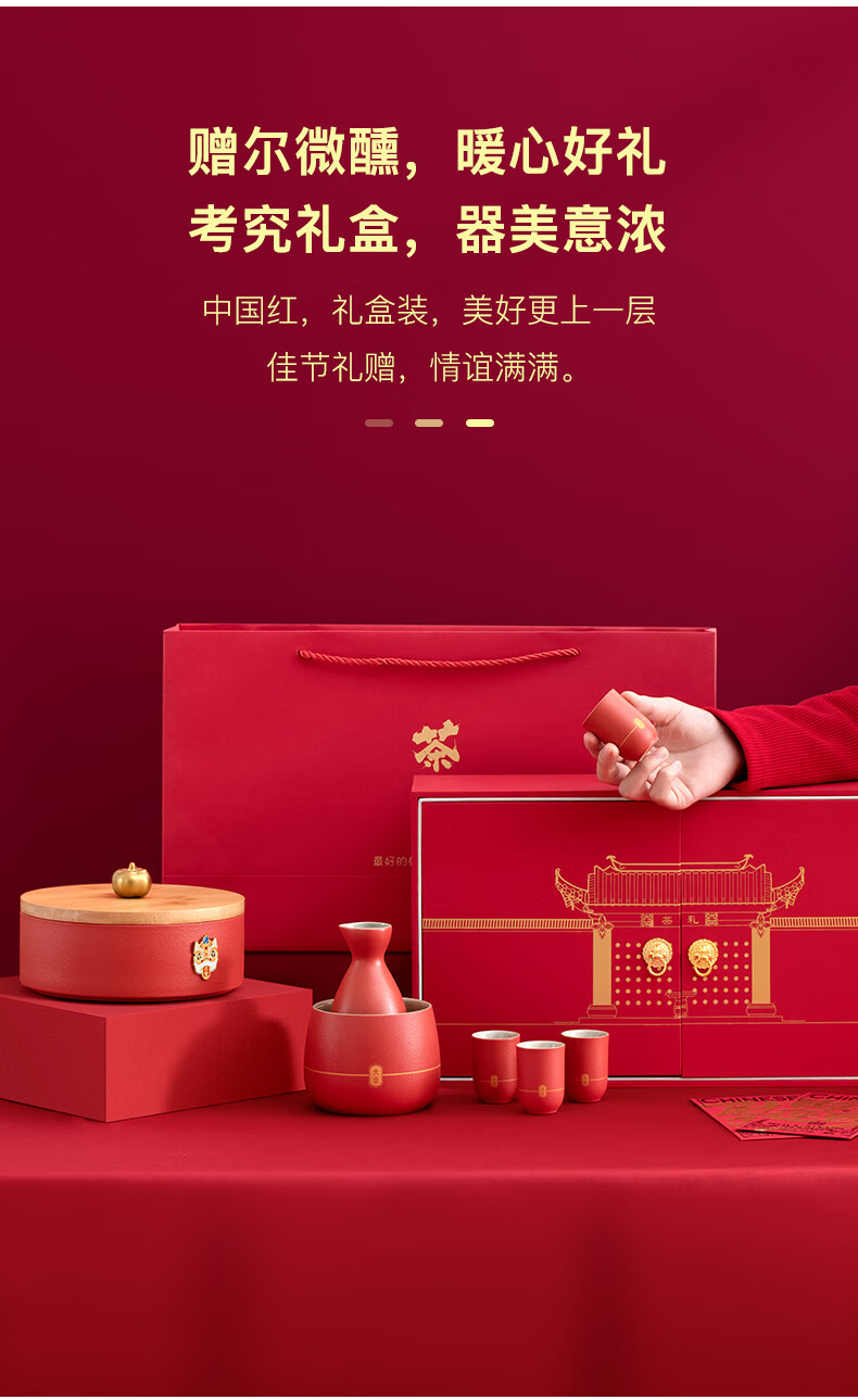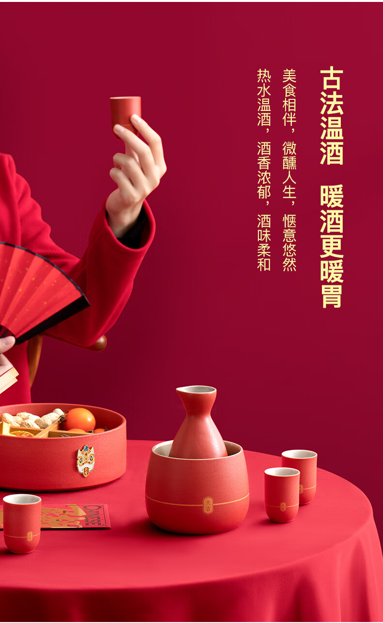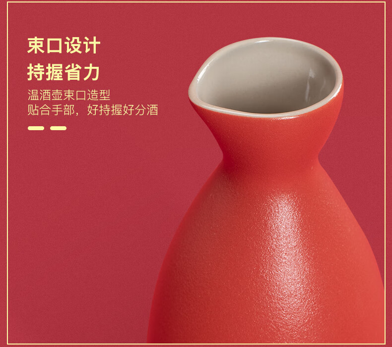 束口造型,持握省力,温热小酒好斟倒;酒具内施透明釉,光滑不吸味,喝遍各种佳酿;中国红,礼盒装,美好更上一层佳节礼赠,情谊满满。